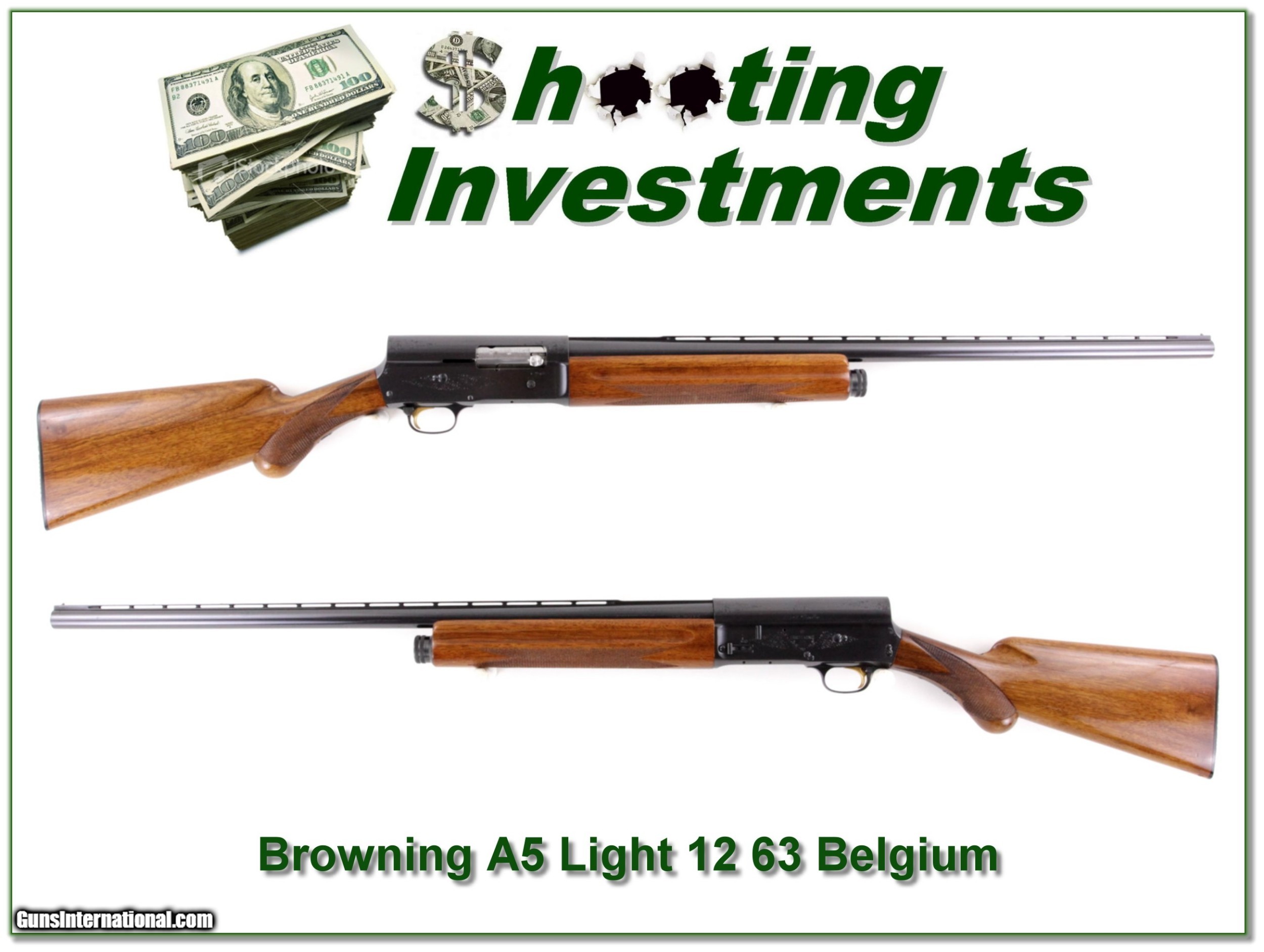 Description: This is an excellent condition Browning A5 Light 12. It was made in Belgium in 1963 and has a 28in Vent Rib Modified barrel. The blue has no edge wear and I see no gold trigger wear. The wood has only a few minor marks. It will make a classic hunting gun or fine addition to your collection! Shipping with insurance is $39. Please email me with any questions or larger pictures. (Consign your quality firearms with Shooting Investments for only 12%! Let me know if you have any you would like to sell!) 19-0006 Payment: Payment is by Money Order, Cashiers Check or Personal Check. I can now also accept Credit Cards (MasterCard, Visa, Discover & American Express) with a 3% convenience fee. PayPal can be used for some items but never for firearms. Shipping: The shipping charge will be listed in each description. It is $39 for most firearms. Some heavy guns or those insured for over $2000 will be higher. Shipments to Alaska and Hawaii are higher because air shipment is required. Most firearms are shipped on Tuesday and Thursday and usually in 5 days of receipt of payment. We package all shipments carefully and insure them. Optics are shipped Priority Mail and most other non-firearm shipments are shipped First Class. Returns: Our return policy is simple. If for any reason you are not pleased with your purchase, you may return your item for a full refund of purchase price. Ammunition cannot be returned. It is important to us that you are happy. Guns cannot be fired or dissembled before returning them and they must be returned in the same condition as received. Notification of a return must occur with-in 3 days of receipt at your dealer. Shipping, convenience and dealer fees are not refundable and are the responsibility of the buyer. Lay-a-way: If needed, we offer a 60 day lay-a-way option on most firearms. It is 1/3 now, 1/3 in 30 days and 1/3 in 60 days. Lay-a-way firearm sales are final and if not completed the first payment cannot be returned. Consigning your firearms with Shooting Investments: We will help you get top dollar for your firearms. While most local guns shops charge 20% or more, our fee is only 12% with a minimum of $75. At your local gun shop it might take months to sell. Selling on-line provides instant access to thousands of interested buyers. You won’t find any other on-line dealer willing to sell your firearms for only 12% or listing every gun on 3 separate s. Selling through an House typically costs the seller 15% and the buyer an addition 15% (so 30%) and you have to wait several months to sell and longer to receive funds. If properly priced, we will sell your firearms in a few weeks. Send us an email or give us a call and we’ll explain how easy it is for you to get top dollar. Trading: Trading for use is really just buying your gun to re-sell. If you have a gun you want to trade, please email a picture and we will let you know what we can give or it. You will always get more if we sell it for you on consignment. Help for California Buyers: We are happy to ship to California. It is the buyer’s responsibility to make sure any item you buy is legal in your state. We are also happy to help with your purchase of a firearm from someone other than us. If you see a gun you would like to buy but the seller can’t or won’t ship to California they can ship to use and we’ll then ship it to your California dealer. The cost for this service is only $30 + shipping. Let us know if we can help! SOLD |