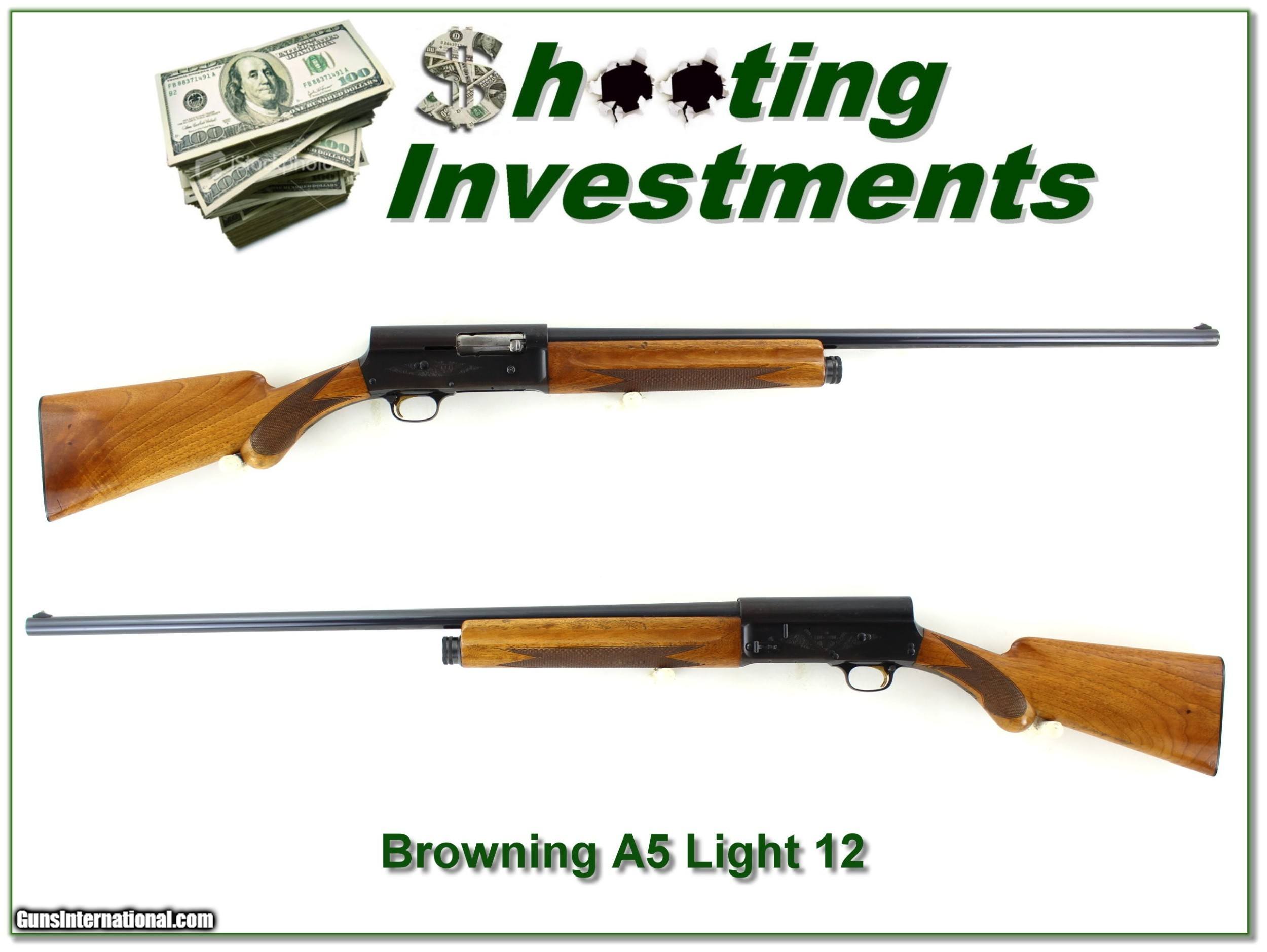 Description: This is a 1965 Belgium made Browning A5 Light 12. It is all original in very good used condition. The blue has some thinning under the receiver and tangs from use. The wood is very blond with outstanding grain. It is solid with scattered marks as seen. The barrel is a 30in full. It will make a classic hunting gun or because the wood is so nice worth of restoration back to new. Shipping and insurance is $39. Please email me with any questions or larger pictures. (Consign your quality firearms with Shooting Investments for only 12%! Let me know if you have any you would like to sell!) 21-1050 Payment: Payment is by Money Order, Cashiers Check or Personal Check. I can now also accept Credit Cards (MasterCard, Visa, Discover & American Express) with a 3% convenience fee. Shipping: The shipping charge will be listed in each description. It is $39 for most firearms. Some heavy guns or those insured for over $2000 will be higher. Shipments to Alaska and Hawaii are higher because air shipment is required. Most firearms are shipped on Tuesday and Thursday and usually in 5 days of receipt of payment. We package all shipments carefully and insure them. Optics are shipped Priority Mail and most other non-firearm shipments are shipped First Class. Returns: Our return policy is simple. If for any reason you are not pleased with your purchase, you may return your item for a full refund of purchase price. Ammunition cannot be returned. It is important to us that you are happy. Guns cannot be fired or dissembled before returning them and they must be returned in the same condition as received. Notification of a return must occur with-in 3 days of receipt at your dealer. Shipping, convenience and dealer fees are not refundable and are the responsibility of the buyer. Lay-a-way: If needed, we offer a 60 day lay-a-way option on most firearms. It is 1/3 now, 1/3 in 30 days and 1/3 in 60 days. Lay-a-way firearm sales are final and if not completed the first payment cannot be returned. Consigning your firearms with Shooting Investments: We will help you get top dollar for your firearms. While most local guns shops charge 20% or more, our fee is only 12% with a minimum of $75. At your local gun shop it might take months to sell. Selling on-line provides instant access to thousands of interested buyers. You won’t find any other on-line dealer willing to sell your firearms for only 12% or listing every gun on 3 separate s. Selling through an House typically costs the seller 15% and the buyer an addition 15% (so 30%) and you have to wait several months to sell and longer to receive funds. If properly priced, we will sell your firearms in a few weeks. Send us an email or give us a call and we’ll explain how easy it is for you to get top dollar. Trading: Trading for use is really just buying your gun to re-sell. If you have a gun you want to trade, please email a picture and we will let you know what we can give or it. You will always get more if we sell it for you on consignment. Help for California Buyers: We are happy to ship to California. It is the buyer’s responsibility to make sure any item you buy is legal in your state. We are also happy to help with your purchase of a firearm from someone other than us. If you see a gun you would like to buy but the seller can’t or won’t ship to California they can ship to use and we’ll then ship it to your California dealer. The cost for this service is only $30 + shipping. Let us know if we can help! SOLD |
