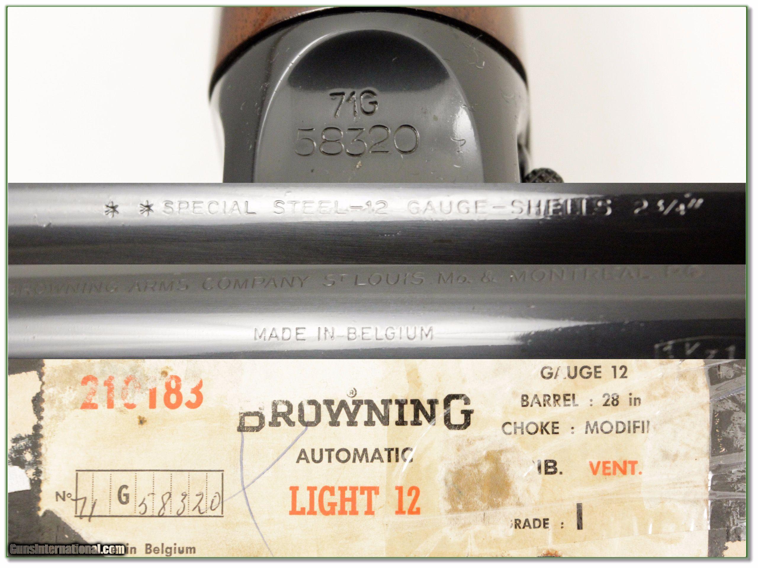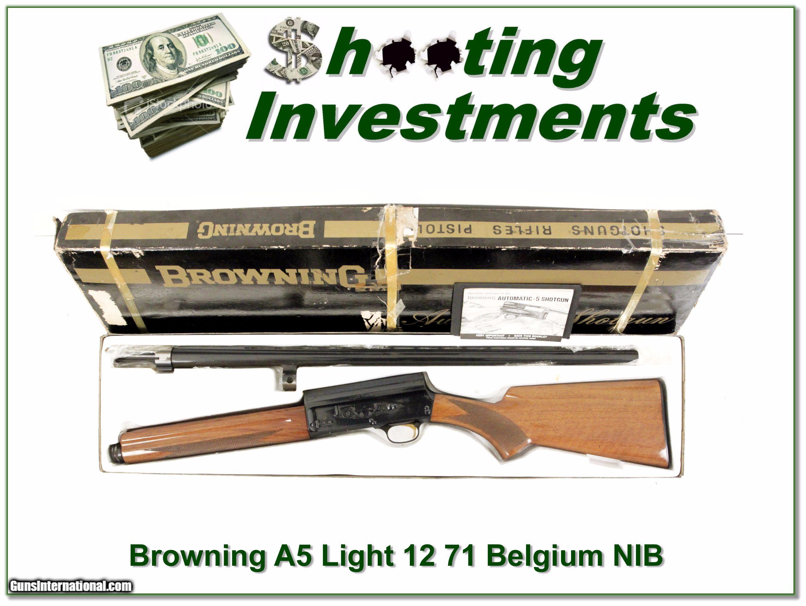 Description: Collectors, this Browning A5 Light 12 was made in Belgium in 1971. It is unfired and I expect never assembled. It comes as seen in original box with manual. It has no marks however the box does have old tape on it. The barrel is a 28in Vent Rib modified. It will make a prized addition to your collection! Shipping and insurance is $49. Please email me with any questions or larger pictures. (Consign your quality firearms with Shooting Investments for only 10%! Let me know if you have any you would like to sell!) 17-1215 Payment: Payment is by Money Order, Cashiers Check or Personal Check. I can now also accept MasterCard and Visa with a 3% convenience fee. PayPal can be used for some items but never firearms. Please let us know if you would like to pay via PayPal. Shipping: The shipping charge will be listed in each description. It is $39 for most long guns and $29 for most handguns. Some heavy guns or those insured for over $2000 will be higher. Shipments to Alaska and Hawaii are higher because air shipment is required. Most firearms are shipped on Tuesday and Thursday and usually in 5 days of receipt of payment. We package all shipments carefully and insure them. For long guns you can purchase a new Plano case for $19. They now cost us $22 when buying 100 at a time. Optics are shipped Priority Mail and most other non-firearm shipments are shipped First Class. Returns: Our return policy is simple. If for any reason you are not pleased with your purchase, you may return your item for a full refund of purchase price. Ammunition cannot be returned. It is important to us that you are happy. Guns cannot be fired or dissembled before returning them and they must be returned in the same condition as received. Notification of a return must occur with-in 3 days of receipt at your dealer. Shipping, convenience and dealer fees are not refundable and are the responsibility of the buyer. Lay-a-way: If needed, we offer a 60 day lay-a-way option on most firearms. It is 1/3 now, 1/3 in 30 days and 1/3 in 60 days. Lay-a-way firearm sales are final and if not completed the first payment cannot be returned. Consigning your firearms with Shooting Investments: We will help you get top dollar for your firearms. While most local guns shops charge 20% or more, our fee is only 10% with a minimum of $75. At your local gun shop it might take months to sell. Selling on-line provides instant access to thousands of interested buyers. You won’t find any other on-line dealer willing to sell your firearms for only 10% or listing every gun on 3 separate s. Selling through an House typically costs the seller 15% and the buyer an addition 15% (so 30%) and you have to wait several months to sell and longer to receive funds. If properly priced, we will sell your firearms in a few weeks. Send us an email or give us a call and we’ll explain how easy it is for you to get top dollar. Trading: Trading for use is really just buying your gun to re-sell. If you have a gun you want to trade, please email a picture and we will let you know what we can give or it. You will always get more if we sell it for you on consignment. Help for California Buyers: We are happy to ship to California. It is the buyer’s responsibility to make sure any item you buy is legal in your state. We are also happy to help with your purchase of a firearm from someone other than us. If you see a gun you would like to buy but the seller can’t or won’t ship to California they can ship to use and we’ll then ship it to your California dealer. The cost for this service is only $30 + shipping. Let us know if we can help! SOLD |