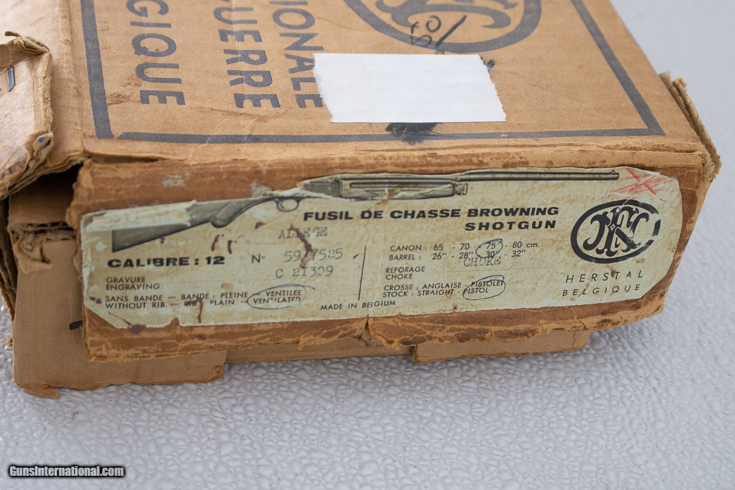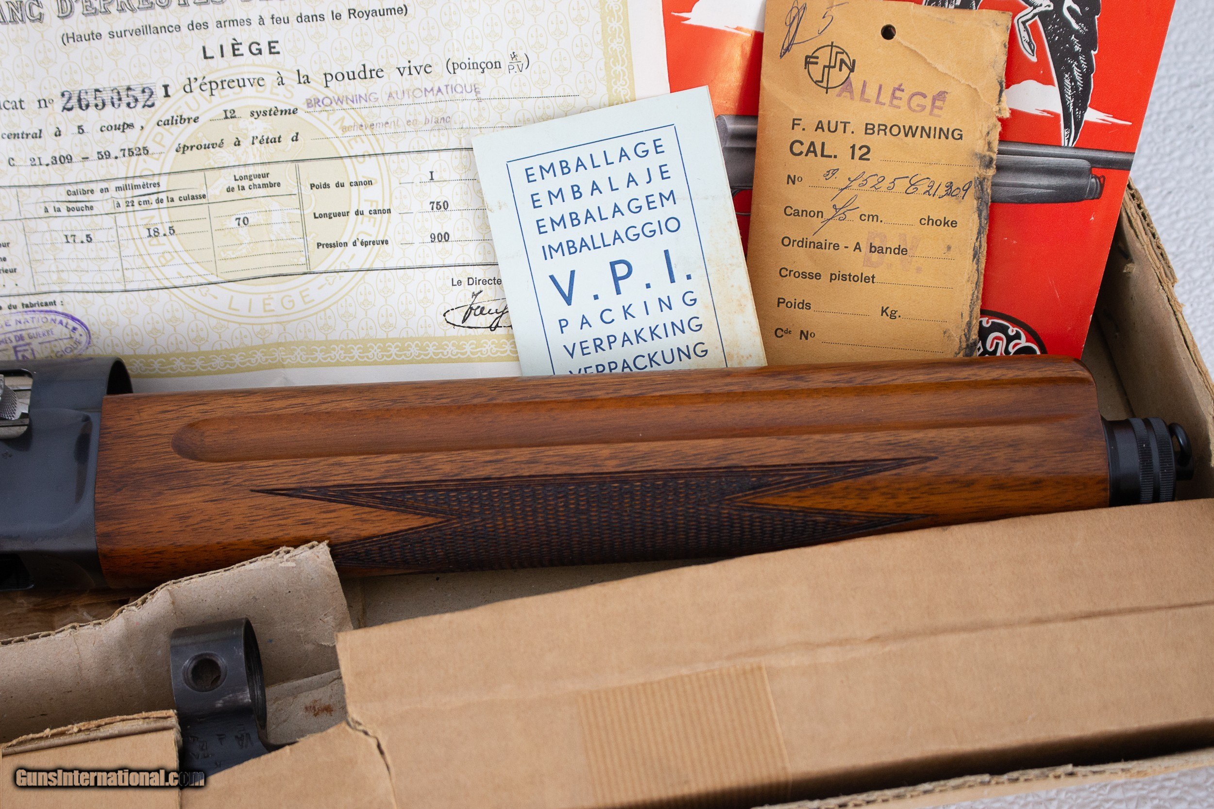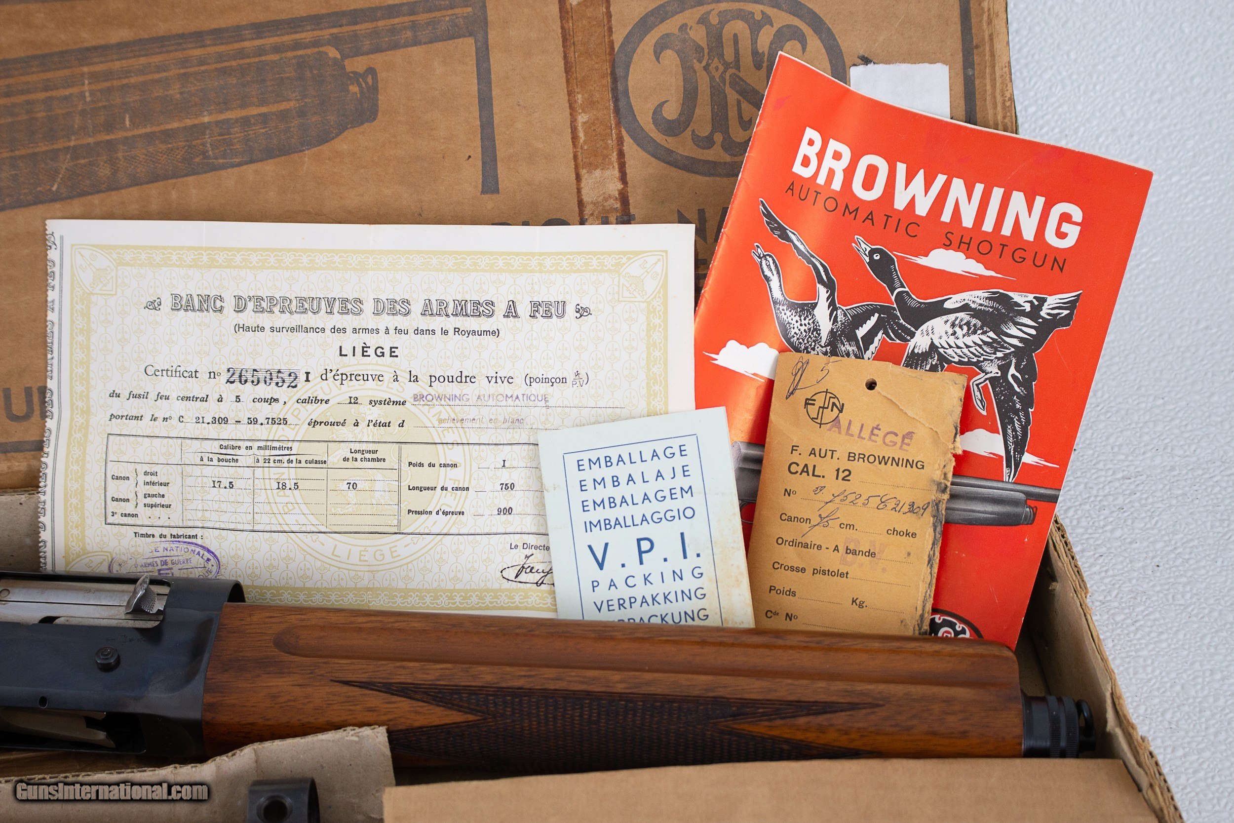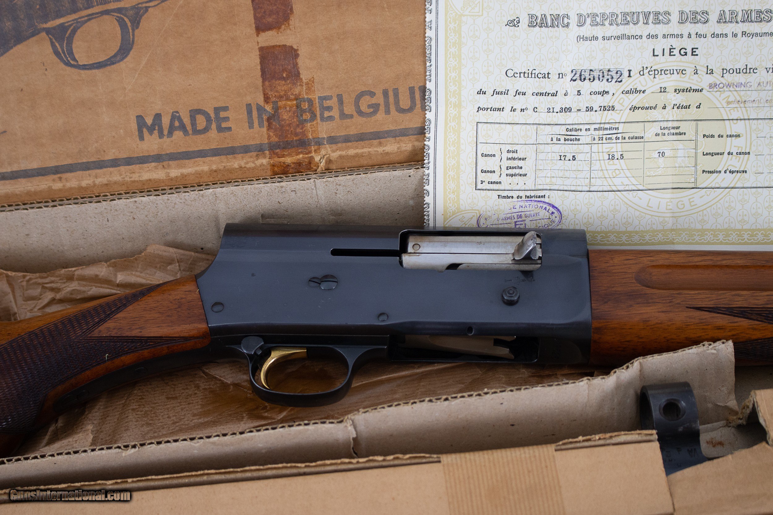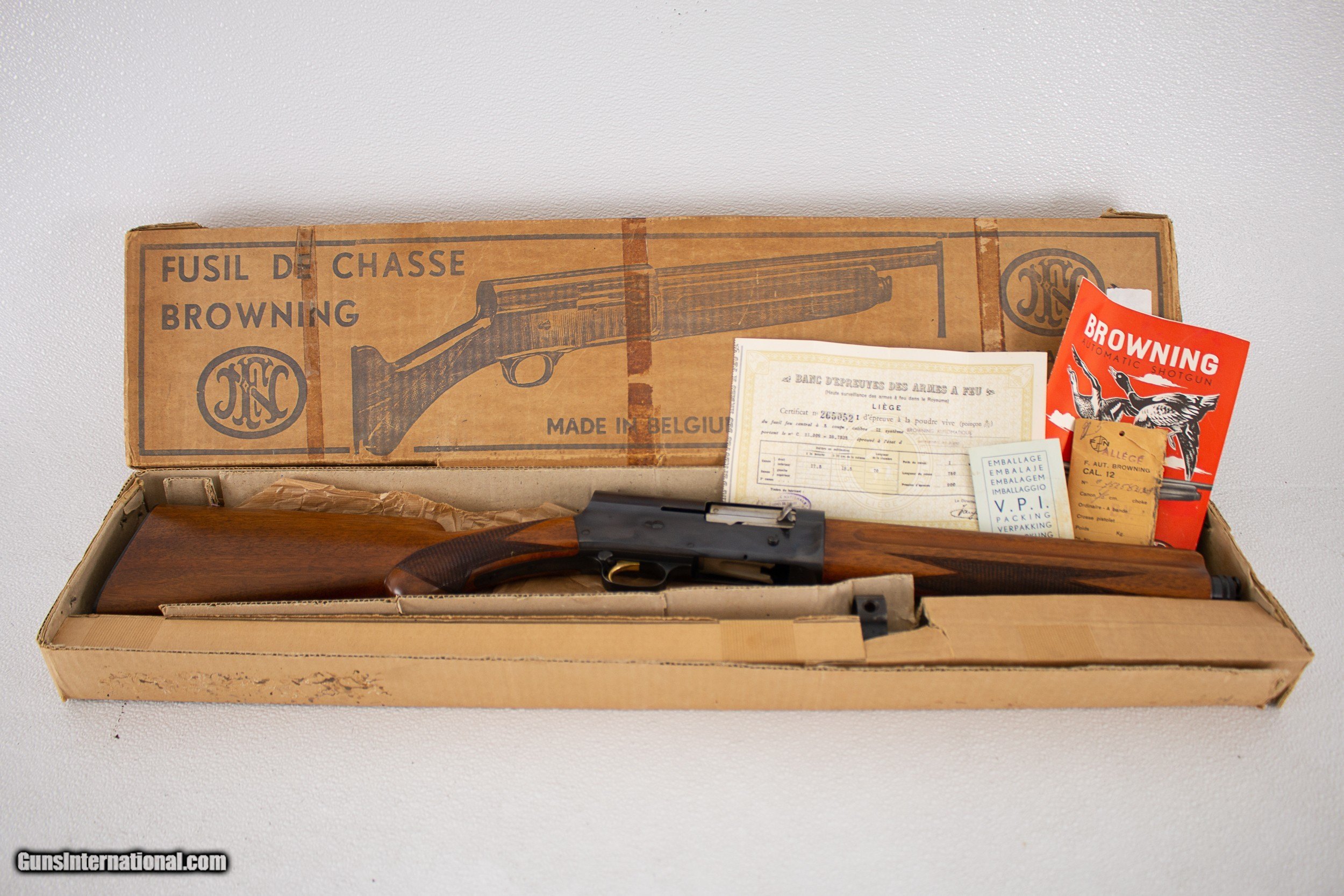Description: MADE IN BELGIUM IN 1959. BARREL IS 30'' WITH A VENT RIB AND CHOKED FULL. INCLUDES FACTORY BOX AND PAPERWORK. 99% AND ALL FACTORY. DON'T LET THIS GET AWAY. PLEASE ADD $75 FOR SHIPPING. SOLD Curio/Relic: Yes Shotgun Gauge: 12 Gauge Manufacturer: BROWNING Model: AUTO 5 Condition: EXCELLENT Metal Condition: EXCELLENT Wood Condition: EXCELLENT Bore Condition: EXCELLENT Triggers: SINGLE/GOLD LOP: 14 1/4'' Extras: BOOKLET Case: FACTORY BOX |
