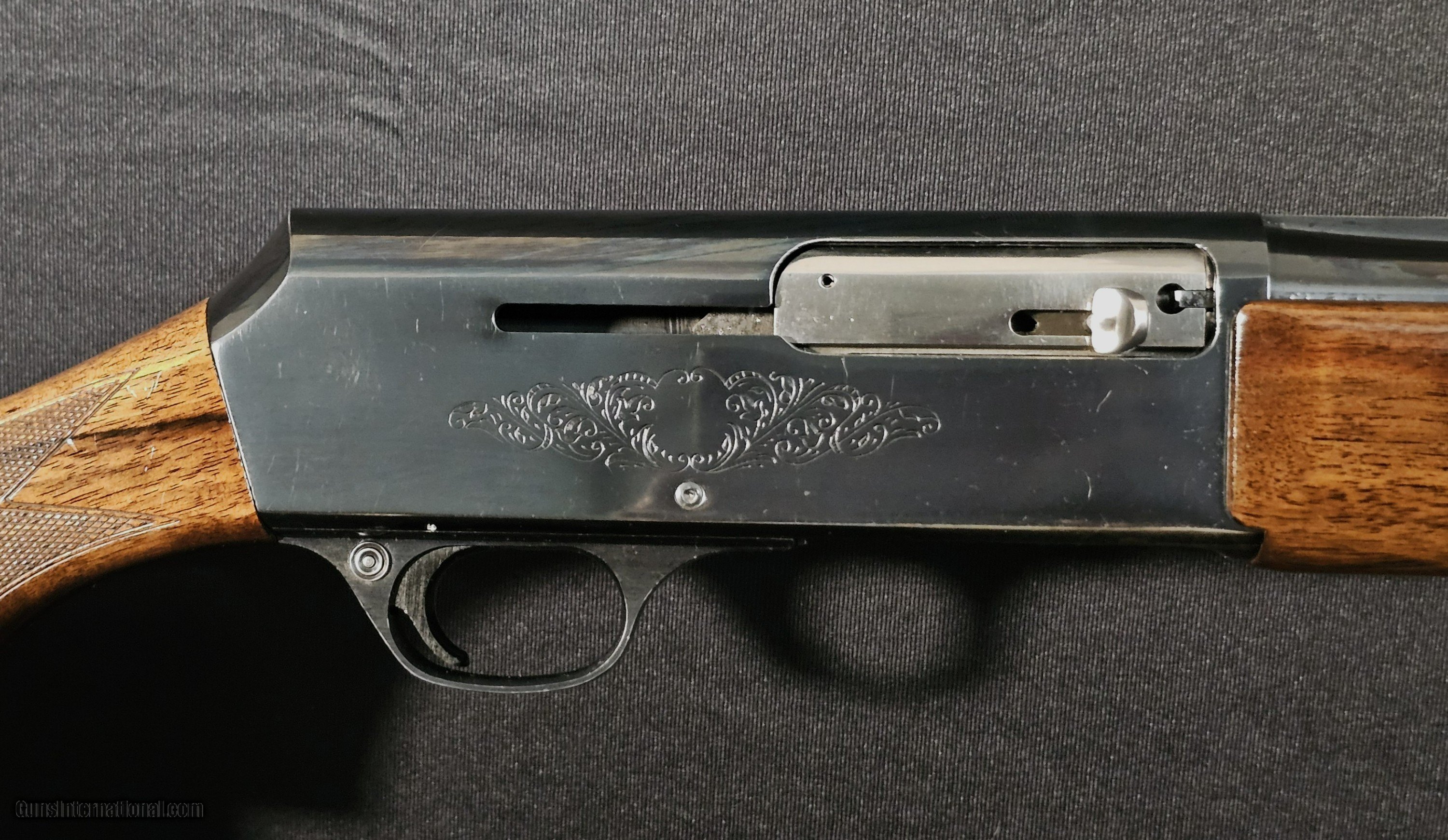 Description: The Browning B-2000 is a semi-automatic 20-gauge shotgun manufactured in Belgium. It features a 26-inch barrel fitted with a vent rib, providing a smooth sighting plane along the top of the barrel. The shotgun uses Browning’s gas-operated action system designed for reliable cycling of 20-gauge shells. The receiver and barrel retain the factory finish, and the overall configuration reflects Browning’s standard sporting layout from the mid-1970s production period. The barrel is choked improved cylinder, suitable for general field and upland shooting patterns. The length of pull measures approximately 14.25 inches, giving the shotgun a balanced fit between the buttstock and trigger. Overall weight is listed at about 6 pounds 6 ounces, contributing to manageable handling for a 20-gauge semi-automatic. The wood stock and forend are finished in Browning’s traditional style consistent with Belgian manufacture, and the vent rib barrel is equipped with a front bead sight. Factory configuration includes the original stock dimensions and choke designation. No aftermarket modifications or accessories are indicated. Terms and Conditions: