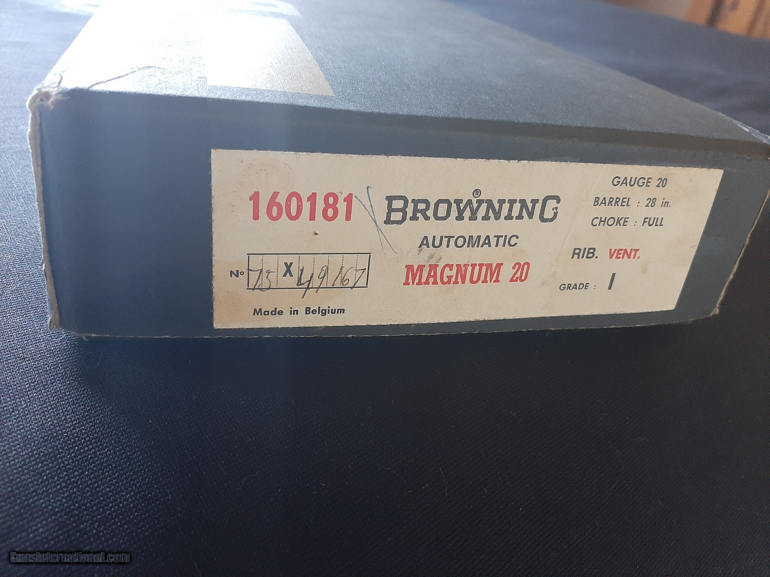Description: (SOLD PENDING FUNDS)Browning Belgium A5 20 Mag that is NIB with Paperwork. Comes with 28" vent rib Barrel full choke. Great tiger striped Wood. Credit Cards add 3%. Shipping and Insurance is 60.00. (SOLD PENDING FUNDS) SOLD |