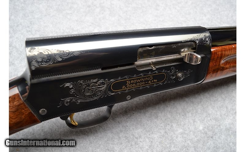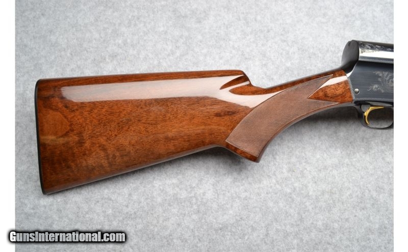Description: This is a Belgian- made Browning Auto-5 Light Twelve Commemorative Edition, No. 2174 of 2 Million, with original case. The high-lustre bluing is deep and rich, classic Browning, with scroll engravings. The left receiver flat features gold inlay of "John M. Browning" script signature. The original hard case is a three-latch with handle, riveted logo plate and original commemorative booklet. The shotgun appears unfired. Condition: Metal is excellent, one small scratch on the left side of the barrel near the muzzle; Wood is excellent, no chips or cracks, but does show one obvious scratch in the finger-groove of the right forestock.The "FN" buttplate is excellent, no cracks or chips. SOLD Manufacturer: S/N 2174 (series mfg. 1971-1974) Caliber Info: 12 Gauge Chambers: 2 3/4 Metal Condition: Excellent Wood Condition: Excellent Bore Condition: Clean Barrels: Factory, 28 inch, Vent Rib Triggers: Factory gold trigger Stock: Factory, special walnut, checkered Stock Dimensions: LOP 14 3/8"; DAC 1 7/8"; DAH 3 Fore End: Factory, special walnut, checkered Butt Pad: Factory, Browning "FN" hard black plastic Weight: 7 lb 15 oz Sights: Factory Vent Rib with front white plastic bead Chokes: IM Extras: Original Factory Case, lined, pebbled naugahyde with Commemorative Booklet Item Location: Greenville, SC |