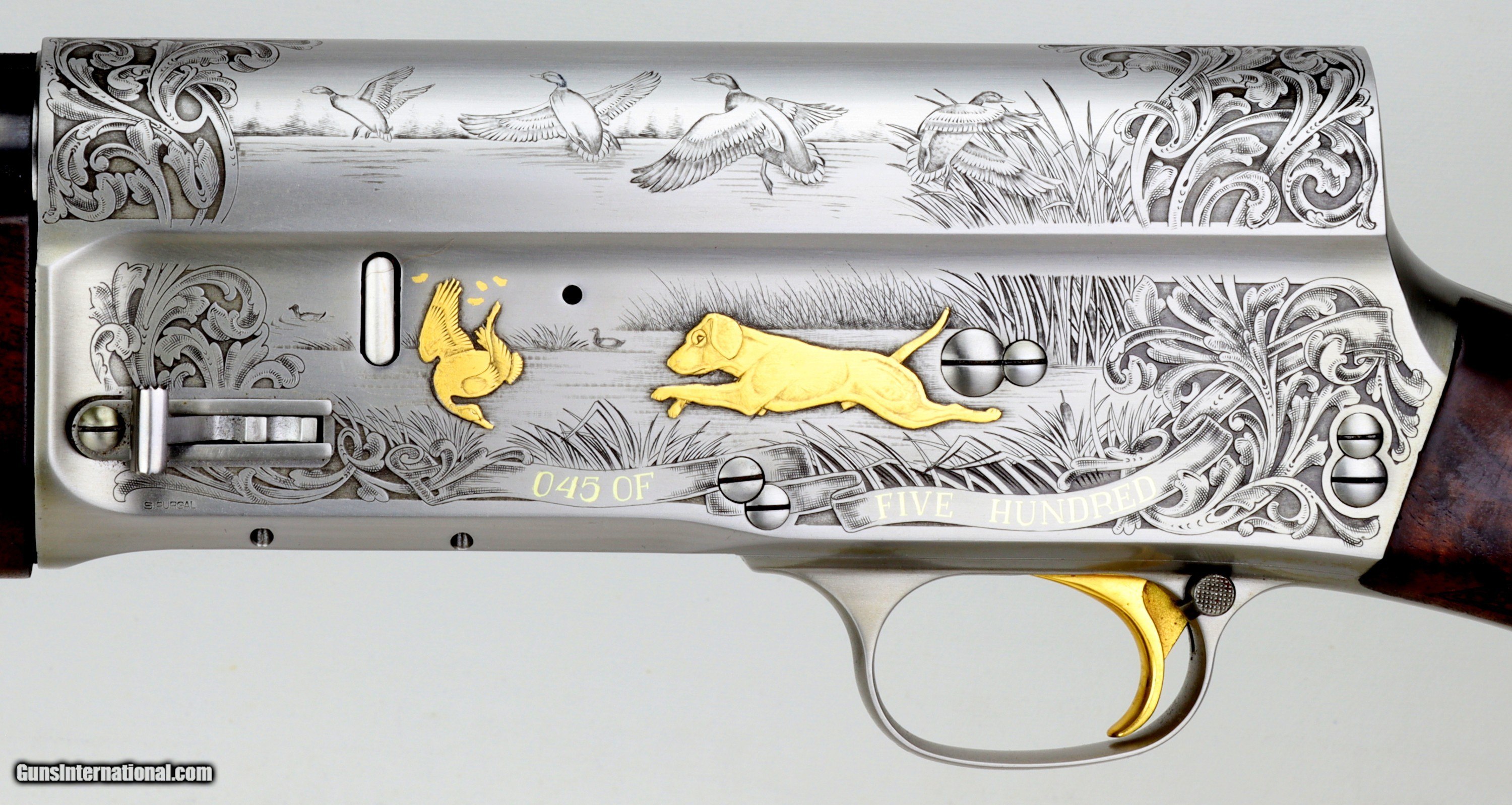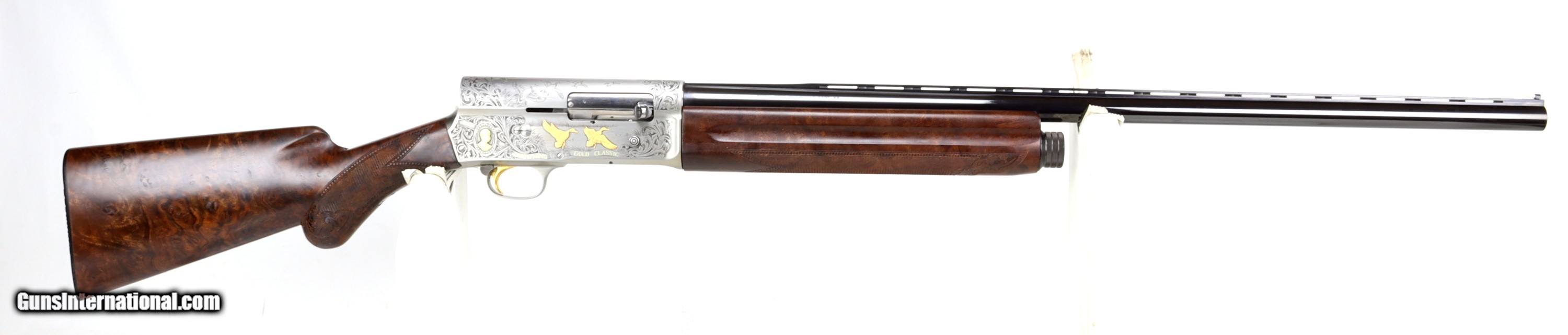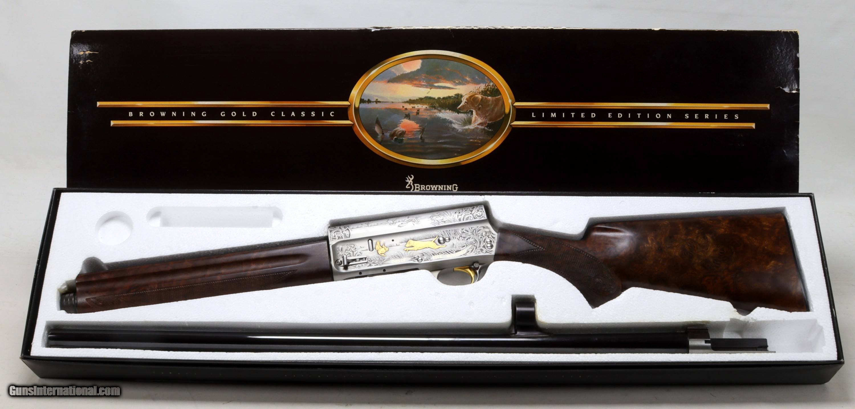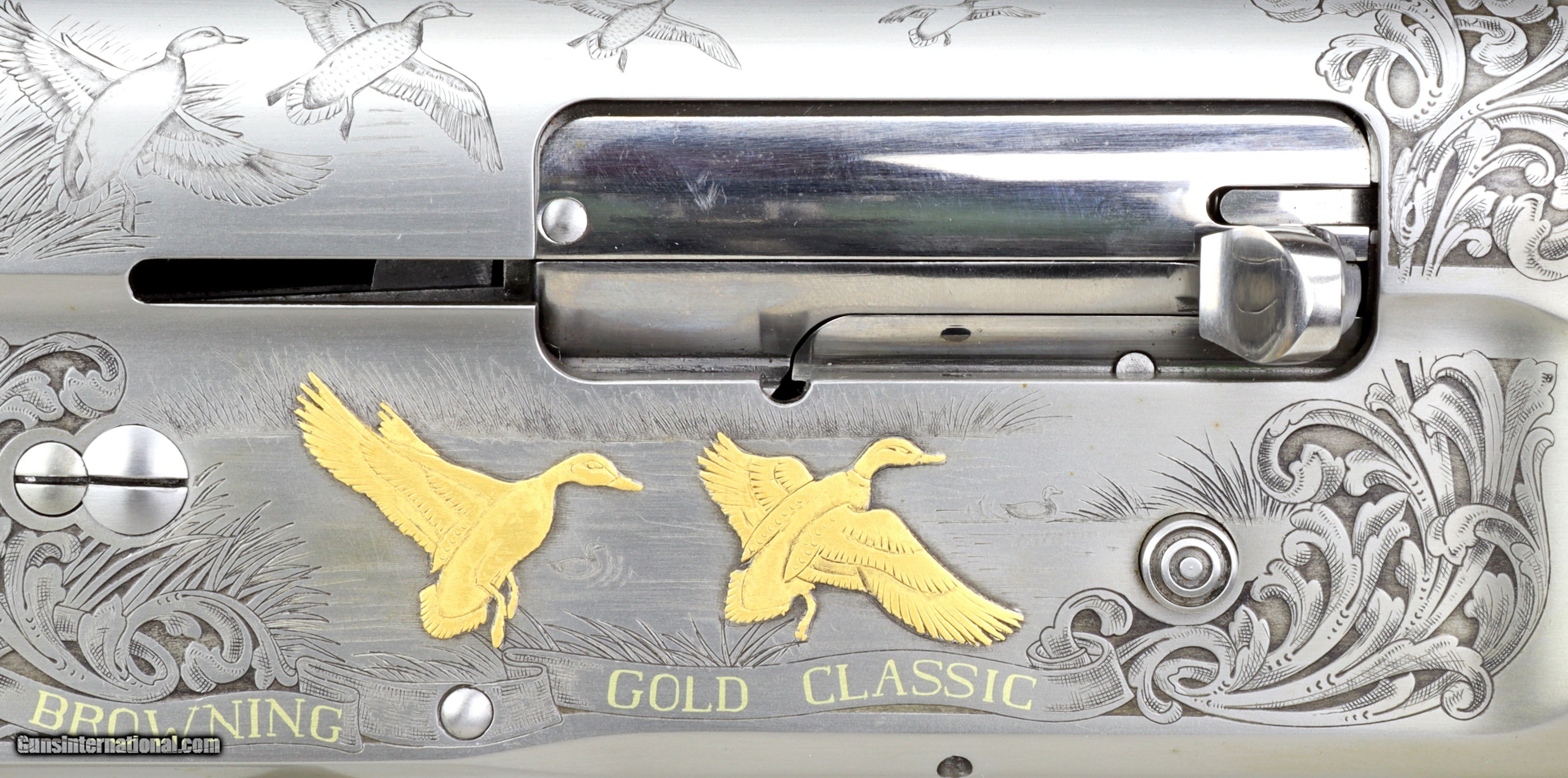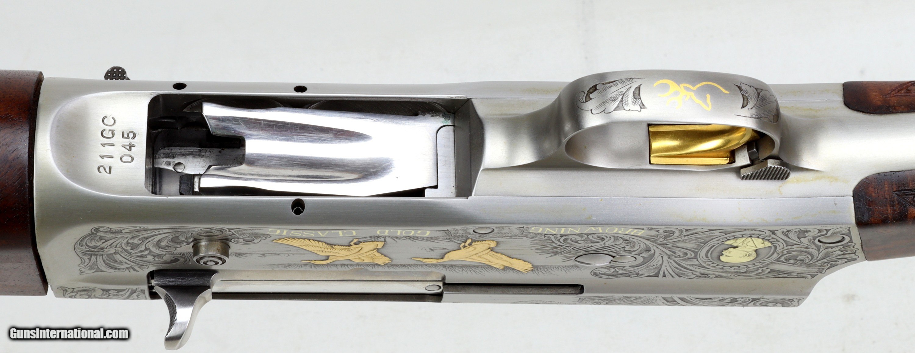 Description: BROWNING A-5, GOLD CLASSIC, 045 OF 500, SN#211GC0045, MFG: 1985, 12GA, Modified Choke, 28" VR Barrel. "BELGIUM MADE", "EXTREMELY RARE". Beautiful Coin Finish Action, Engraved with Large Open, Shaded Scroll & Flocks of Ducks, Gold Inlay Hunting Scenes, Beautiful Backgrounds, "045 of FIVE HUNDRED, Engravers Signiture: S. Purgal, Left Side. Beautiful Pair of Gold Inlaid Flushing Mallards over "BROWNING GOLD CLASSIC", in Ribbon and a Portrait of John M. Browning is in oval Frame, Signiture of Engraver: "Odel Feuw", under Portrait. Exceptional Figured Burl Walnut, Carved Bead Borders, Beautiful Checkering, W/Flourishes of Scrolled Acanthus, W/Stippled Background. Gun comes in Original Black Browning Box, w/Black outer Cover. Original Cardboard Shipping box. LOP: 14 1/2", DAC: 1 5/8" DAH: 2 1/2". Weight: 8lbs, 1.6ozs. (It is Estimated that only 350 of the Originally Planned 500 were ever made" Ships to buyer: Actual Cost of Insured Shipping. Sold to ARK Buyer Pending Receipt of Funds SOLD |