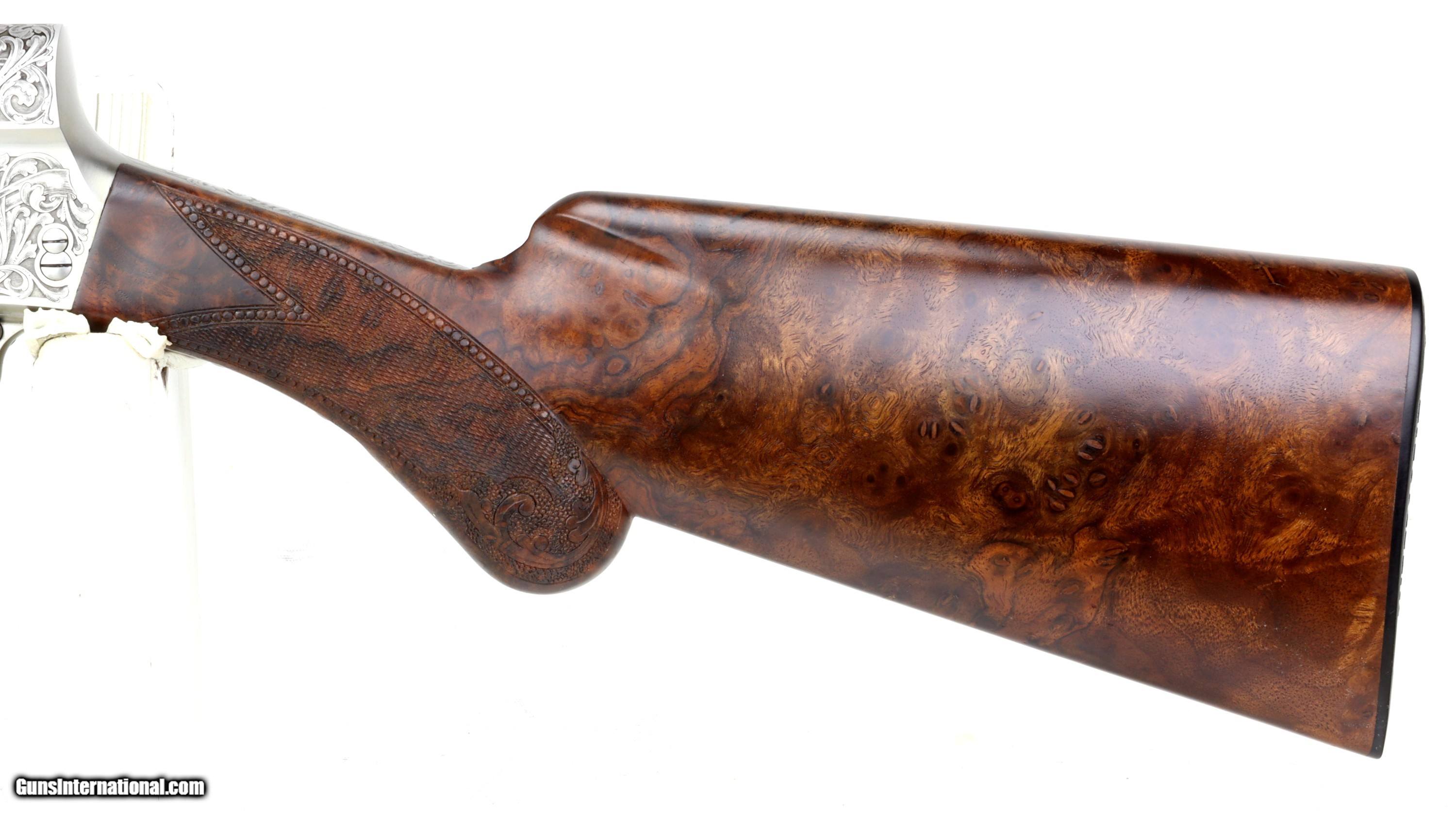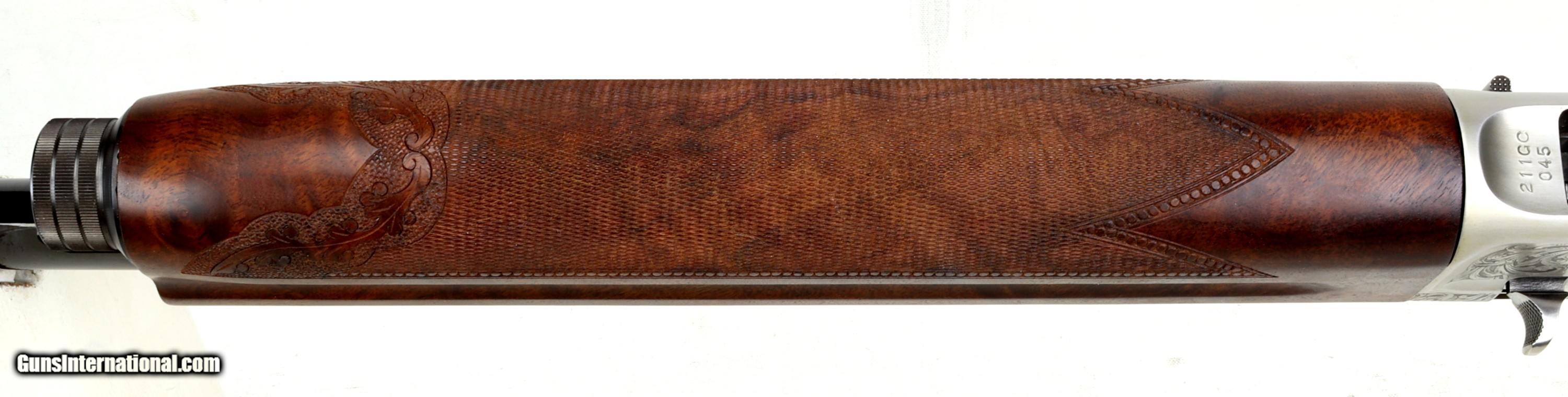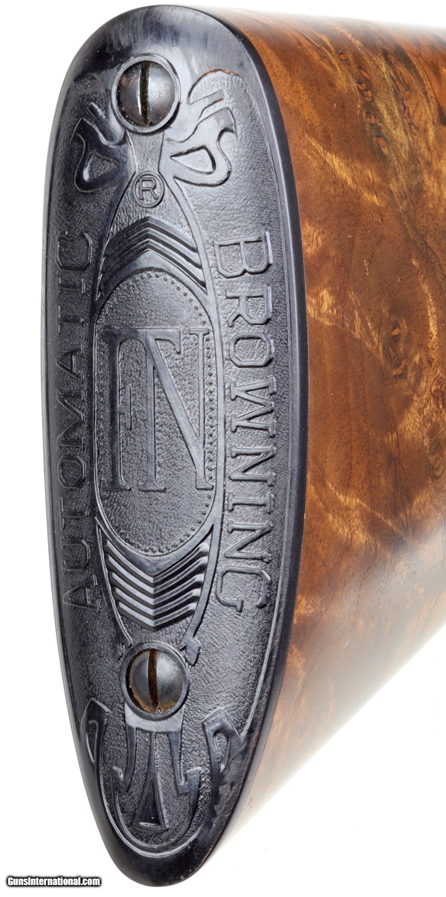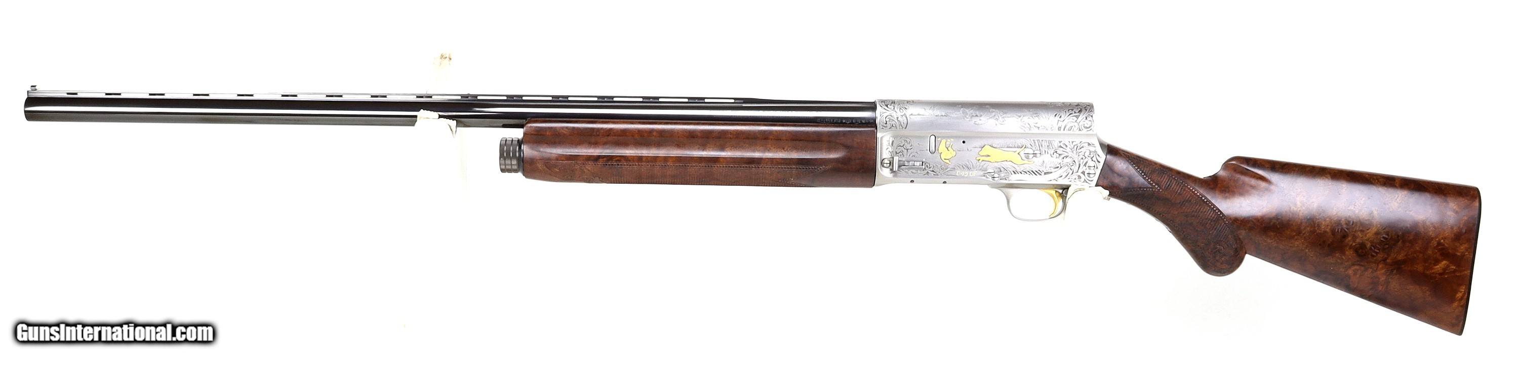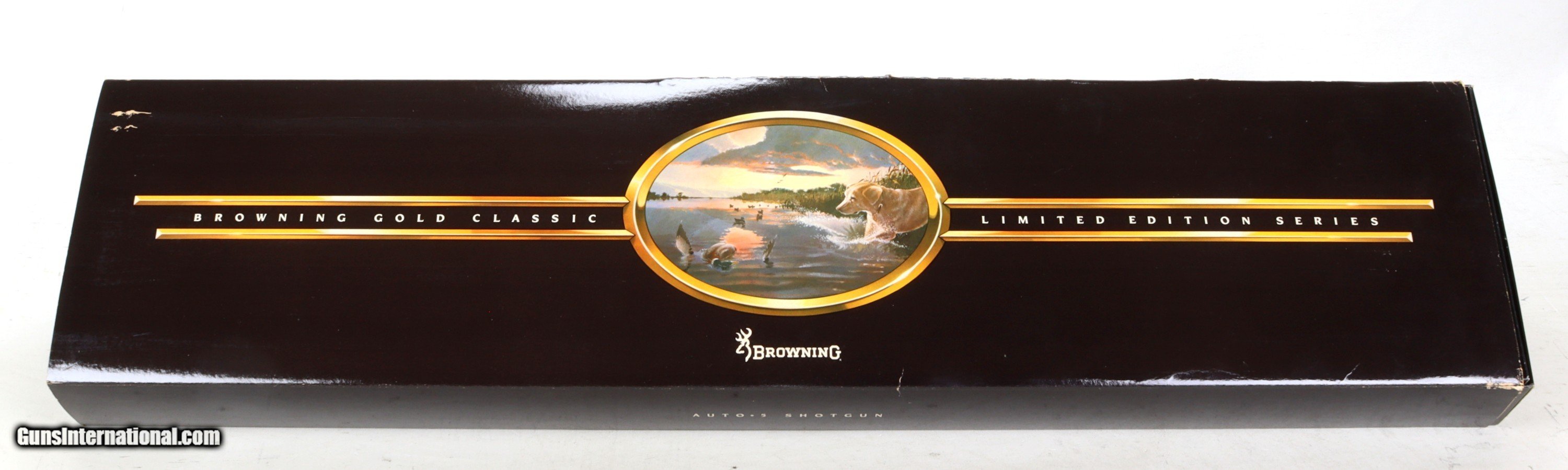 Description: BROWNING A-5, GOLD CLASSIC, 045 OF 500, SN#211GC0045, MFG: 1985, 12GA, Modified Choke, 28" VR Barrel. "BELGIUM MADE", "EXTREMELY RARE". Beautiful Coin Finish Action, Engraved with Large Open, Shaded Scroll & Flocks of Ducks, Gold Inlay Hunting Scenes, Beautiful Backgrounds, "045 of FIVE HUNDRED, Engravers Signiture: S. Purgal, Left Side. Beautiful Pair of Gold Inlaid Flushing Mallards over "BROWNING GOLD CLASSIC", in Ribbon and a Portrait of John M. Browning is in oval Frame, Signiture of Engraver: "Odel Feuw", under Portrait. Exceptional Figured Burl Walnut, Carved Bead Borders, Beautiful Checkering, W/Flourishes of Scrolled Acanthus, W/Stippled Background. Gun comes in Original Black Browning Box, w/Black outer Cover. Original Cardboard Shipping box. LOP: 14 1/2", DAC: 1 5/8" DAH: 2 1/2". Weight: 8lbs, 1.6ozs. (It is Estimated that only 350 of the Originally Planned 500 were ever made" Ships to buyer: Actual Cost of Insured Shipping. Sold to ARK Buyer Pending Receipt of Funds SOLD |