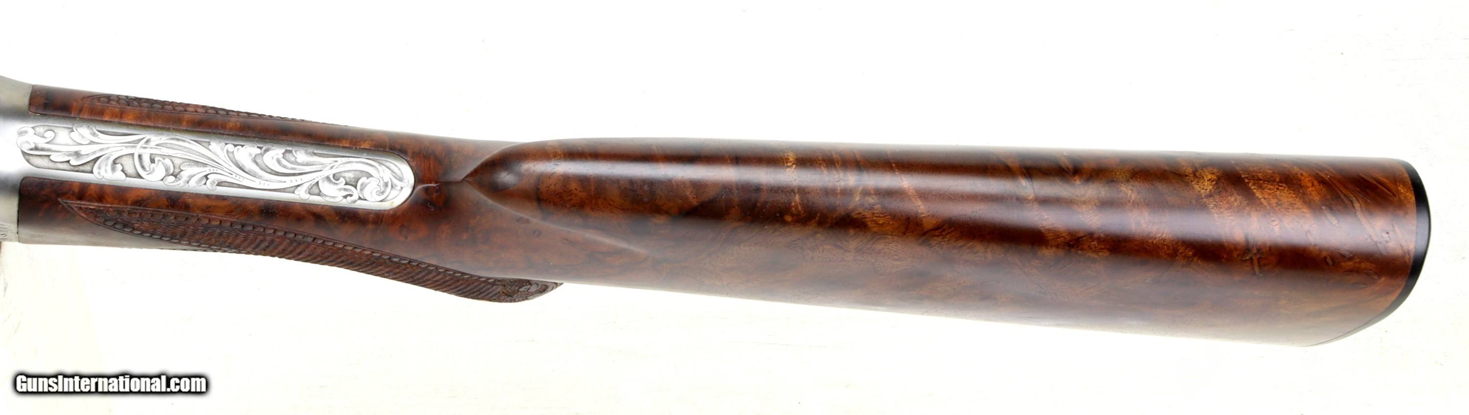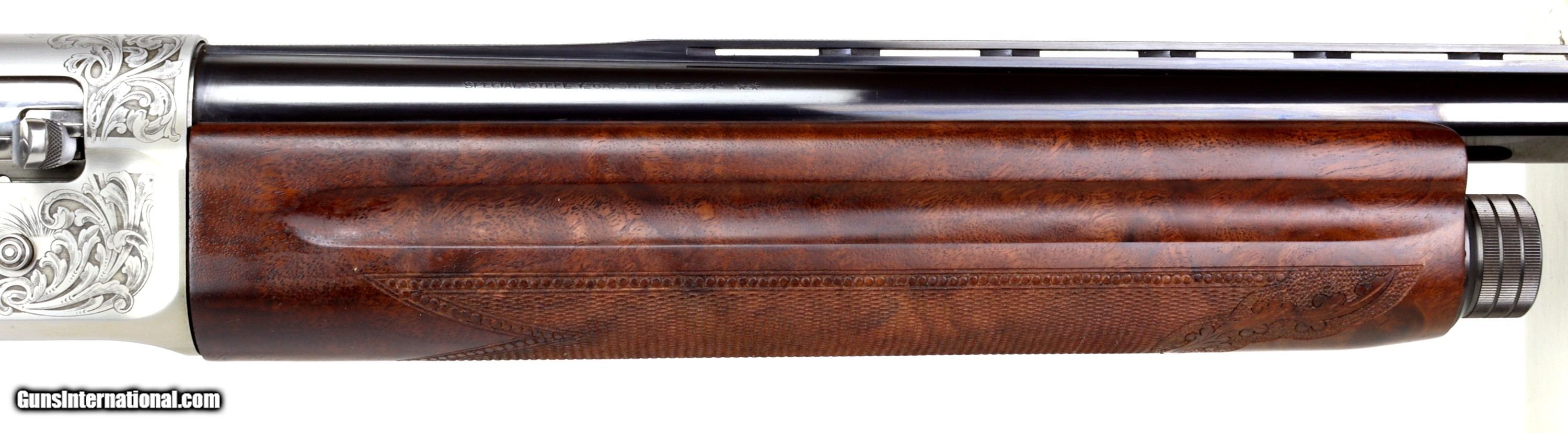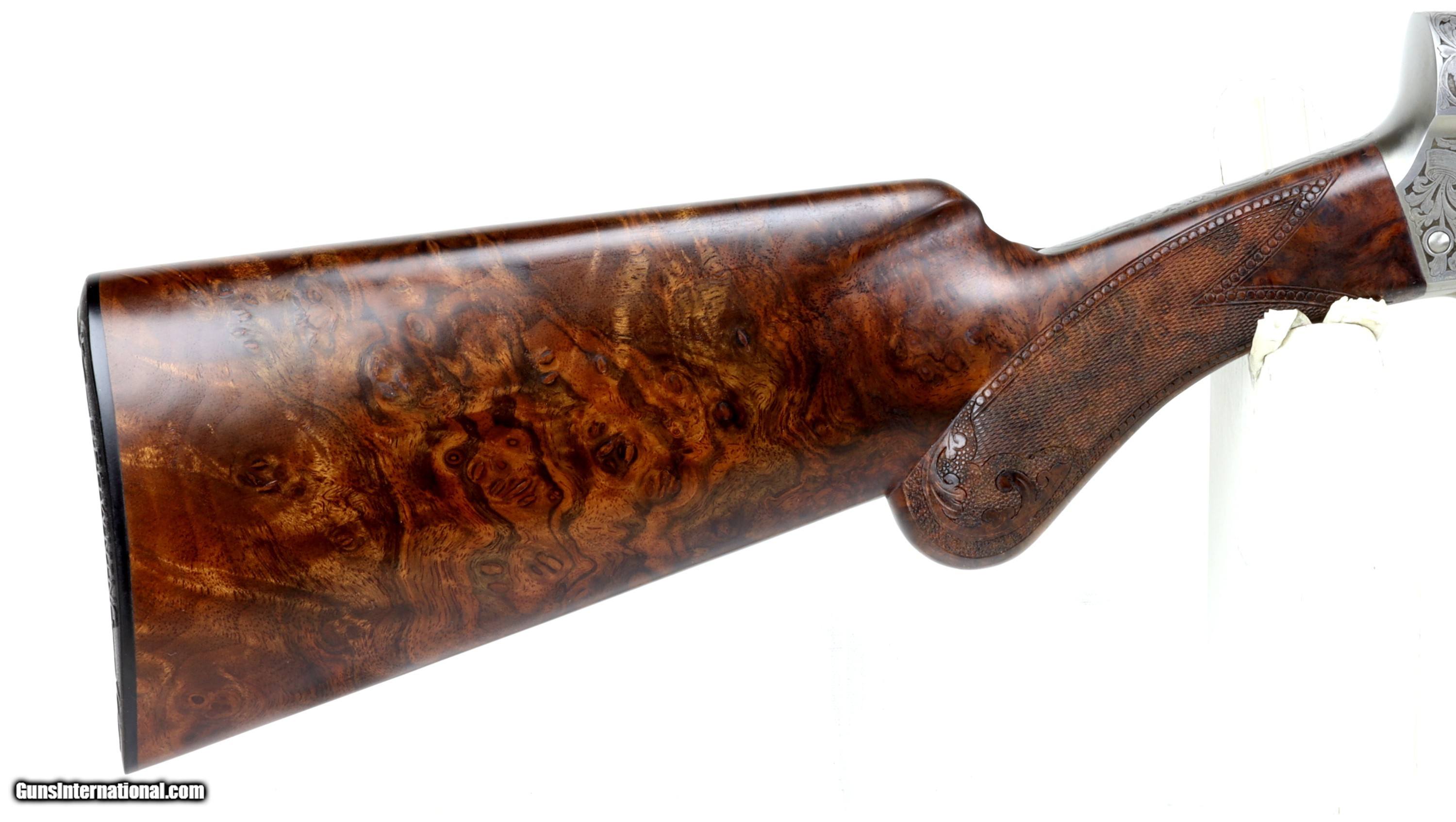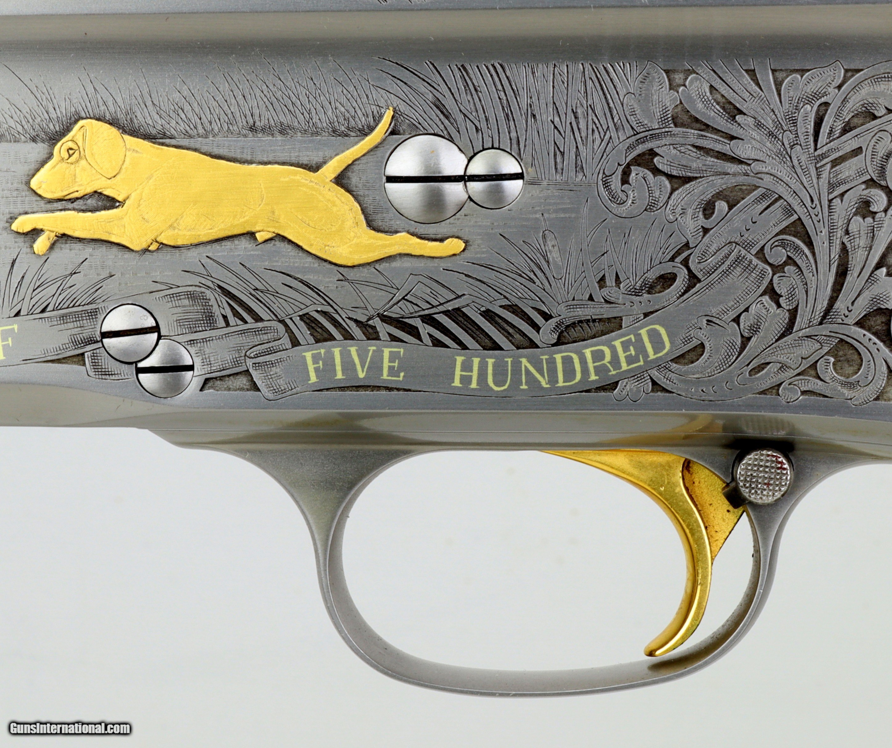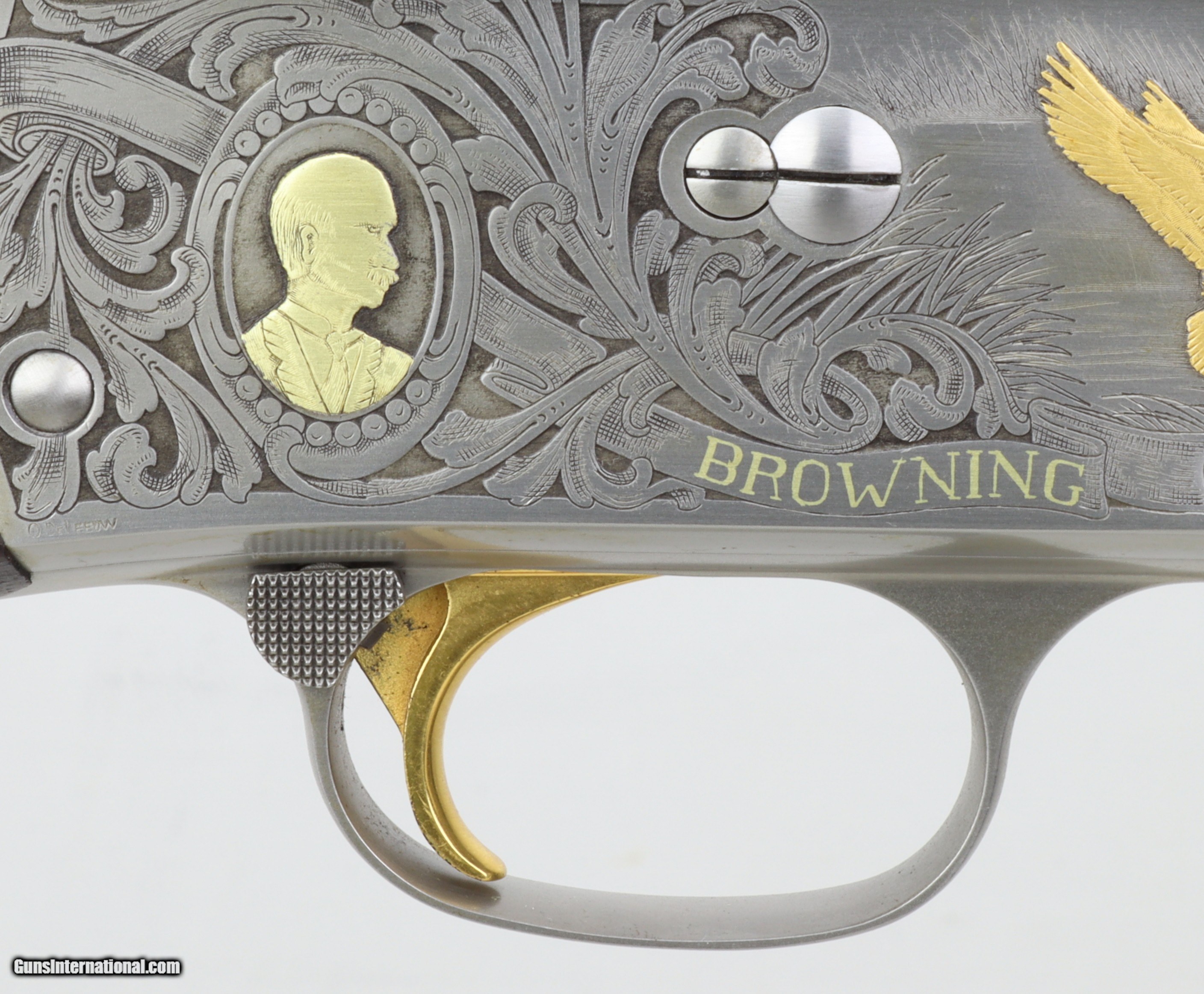 Description: BROWNING A-5, GOLD CLASSIC, 045 OF 500, SN#211GC0045, MFG: 1985, 12GA, Modified Choke, 28" VR Barrel. "BELGIUM MADE", "EXTREMELY RARE". Beautiful Coin Finish Action, Engraved with Large Open, Shaded Scroll & Flocks of Ducks, Gold Inlay Hunting Scenes, Beautiful Backgrounds, "045 of FIVE HUNDRED, Engravers Signiture: S. Purgal, Left Side. Beautiful Pair of Gold Inlaid Flushing Mallards over "BROWNING GOLD CLASSIC", in Ribbon and a Portrait of John M. Browning is in oval Frame, Signiture of Engraver: "Odel Feuw", under Portrait. Exceptional Figured Burl Walnut, Carved Bead Borders, Beautiful Checkering, W/Flourishes of Scrolled Acanthus, W/Stippled Background. Gun comes in Original Black Browning Box, w/Black outer Cover. Original Cardboard Shipping box. LOP: 14 1/2", DAC: 1 5/8" DAH: 2 1/2". Weight: 8lbs, 1.6ozs. (It is Estimated that only 350 of the Originally Planned 500 were ever made" Ships to buyer: Actual Cost of Insured Shipping. Sold to ARK Buyer Pending Receipt of Funds SOLD |