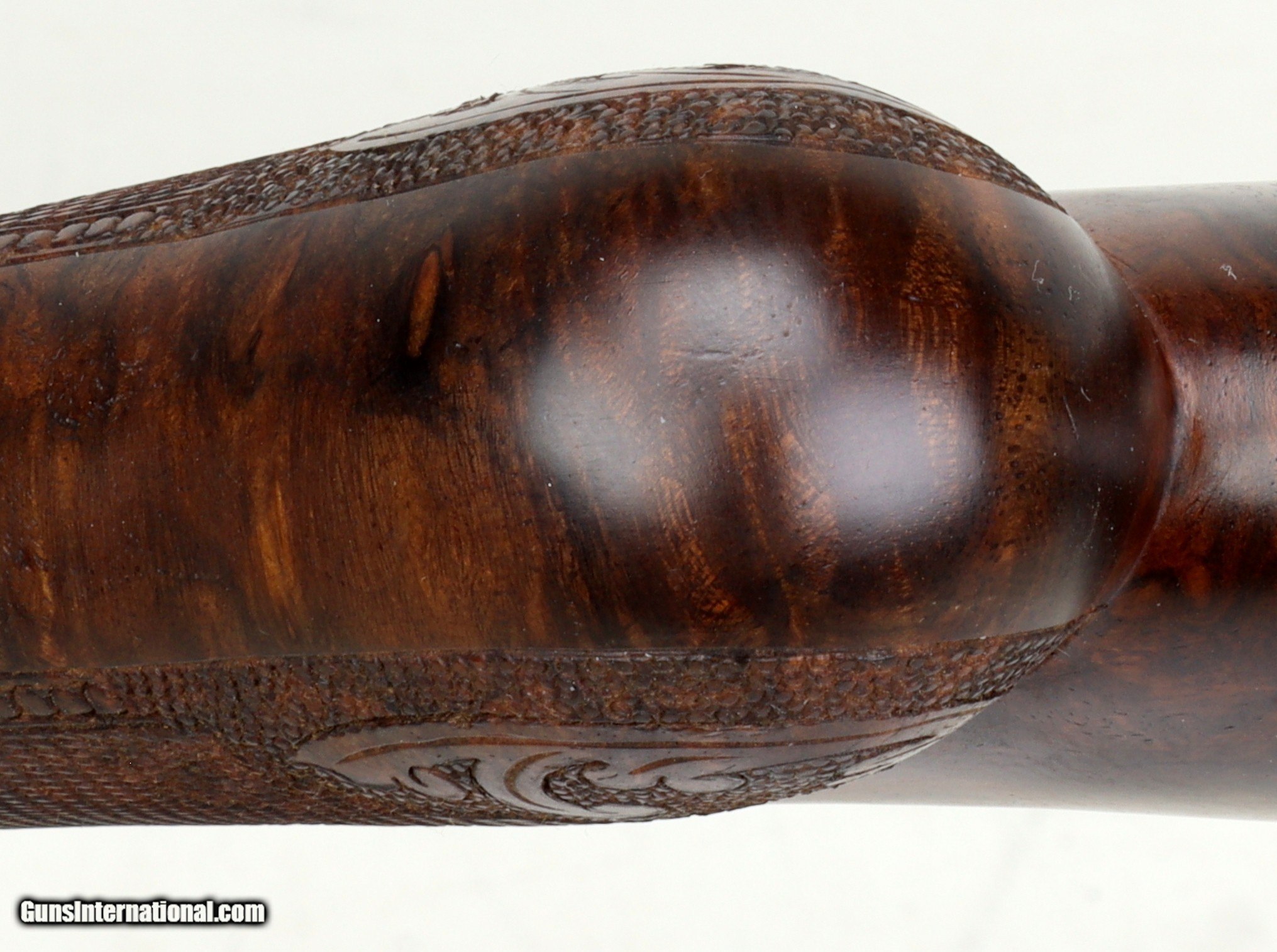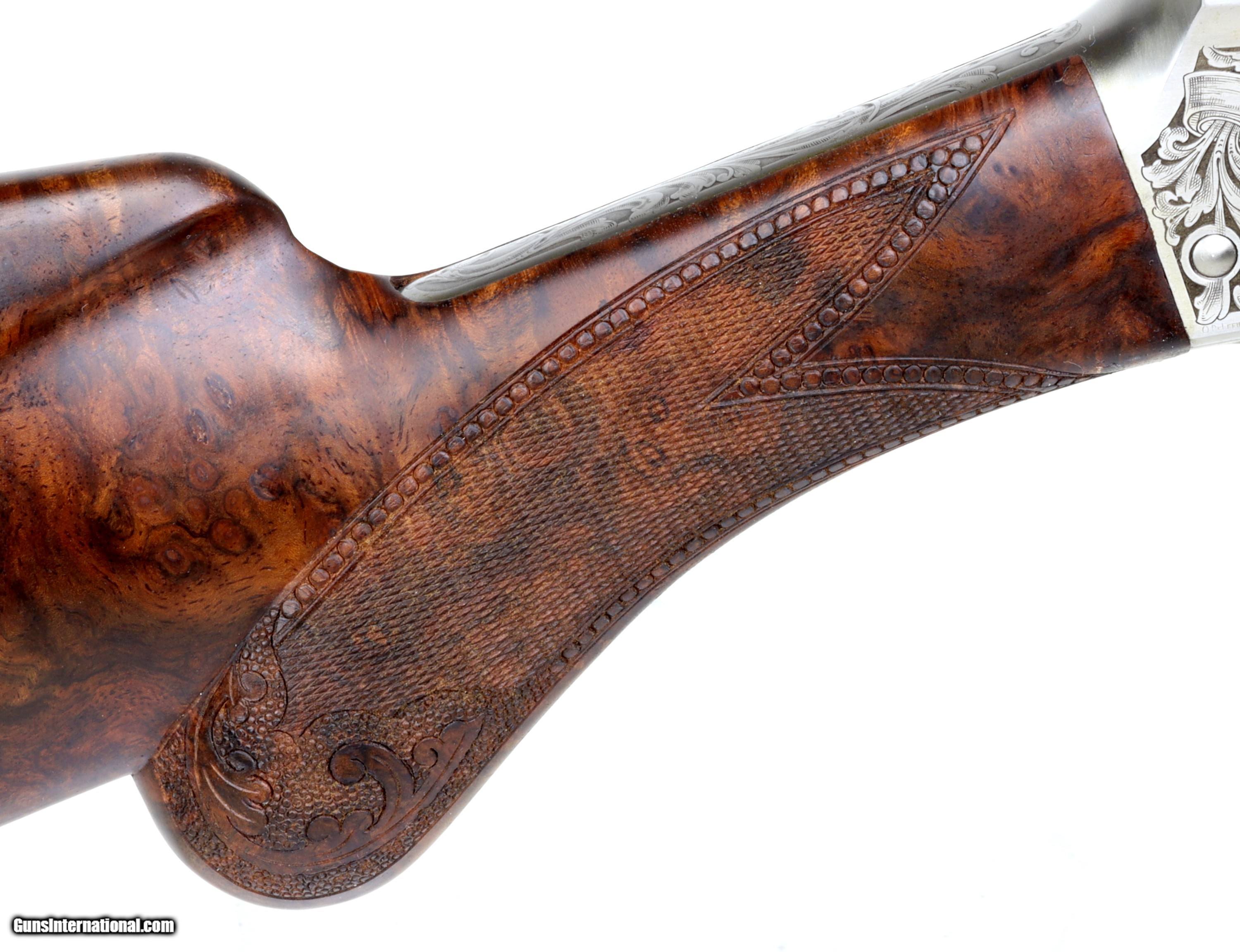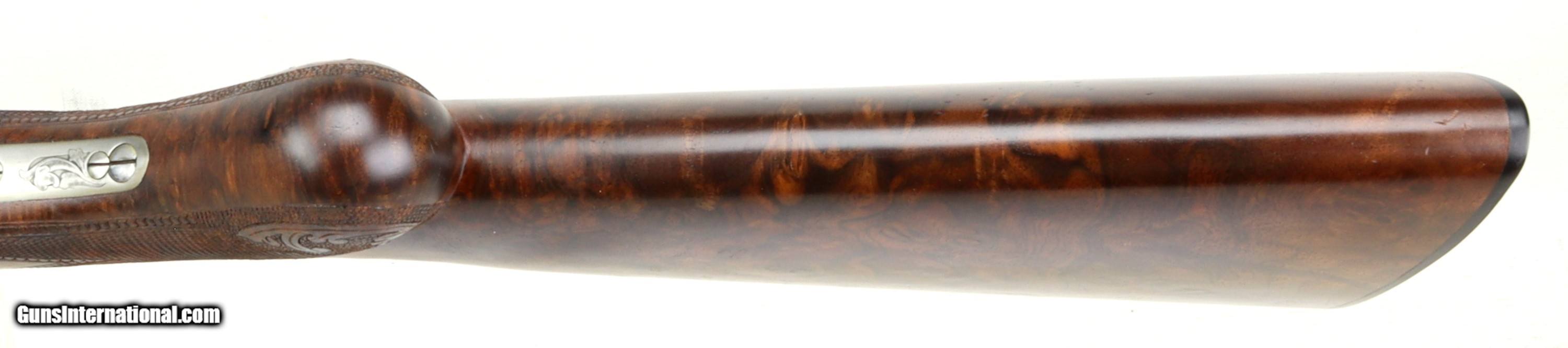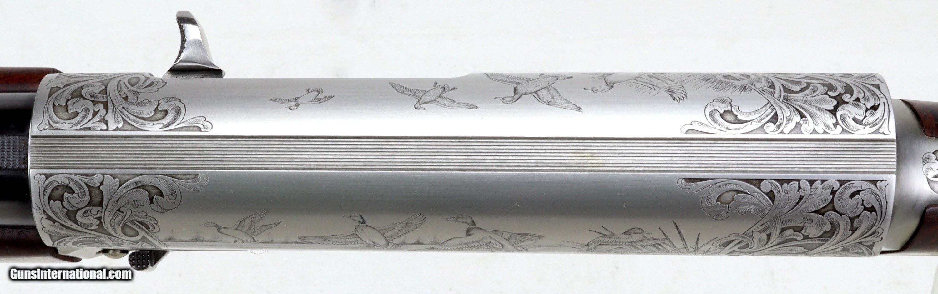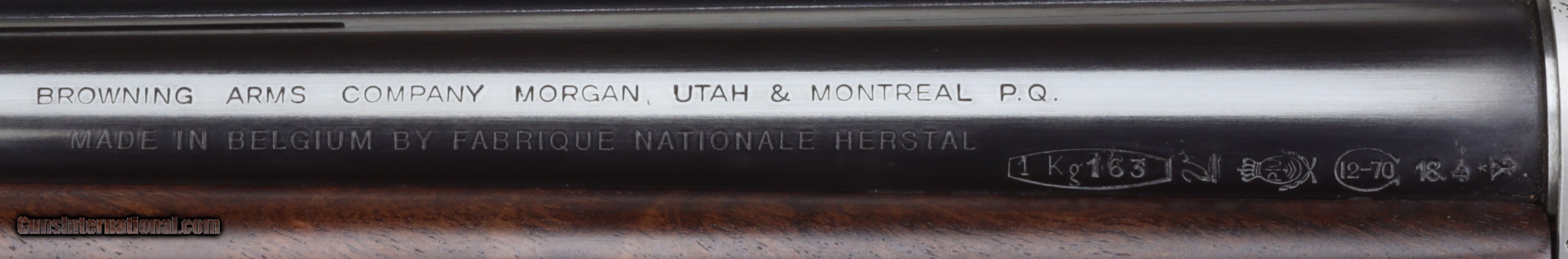 Description: BROWNING A-5, GOLD CLASSIC, 045 OF 500, SN#211GC0045, MFG: 1985, 12GA, Modified Choke, 28" VR Barrel. "BELGIUM MADE", "EXTREMELY RARE". Beautiful Coin Finish Action, Engraved with Large Open, Shaded Scroll & Flocks of Ducks, Gold Inlay Hunting Scenes, Beautiful Backgrounds, "045 of FIVE HUNDRED, Engravers Signiture: S. Purgal, Left Side. Beautiful Pair of Gold Inlaid Flushing Mallards over "BROWNING GOLD CLASSIC", in Ribbon and a Portrait of John M. Browning is in oval Frame, Signiture of Engraver: "Odel Feuw", under Portrait. Exceptional Figured Burl Walnut, Carved Bead Borders, Beautiful Checkering, W/Flourishes of Scrolled Acanthus, W/Stippled Background. Gun comes in Original Black Browning Box, w/Black outer Cover. Original Cardboard Shipping box. LOP: 14 1/2", DAC: 1 5/8" DAH: 2 1/2". Weight: 8lbs, 1.6ozs. (It is Estimated that only 350 of the Originally Planned 500 were ever made" Ships to buyer: Actual Cost of Insured Shipping. Sold to ARK Buyer Pending Receipt of Funds SOLD |