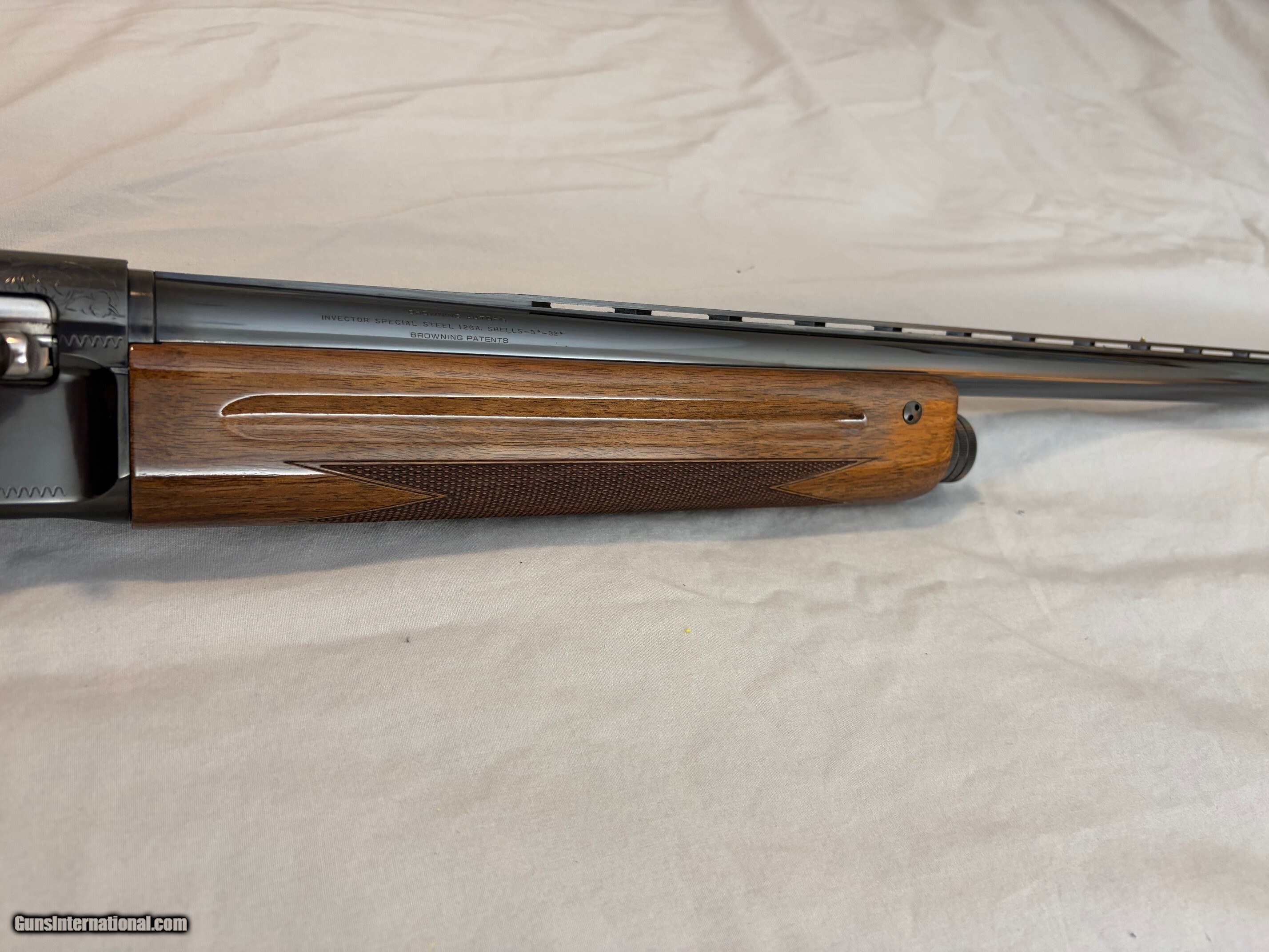 Description: Stunning Browning A5 12 gauge Magnum, as seen in the pictures this gun is in exceptional condition with only few very minor impressions in the wood, checkering is as new, the metal retains all its bluing with only a few minor freckles that are hard to see in the pictures, there are no rubs or wear. The gun appears to have barely been fired, The action is slick and cycles as it should. All the friction rings are present, that can be adjusted for 3" and 2 3/4 shells. The original invector chokes are included, IC,M and F. The original box is included and contains what is seen in the pictures, that is in good condition for its age. This is the nicest example of a Myroku Magnum 12 that I have seen in my 50 years of owning these awesome guns, with its highly desirable 32" barrel, It would be hard to find a nicer example of an original unmolested A5 Magnum. I can provide additional pictures upon request, please feel free to ask any questions. Specifications