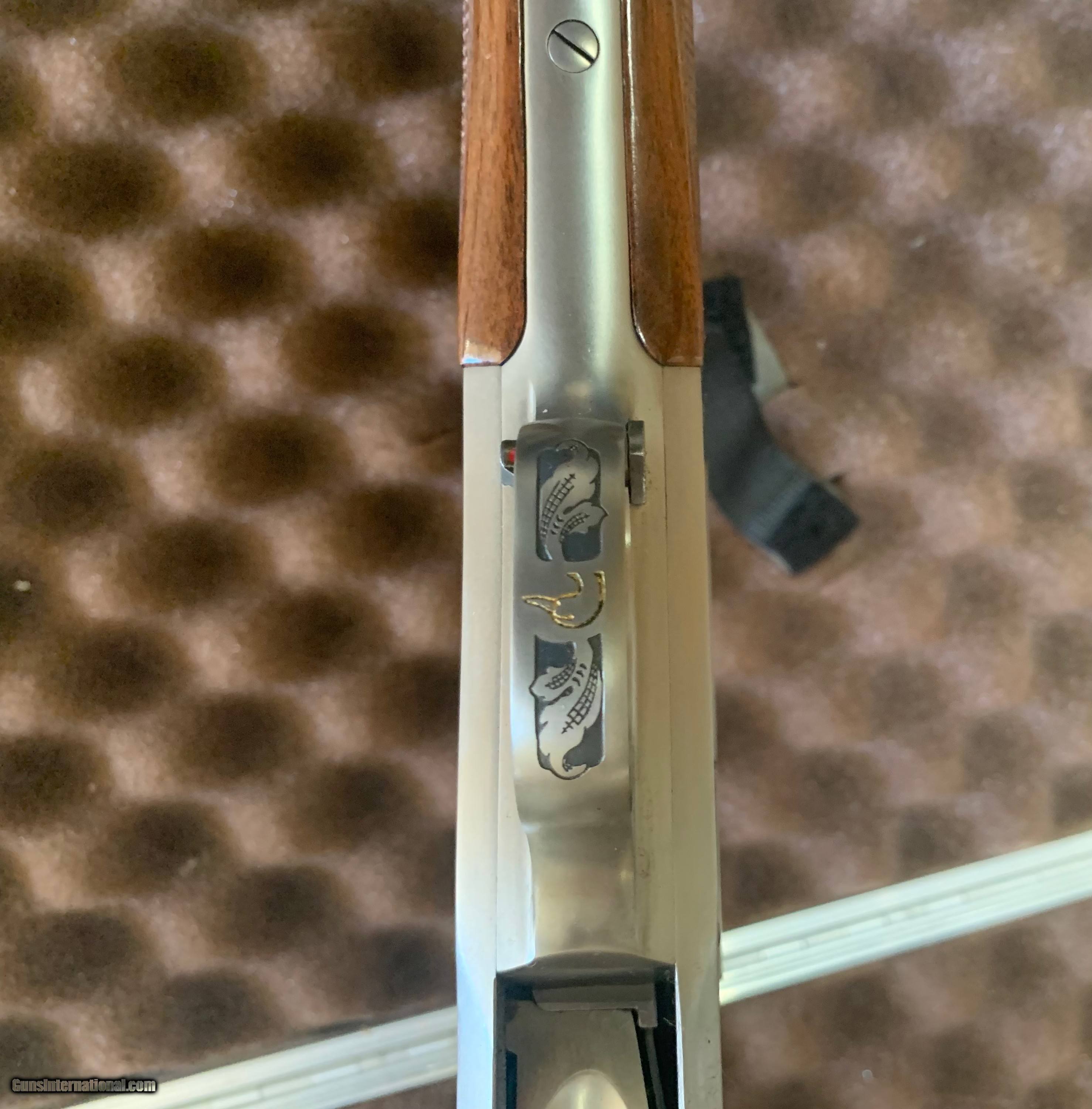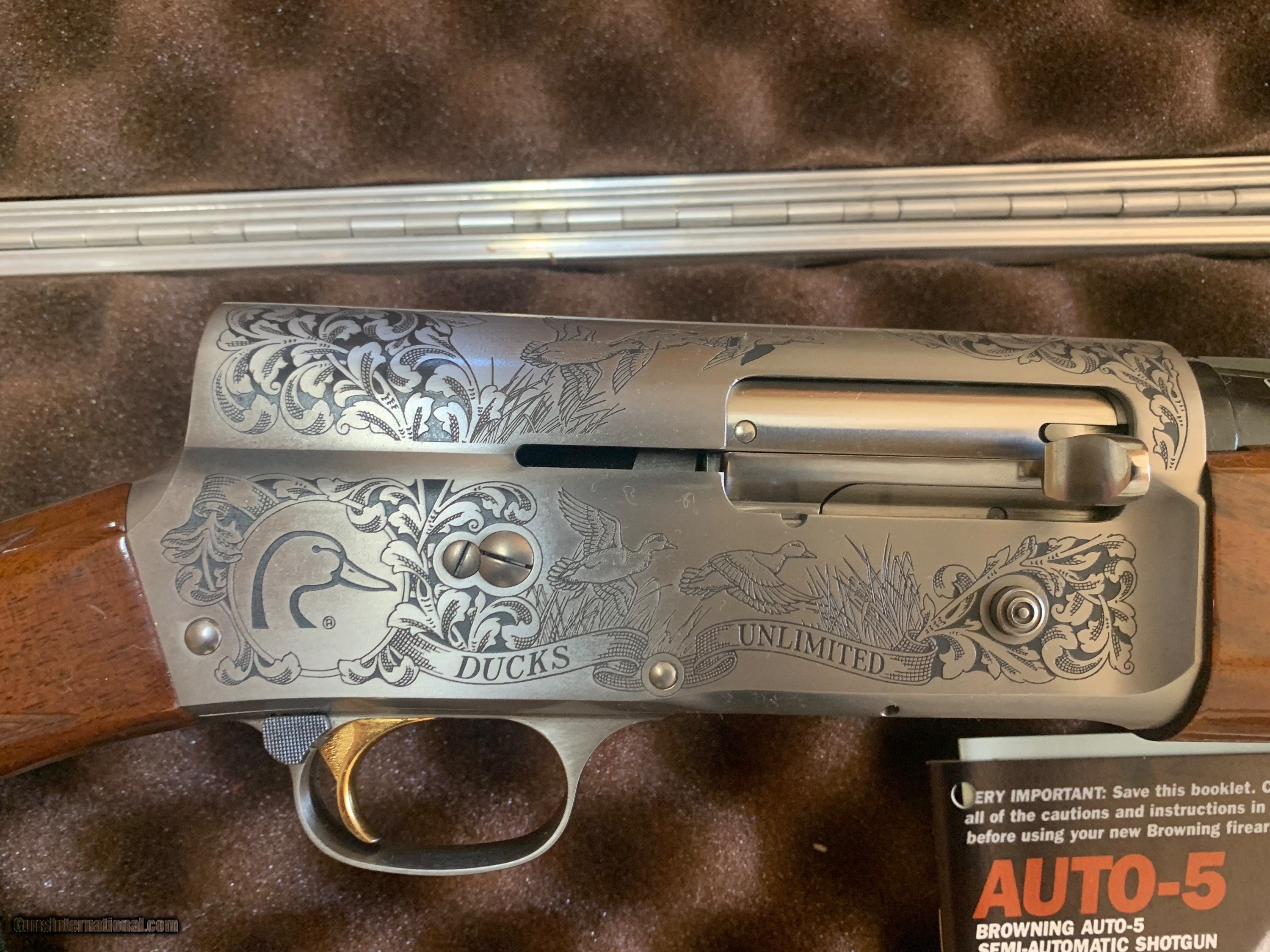 Description: Unfired Browning A5 DU light 20 shotgun. 26" vent rib barrel with 3 choke tubes. Grade V walnut finely checkered stock and forend. Engraved receiver with Wood Ducks, teal, DU logo and scrolls, is signed: M.Oshi. Original DU case and paperwork included. This is number 43 of limited production. Buyer pays actual shipping and insurance costs, FFL required.bank or personal checks accepted. Price: $2,450.00 SOLD Shotgun Gauge: 20 Gauge Manufacturer: Browning Model: A5 DU Condition: New Metal Condition: New Wood Condition: Nee |