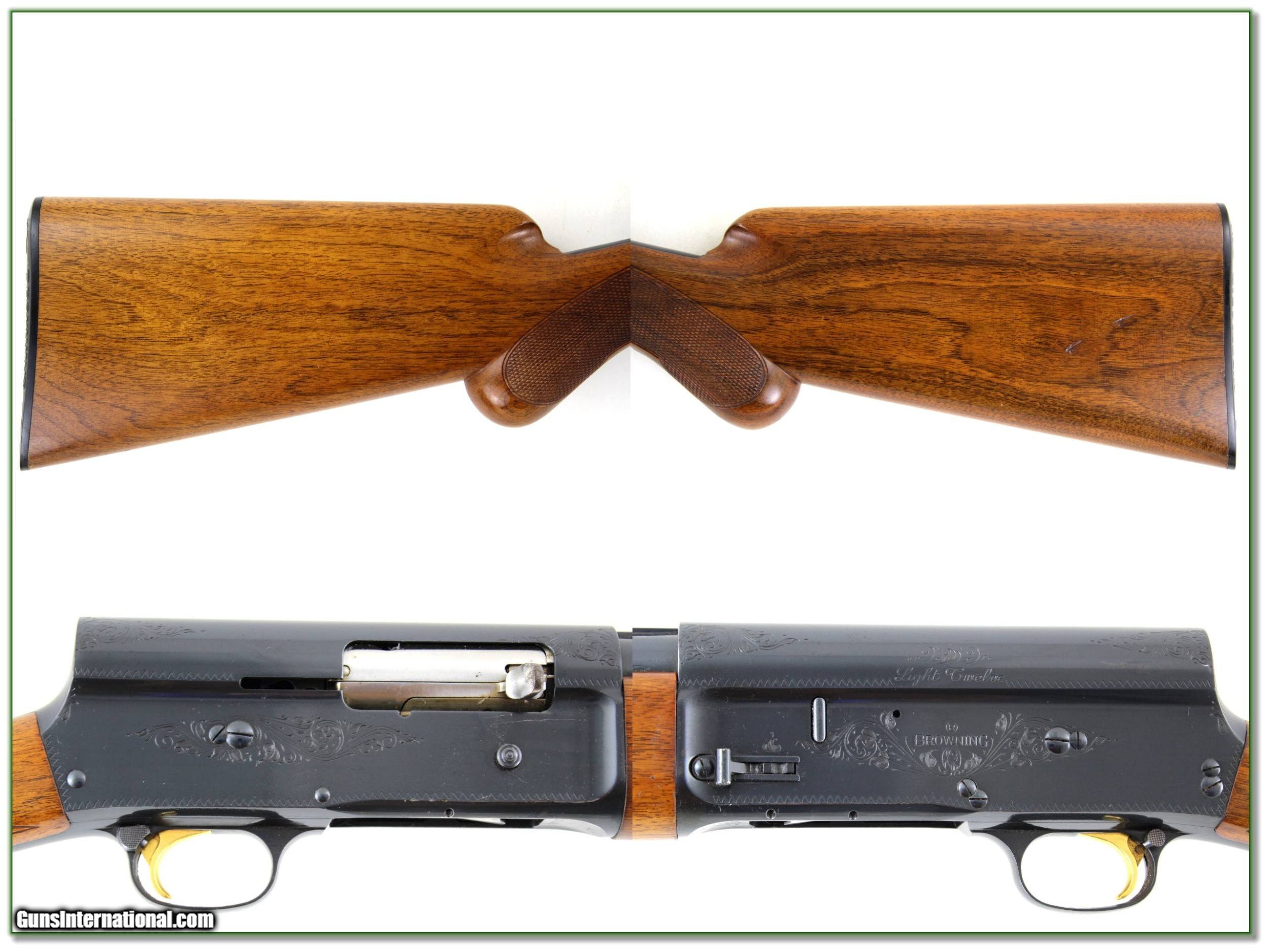 Description: Shooters and hunters, this is a 1966 Belgium made Browning Light 12. It is the last year of the Belgium Round Knob A5’s. This one has beautiful wood with a few marks as seen. The metal is excellent just the lightest of thinning on the carry points. I find no gold trigger or recoil wear so we not cycled many rounds. It has a 28in VR full barrel and will make a classic field gun. These A5’s keep increasing in value. That makes them Shooting Investments! Shipping and insurance is $39. Please email me with any questions or larger pictures. (Consign your quality firearms with Shooting Investments for only 12%! Let me know if you have any you would like to sell!) 22-0011 Payment: Payment is by Money Order, Cashiers Check or Personal Check. I can now also accept Credit Cards (MasterCard, Visa, Discover & American Express) with a 3% convenience fee. Shipping: The shipping charge will be listed in each description. It is $39 for most firearms. Some heavy guns or those insured for over $2000 will be higher. Shipments to Alaska and Hawaii are higher because air shipment is required. Most firearms are shipped on Tuesday and Thursday and usually in 5 days of receipt of payment. We package all shipments carefully and insure them. Optics are shipped Priority Mail and most other non-firearm shipments are shipped First Class. Returns: Our return policy is simple. If for any reason you are not pleased with your purchase, you may return your item for a full refund of purchase price. Ammunition cannot be returned. It is important to us that you are happy. Guns cannot be fired or dissembled before returning them and they must be returned in the same condition as received. Notification of a return must occur with-in 3 days of receipt at your dealer. Shipping, convenience and dealer fees are not refundable and are the responsibility of the buyer. Lay-a-way: If needed, we offer a 60 day lay-a-way option on most firearms. It is 1/3 now, 1/3 in 30 days and 1/3 in 60 days. Lay-a-way firearm sales are final and if not completed the first payment cannot be returned. Consigning your firearms with Shooting Investments: We will help you get top dollar for your firearms. While most local guns shops charge 20% or more, our fee is only 12% with a minimum of $75. At your local gun shop it might take months to sell. Selling on-line provides instant access to thousands of interested buyers. You won’t find any other on-line dealer willing to sell your firearms for only 12% or listing every gun on 3 separate s. Selling through an House typically costs the seller 15% and the buyer an addition 15% (so 30%) and you have to wait several months to sell and longer to receive funds. If properly priced, we will sell your firearms in a few weeks. Send us an email or give us a call and we’ll explain how easy it is for you to get top dollar. Trading: Trading for use is really just buying your gun to re-sell. If you have a gun you want to trade, please email a picture and we will let you know what we can give or it. You will always get more if we sell it for you on consignment. Help for California Buyers: We are happy to ship to California. It is the buyer’s responsibility to make sure any item you buy is legal in your state. We are also happy to help with your purchase of a firearm from someone other than us. If you see a gun you would like to buy but the seller can’t or won’t ship to California they can ship to use and we’ll then ship it to your California dealer. The cost for this service is only $30 + shipping. Let us know if we can help! SOLD |