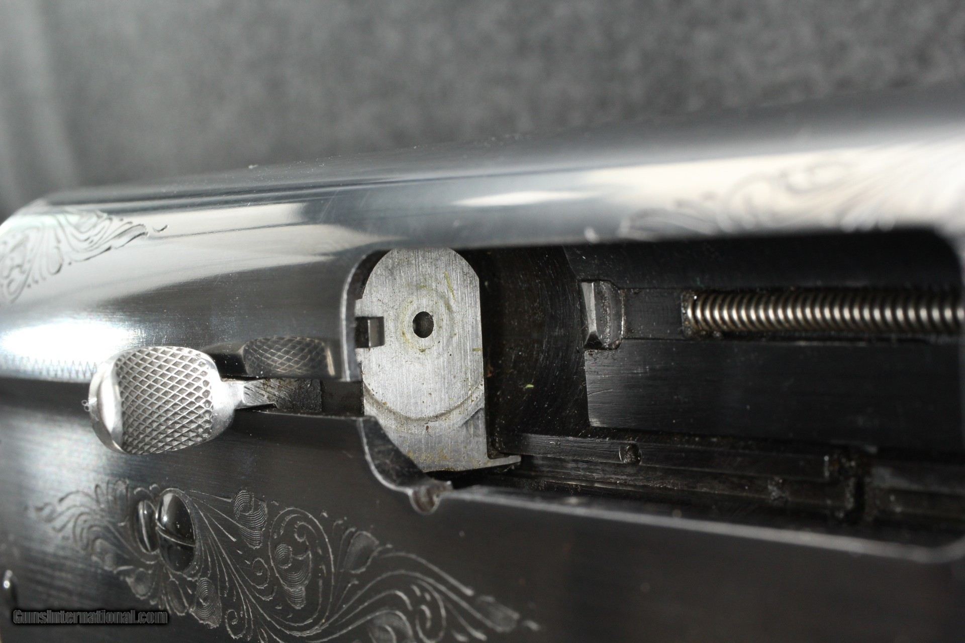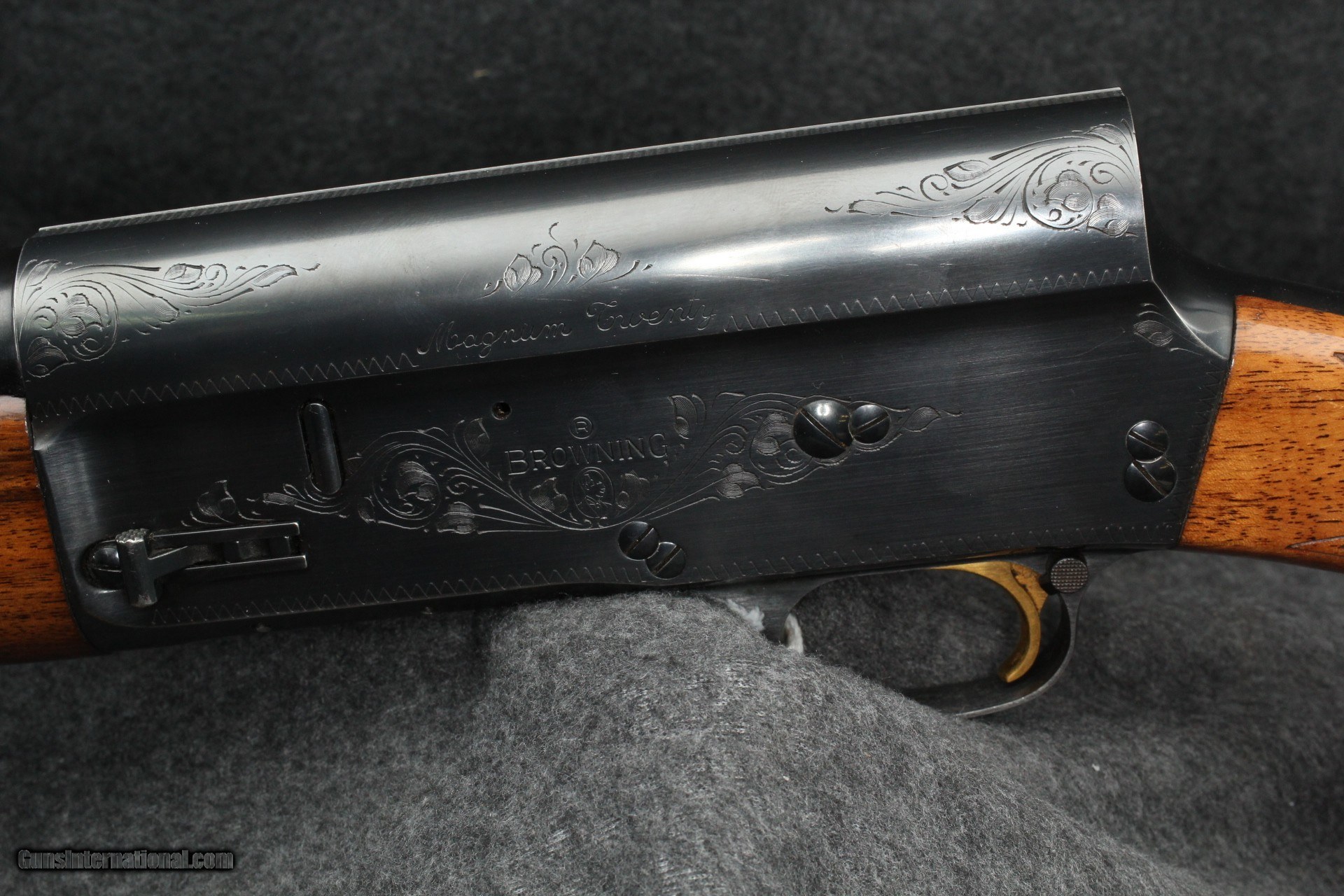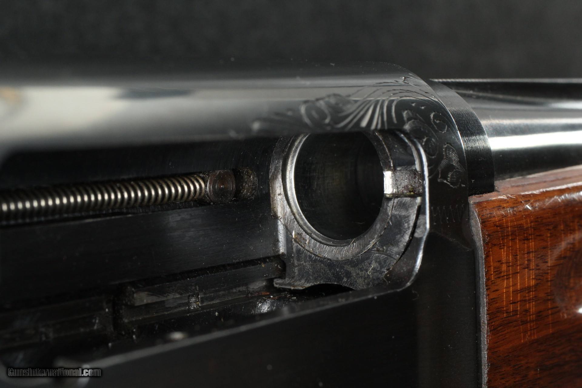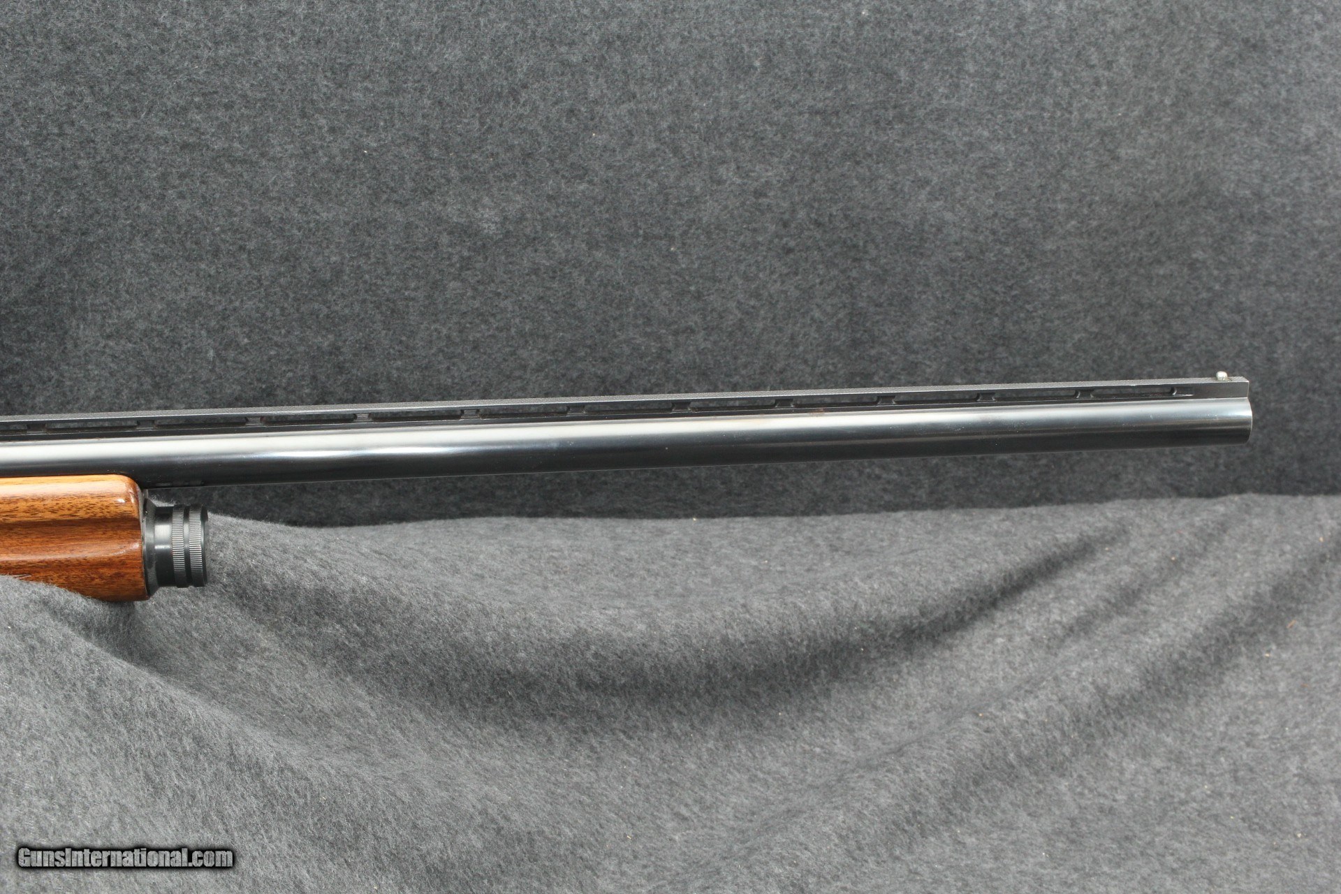 Description: 20ga, 3" chamber, serial number 7X3XX. 1967 mfg date. 25.5" VR barrel, fixed choke (full). Barrel serial number does not match firearm serial number. Bore is excellent. Barrel shows minor wear, receiver shows minor wear, 96% overall, with minor handling marks. 1" shallow scratch on left-side receiver above "Magnum Twenty" marking. Wood is matching French walnut with crisp checkering and minor marring. Showing start of craze-cracking, with minor finish loss ahead of receiver on forend. Factory buttplate is excellent, no cracks. More photos on request. Please contact us for shipping and insurance. Will ship to C&R. SOLD Curio/Relic: Yes Shotgun Gauge: 20 Gauge |