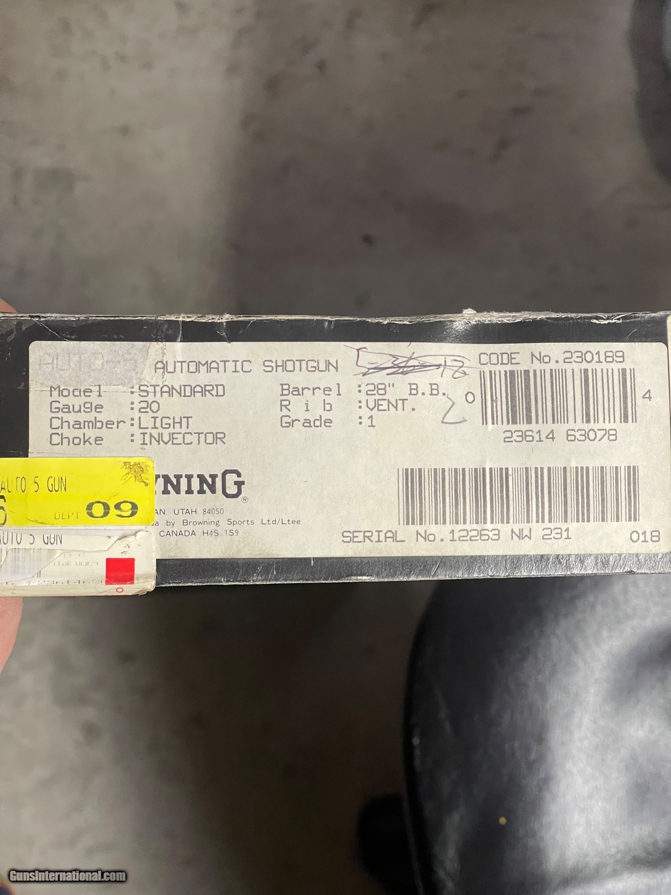 Description: Wow! What an incredible A5. This shotgun features a 28 inch ventilated rib barrel, beautiful dark walnut wood, gold trigger, bead sight, and original numbered box. Also includes invector chokes, wrench, and booklet. Still has the gold sticker on the end of the barrel! Please email with questions. Shipping and insurance included. Cards add 3% Manufacturer: Browning Model: A5 Barrel Length: 28 inch Condition: LNIB Metal Condition: Excellent Wood Condition: Excellent Bore Condition: Excellent Action: Semi auto Rib: Vent Finish: Blue Sights: Bead Manufacture Date: 1994 Item Location: 37075 Price: $2,200.00 Contact Seller |