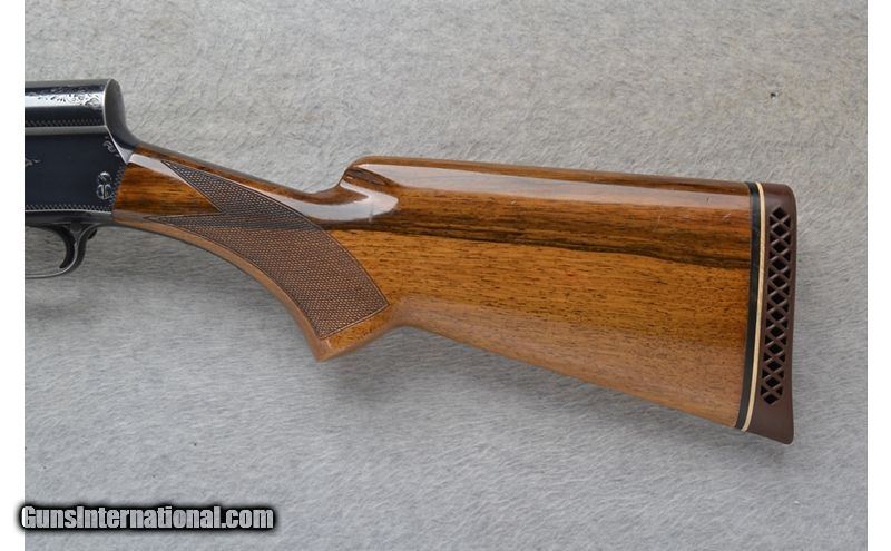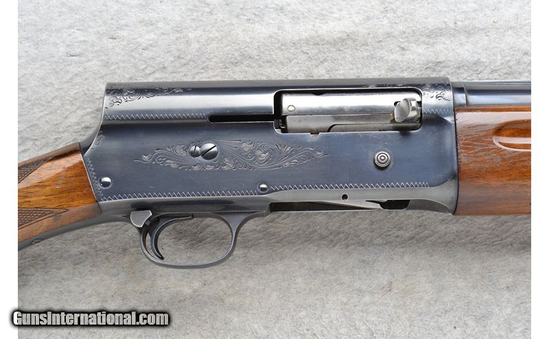 Description: This Browning Model Auto-5 is a right hand semi-auto shotgun in 12 Ga. It has a 29.5 inch barrel. A metal bead front sight. With a 3 inch chamber it has a fixed Full choke. The butt stock is a checkered grip walnut pistol grip. The forearm is a checkered grip walnut with finger grooves. It has a lightly engraved receiver. Made in Belgium. S/N 70V63622. 12 Gauge SOLD Chambers: 3 inch. Metal Condition: Good. Minor handling/use marks. Wood Condition: Good. Has handling marks. Bore Condition: Shiny. Barrels: 29.5 inch barrel with a ventilated rib. Stock Dimensions: LOP 14 1/8 inches. Fore End: Checkered grip walnut with finger grooves. Butt Pad: Browning rubber recoil pad. Weight: 9 lb. 2 oz. Sights: Metal front bead. Chokes: Fixed Full choke. Item Location: Richfield, WI |