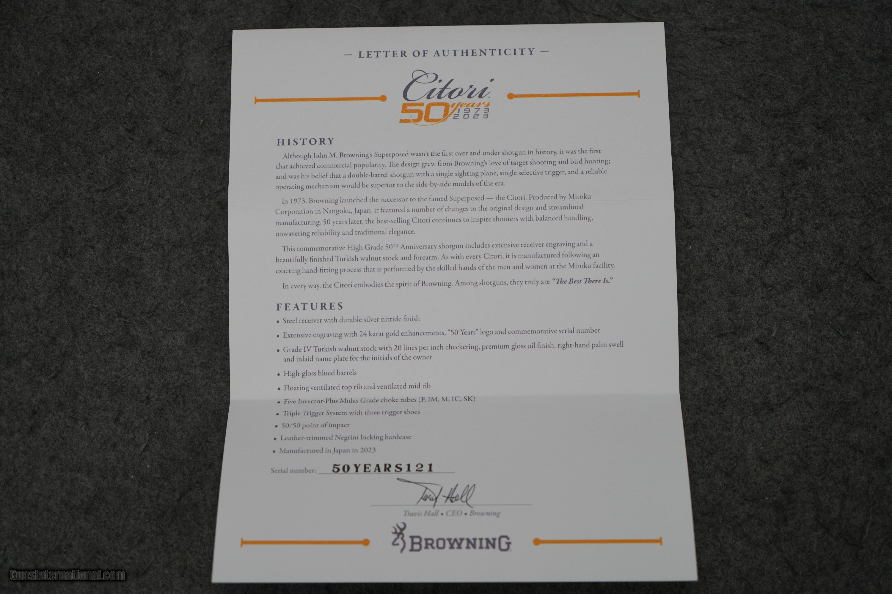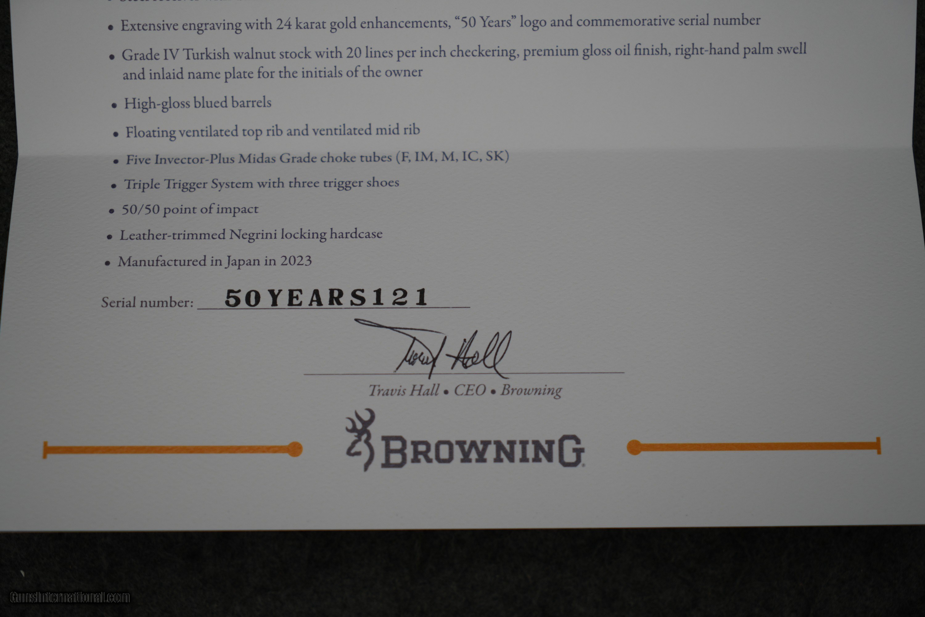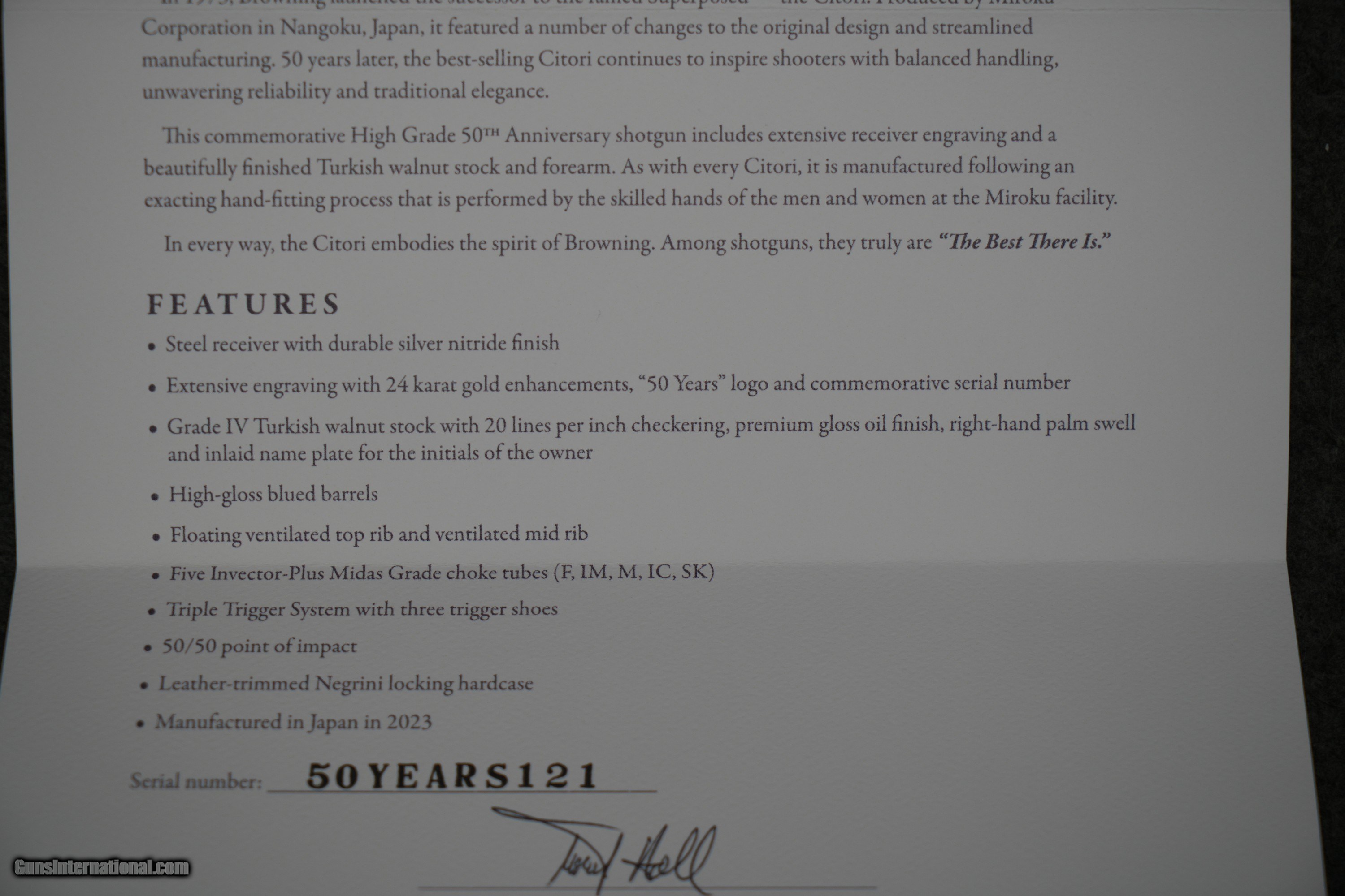Description: The Browning Citori High Grade 50th Anniversary is a VERY LIMITED RUN! Each one of these has a dedicated serial number that begins with 50YEARSXXX. This particular one is 50YEARS121. The wood is absolutely GORGEOUS with a ton of figure! The engraving is so finely done and extensive, and bound to turn heads! Please do not skip over this, as this is insanely limited. John M. Browning is the greatest gun designer of all time. No other was more prolific and developed such a wide variety of firearms. From the original Single-Shot rifle to the Model 94 lever-action rifle to the Model 1911 handgun to the M2 .50 caliber machine gun to the Auto-5 shotgun, Browning developed tough, reliable arms for hunting and to help secure freedom around the globe. Although he passed away before it was manufactured, one of his final designs ranks among his most successful and beloved by shotgun enthusiasts, this gun is the Superposed. Although the idea of having one barrel above the other was not a new idea, the Superposed was the first commercially successful over and under shotgun. Browning himself was a shotgun enthusiast, and it was his belief that a double-barrel shotgun with a single sighting plane, single selective trigger, and a reliable operating mechanism would be superior to the side-by-side models of the era. He designed the Superposed using the same gift of ingenuity with which he used to develop his other designs; resulting in a tough and supremely reliable firearm that, once again, steered the course of history. In 1973, Browning launched the successor to the famed Superposed — the Citori. Produced by Miroku Corporation in Nangoku, Japan, the Citori utilized the same design as the Superposed, and included a number of changes to the original design that streamlined manufacturing and made the Citori more affordable, putting these fine shotguns in the hands of even more users. 50 years later, the best-selling Citori continues to inspire shooters with balanced handling, unwavering reliability, and traditional elegance. This commemorative High Grade 50th Anniversary model includes extensive receiver engraving with gold accents and a beautifully finished Turkish walnut stock and forearm. As with every Citori, it is manufactured following an exacting hand-fitting process that is performed by the skilled hands of the men and women at the Miroku facility. Silver nitride steel receiver features extensive engraving with 24 karat gold enhancement and 50 years logo Grade IV Turkish walnut stock with proprietary premium gloss oil finish process, cut checkering, right-hand palm swell, and name-plate inlay for owner’s initials Letter of authenticity High-gloss blued barrels Triple Trigger System with three trigger shoes HiViz® Pro Comp sight and ivory mid-bead Five Midas extended choke tubes POI: 50/50 Ideal for sporting clays/skeet/hunting Gauge 12 Chamber Length 3 Barrel Length 32 Overall Length 49 1/2 Length of Pull 14 3/4 Drop at Comb 1 1/2 Drop at Heel 1 1/4 Weight 8 lbs 1 oz Rib Width 3/8 - 1/2 Barrel Finish Gloss Blued Stock Finish Gloss Oil Wood Grade Grade IV Chokes Included Full, Improved Modified, Modified, Improved Cylinder, Skeet Receiver Finish Silver Nitride Chamber Finish Chrome Plated Chamber Front Sight HiViz Pro-Comp Choke System Invector-Plus Midas Barrel Material Steel Stock Material Turkish Walnut Recoil Pad Inflex 2, Large Checkering Cut 20 LPI Sling Swivel Studs None Receiver Material Steel Trigger Finish Gold Plated Trigger Guard Finish Silver Nitride Trigger Material Alloy Trigger Guard Material Steel Trigger Guard Engraving Hand Choke Wrench Included T-Wrench SOLD Shotgun Gauge: 12 Gauge Manufacturer: Browning Model: Citori 50th Anniversary Barrel Length: 32" Barrels Condition: BRAND NEW |