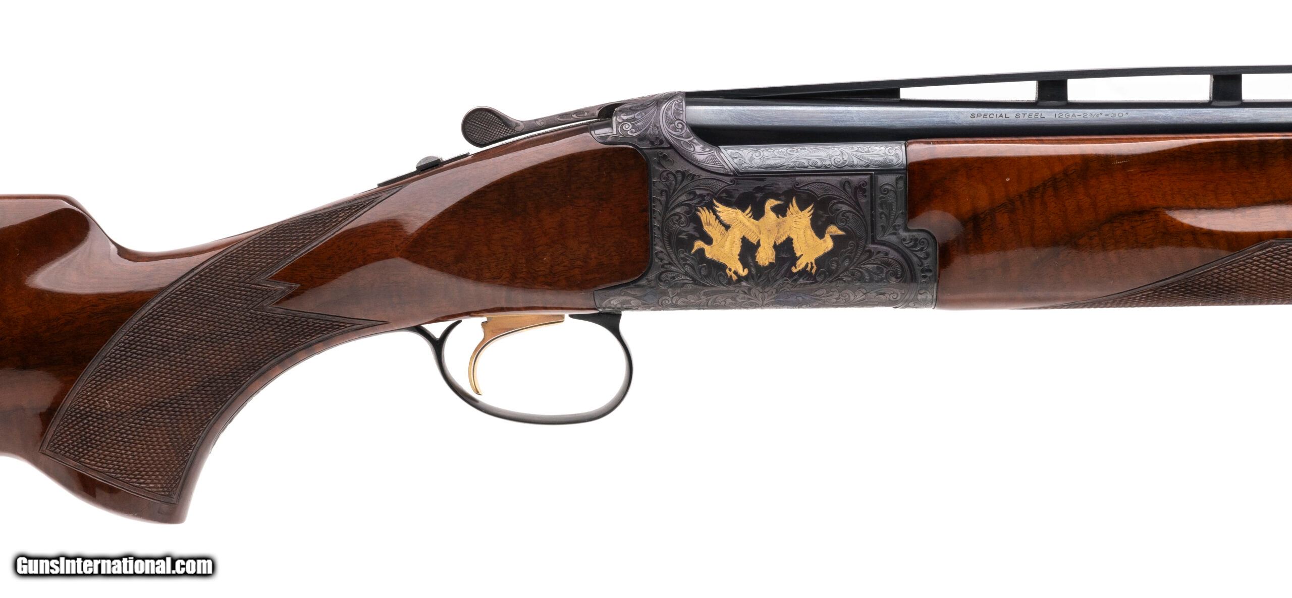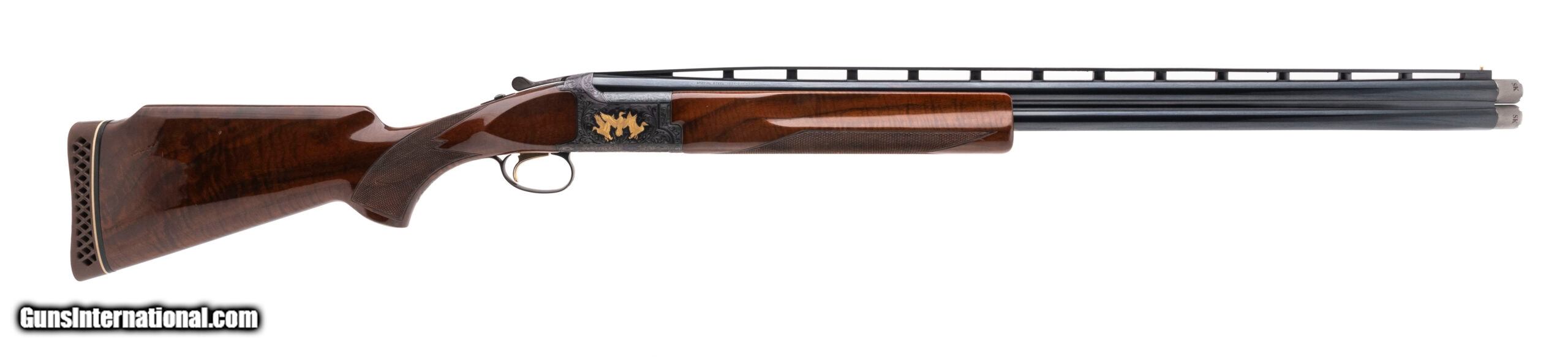 Description: "SN: 25356PV143 made in Japan in 1985. 12 gauge over under with 30" vent rib barrels with a single brass bead front sight, 2 ¾" chambers and screw in Briley chokes (INVX2 SK/SK), gold plated selective single trigger and ejectors with a manual safety. Features a Monte Carlo stock with a 14.5" LOP to the Browning trap style recoil pad and a type 2 Beavertail or “Target" forearm. The action is fully engraved with gold inlaid birds on both sides and the trigger guard and a gold inlaid bird dog on the bottom. Overall in excellent condition for its age with bright bores and no visible wear to the bluing on the barrels or the action. The furniture only has some minor handling marks, much less than normal for a gun from 1985. Dallas Location Price: $3,950.00 Contact Seller |