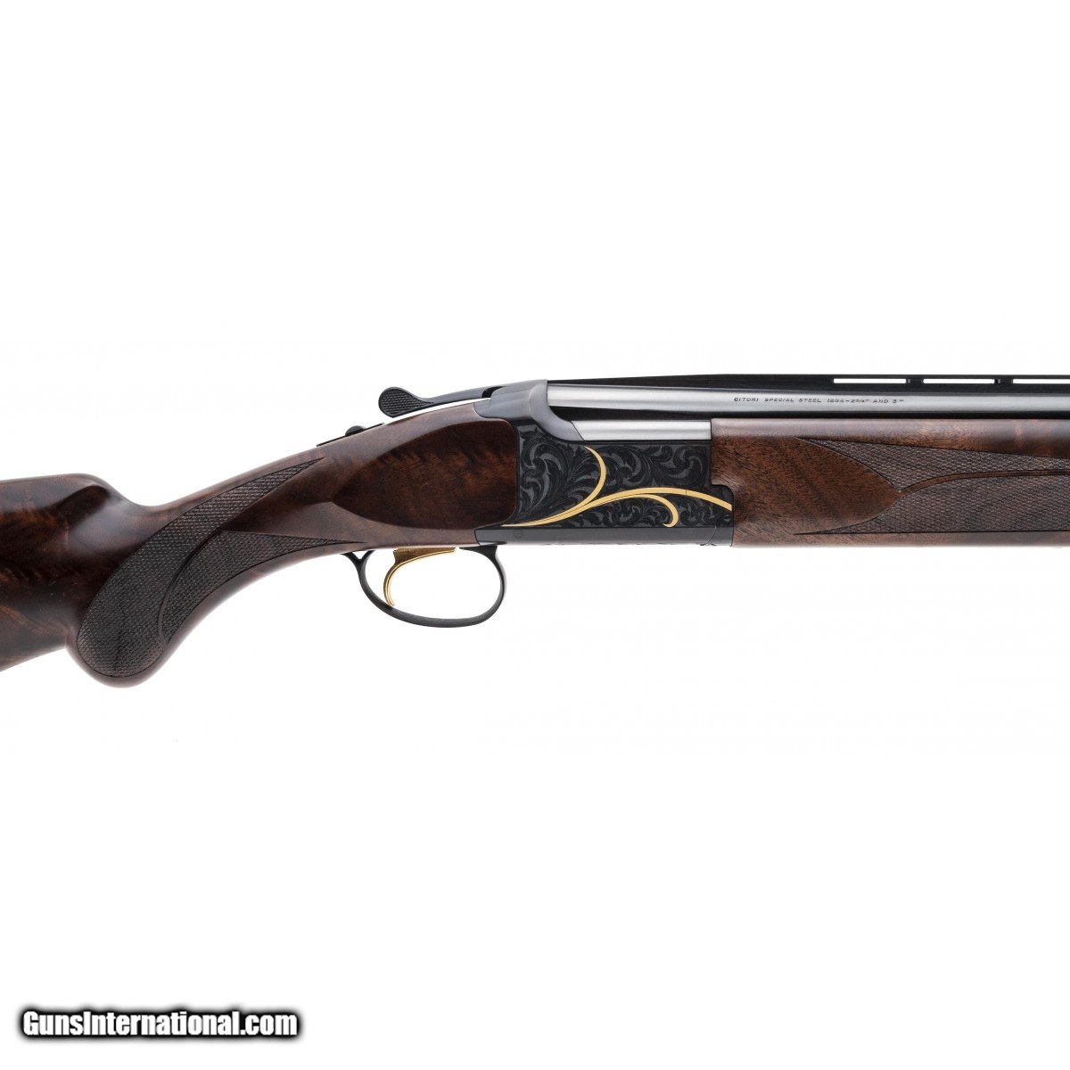 Description: " Beautiful over/under field gun with deluxe figured walnut stocks and 26"" barrels with extended chokes. Receiver is engraved with a foliate motif with gold inlays. A fantastic looking over/under. Comes with box and extra chokes. SOLD |
