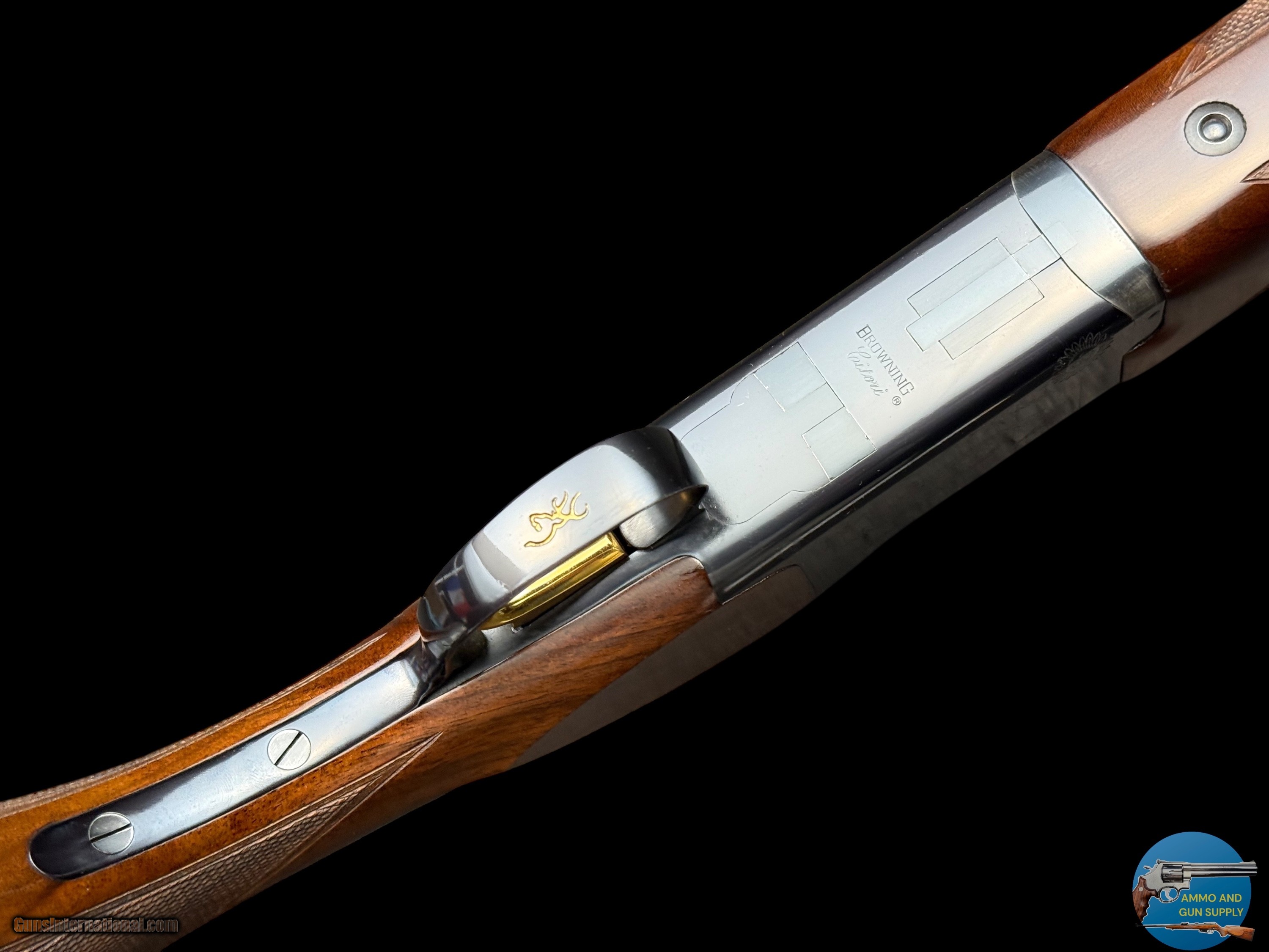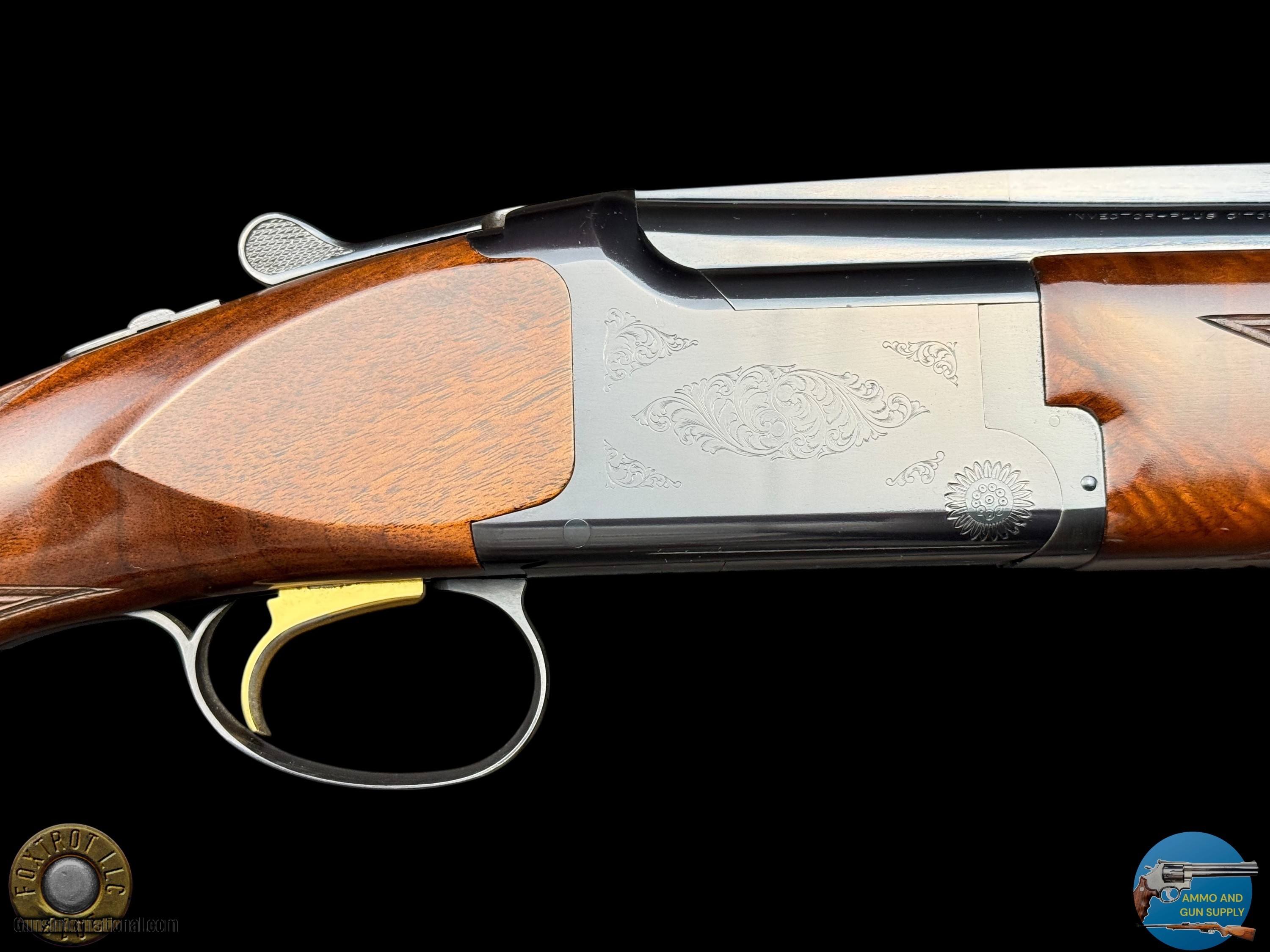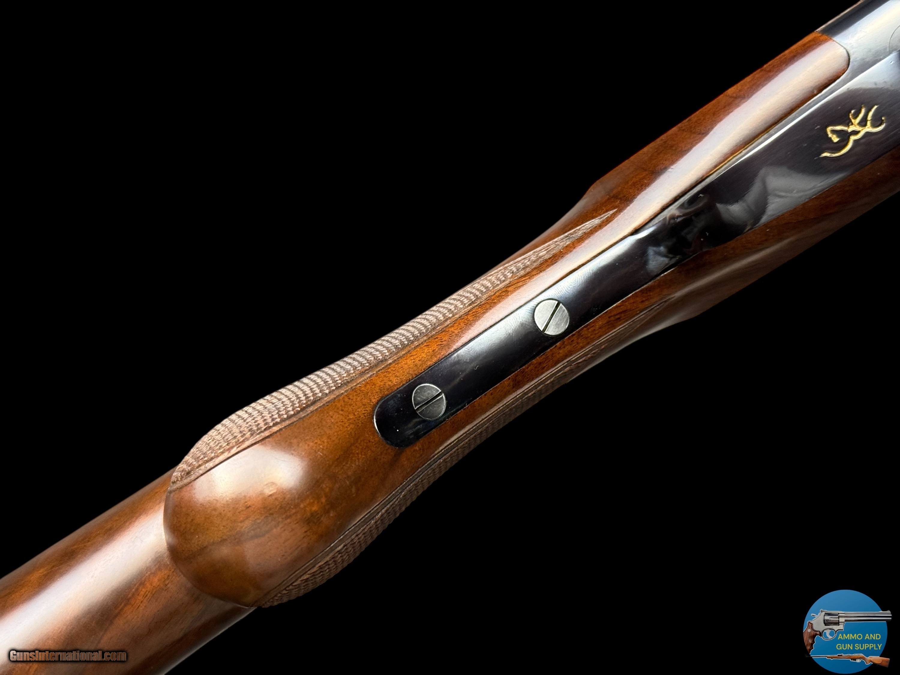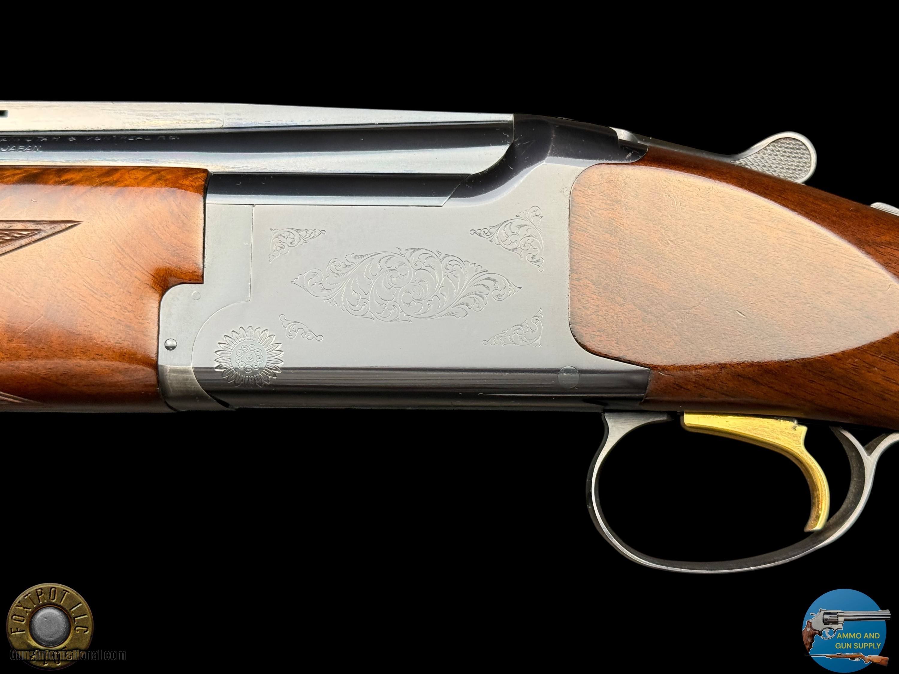 Description: 1993 BROWNING CITORI 12 GA 3" - 28" BARRELS - INVECTOR PLUS - CASED - ROUND KNOB LONG TANG MANUFACTURER - MIROKU - JAPAN FOR BROWNING USA MODEL - CITORI ACTION - BOXLOCK OVER/UNDER WITH SINGLE SELECTIVE TRIGGER AND EJECTORS SN - 77711NX253 GAUGE - 12 GAUGE 2.75" OR 3" CHAMBERS BARREL LENGTH - 28" SOLID RIB BARRELS CHOKES - INVECTOR PLUS CHOKES - 1X SKEET 1X MODIFIED 1X FULL CAPACITY – 2 DAC - 1.625" DAH - 2.375" LOP - 14.25" TO BROWNING VENT RUBBER RECOIL PAD WEIGHT - 8 LB 3 OZ SIGHTS - VENT MATTED RIB WITH SILVER FRONT BEAD PRODUCED - 1993 This 1993 Browning Citori 12 gauge is a classic, Japanese-made over/under built by Miroku for Browning USA. Chambered for both 2.75" and 3" shells, it features 28" solid rib barrels threaded for Invector Plus chokes, with three included: skeet, modified, and full. The boxlock action is fitted with a single selective trigger and strong, timed ejectors. Weight is 8 lbs 3 oz, with stock dimensions of 1.625" drop at comb, 2.375" drop at heel, and 14.25" length of pull to the Browning ventilated rubber recoil pad. The sighting rib is vent-matted with a silver front bead. Condition is very good overall, with only faint wear consistent with age and careful use. The bores are bright and clean, the trigger breaks crisply, the action is smooth, and lock-up remains tight. Both barrels and action retain 99% of their original blued finish. The walnut stock and forend show striking figure, highlighted by sharp checkering on the round knob pistol grip and matching forend. Wood shows only the lightest handling marks, giving the gun both excellent presentation and practicality. This Citori comes housed in a fitted Griffin & Howe green canvas case with leather straps, brass hardware, and green felt interior with Griffin & Howe maker’s label. A fine example of a desirable early-’90s Browning Citori—elegant, durable, and complete with a premium fitted case. Perfect for the upcoming hunting season! Please call now - 315-689-0000 FLAT $75 S/H/I. 4%CREDIT CARD FEE APPLIES. FOXTROT IS A LICENSED FFL DEALER WITH MANY POSITIVE FEEDBACKS SO BUY WITH CONFIDENCE! SOLD Shotgun Gauge: 12 Gauge |