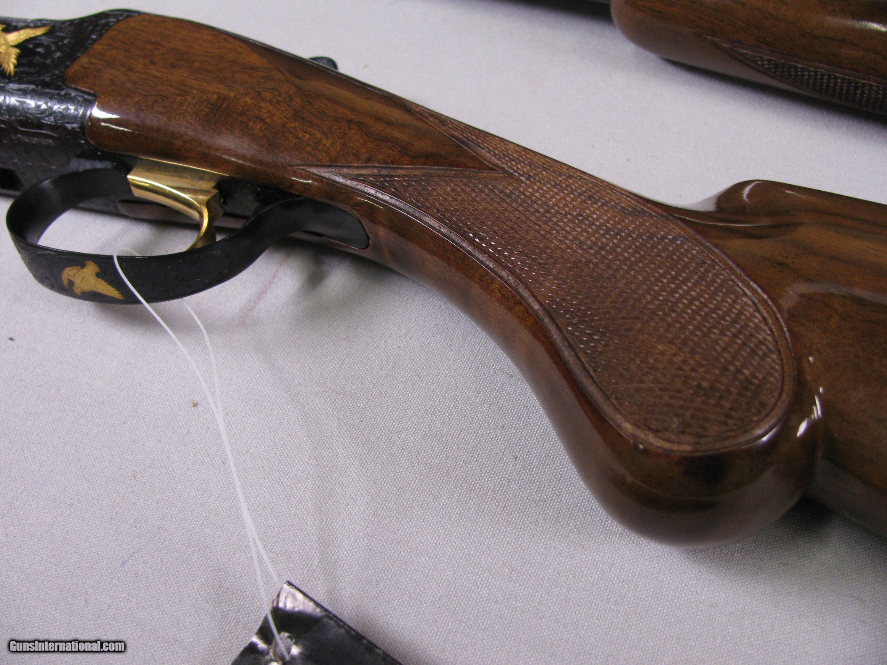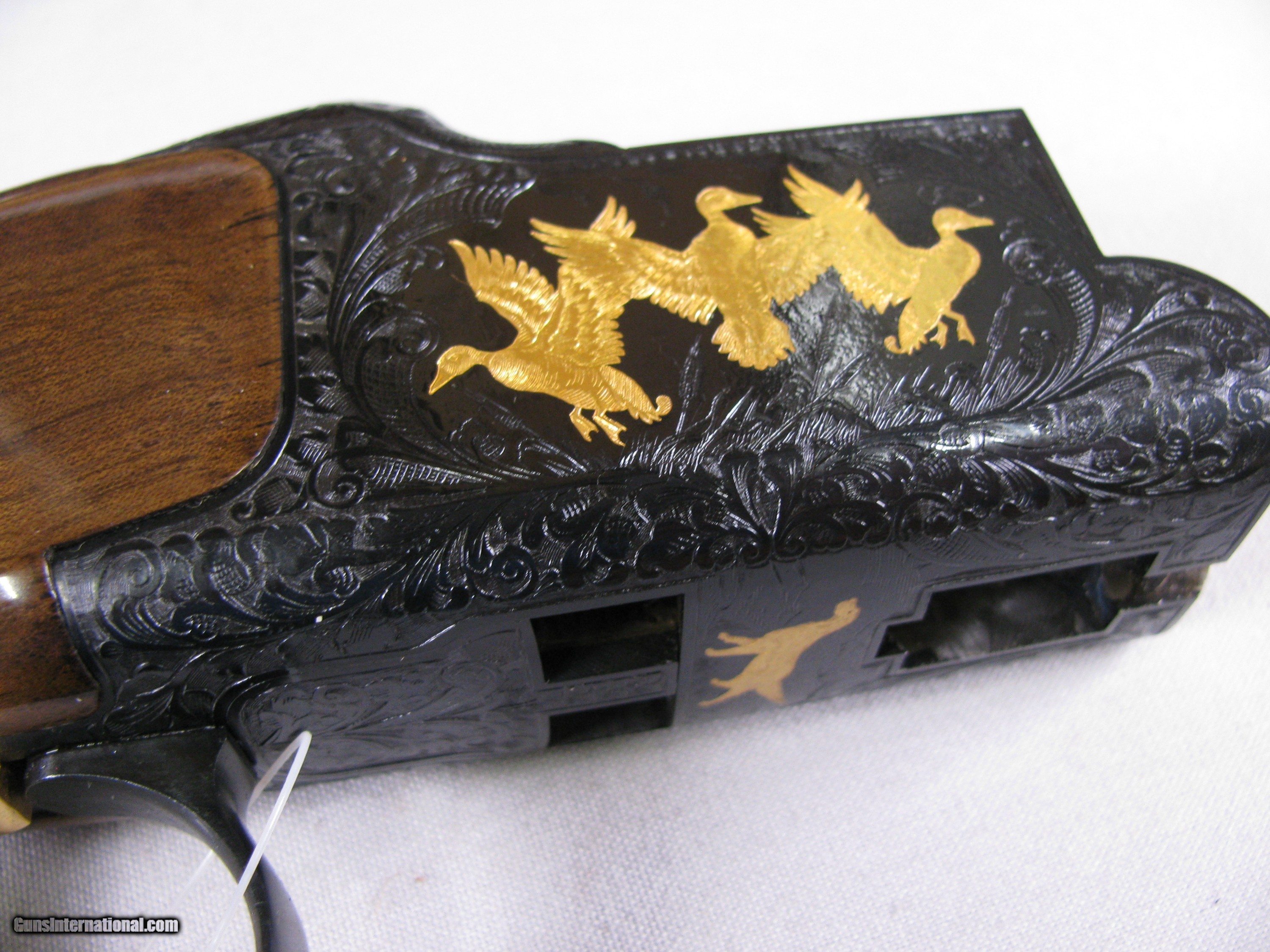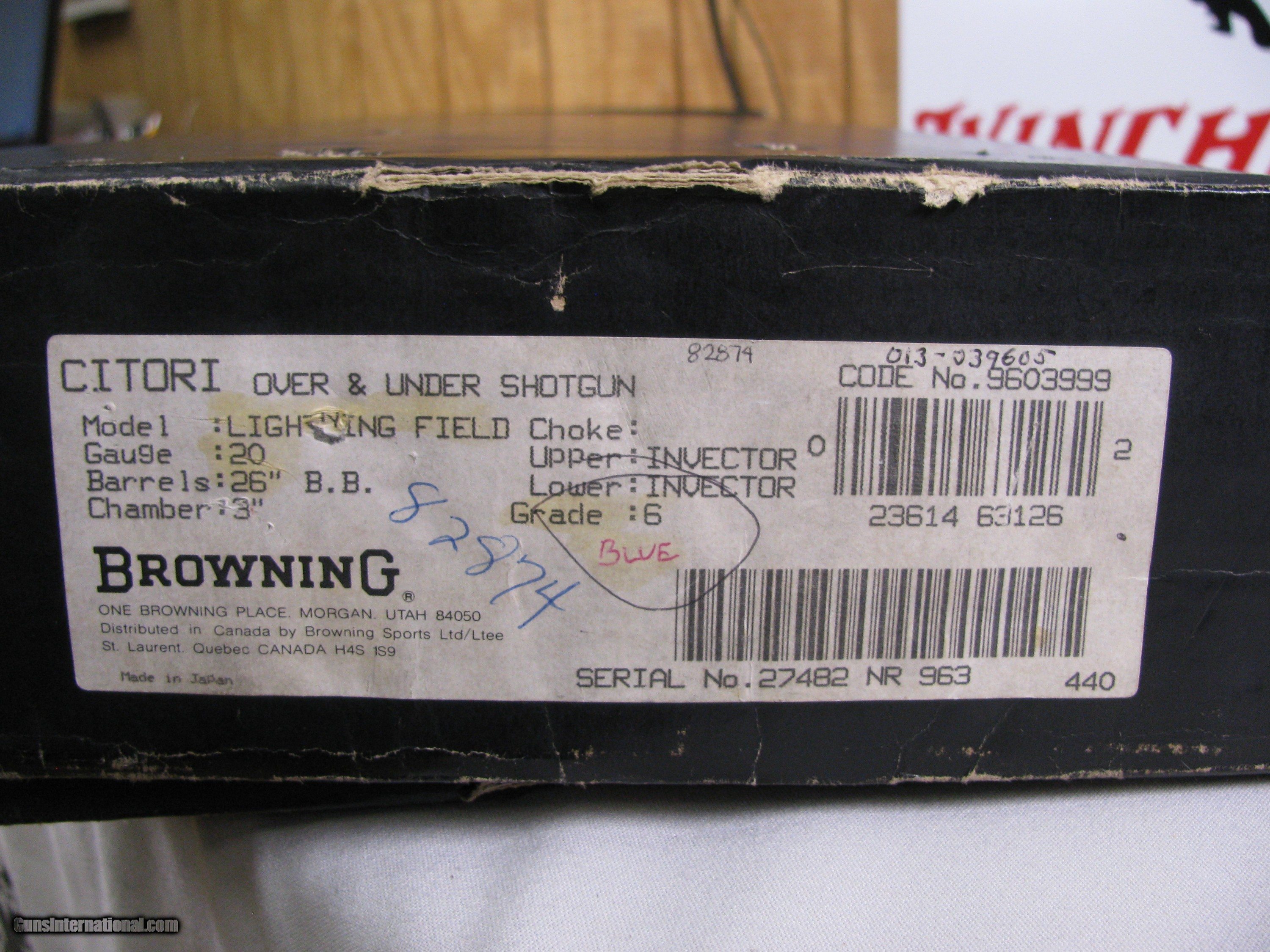Description: 7940 Winchester Browning Citori Lightning Grade 6, 20 GA, 2 ¾ and 3 Inch chambers, Browning Butt Plate, Vent Rib, Ejectors, Possibly unfired, less than 1000 made, 26” Barrells, Invector plus chokes (IC/Mod/Full) with wrench, All paperwork and hang tag, AA Fancy Walnut, Extremely hard to get, this is number 963, has 2 gold Pheasants, 3 gold ducks, 1 gold setter and 1 gold qual SOLD Shotgun Gauge: 20 Gauge |