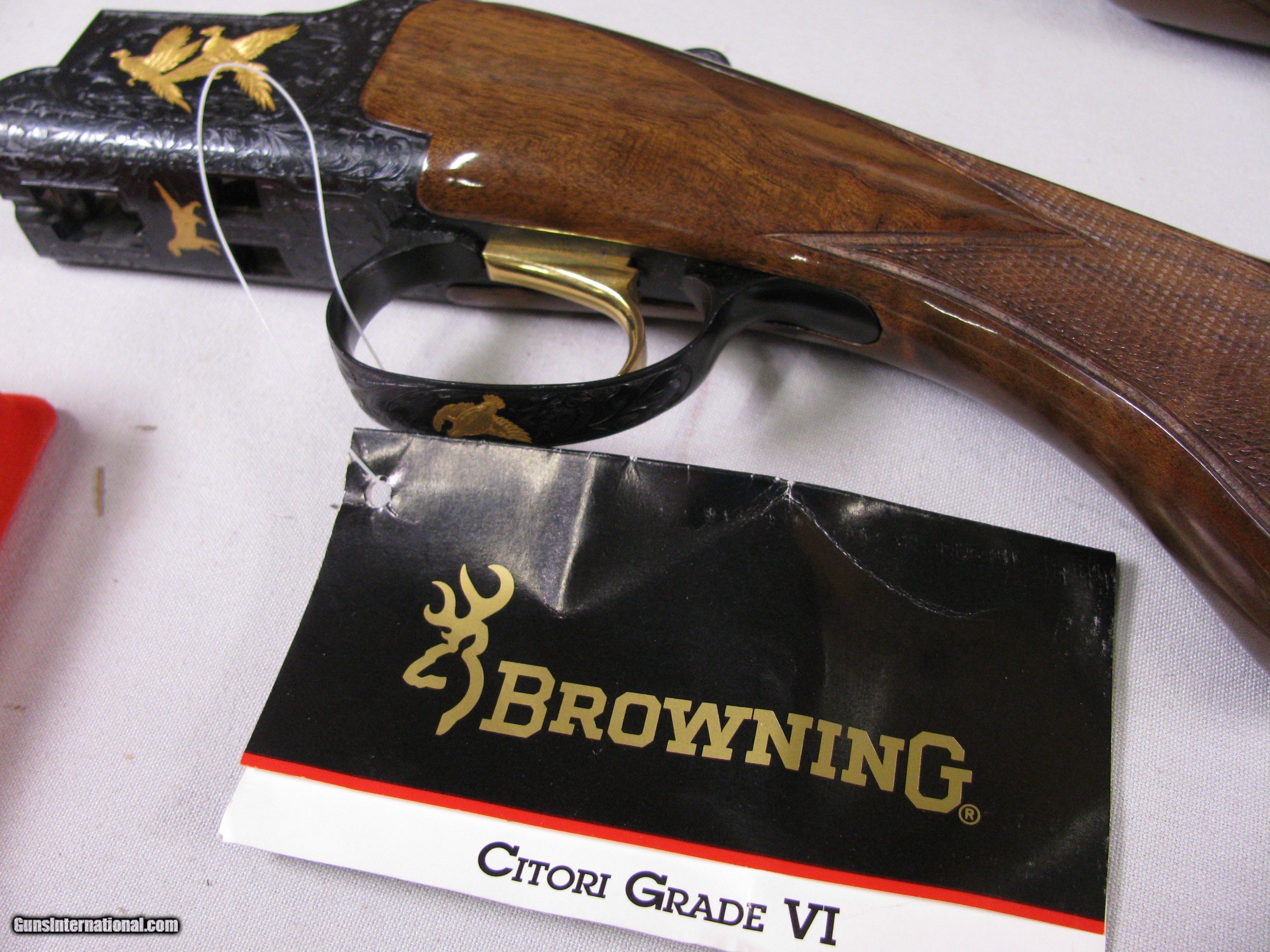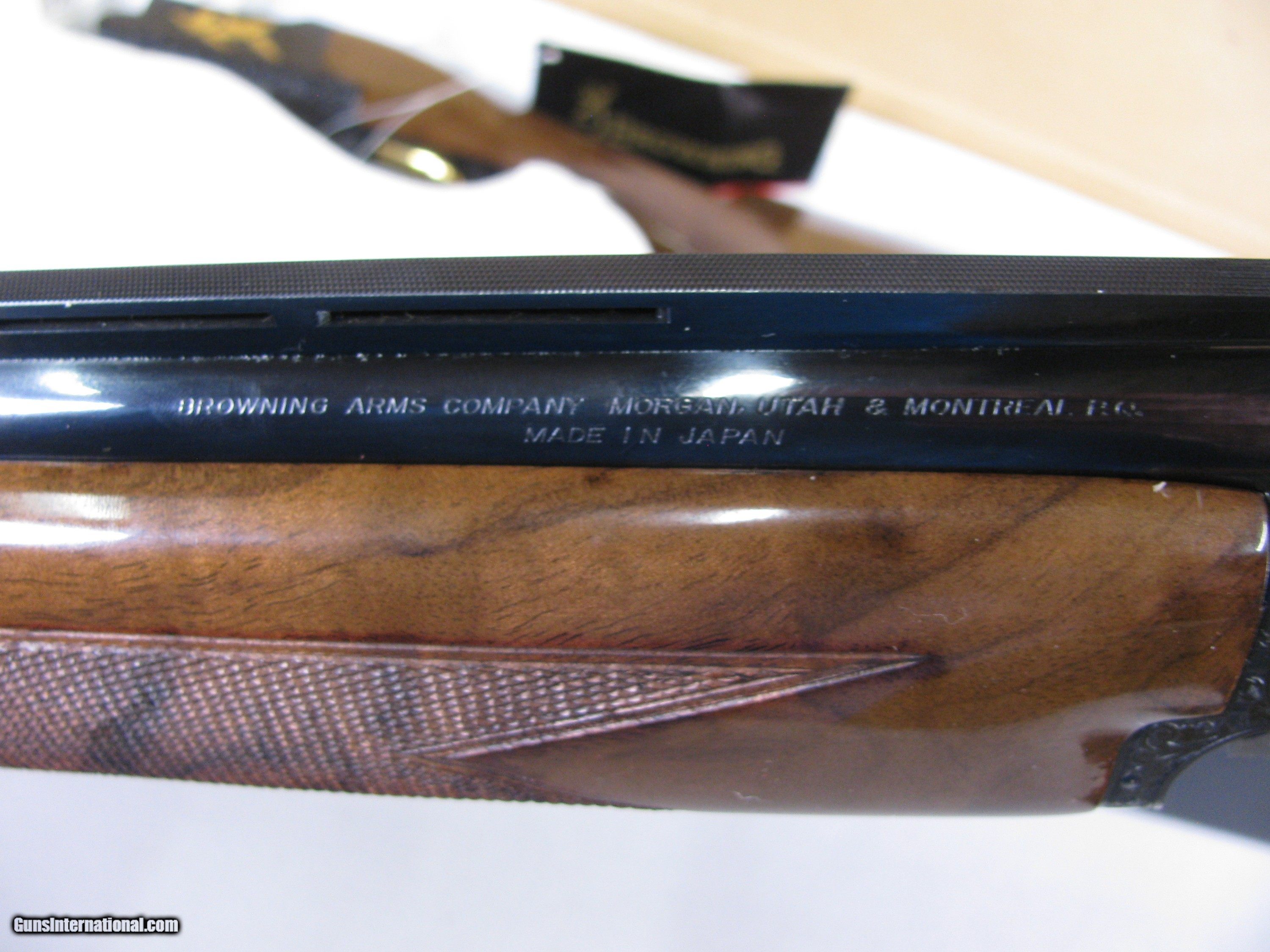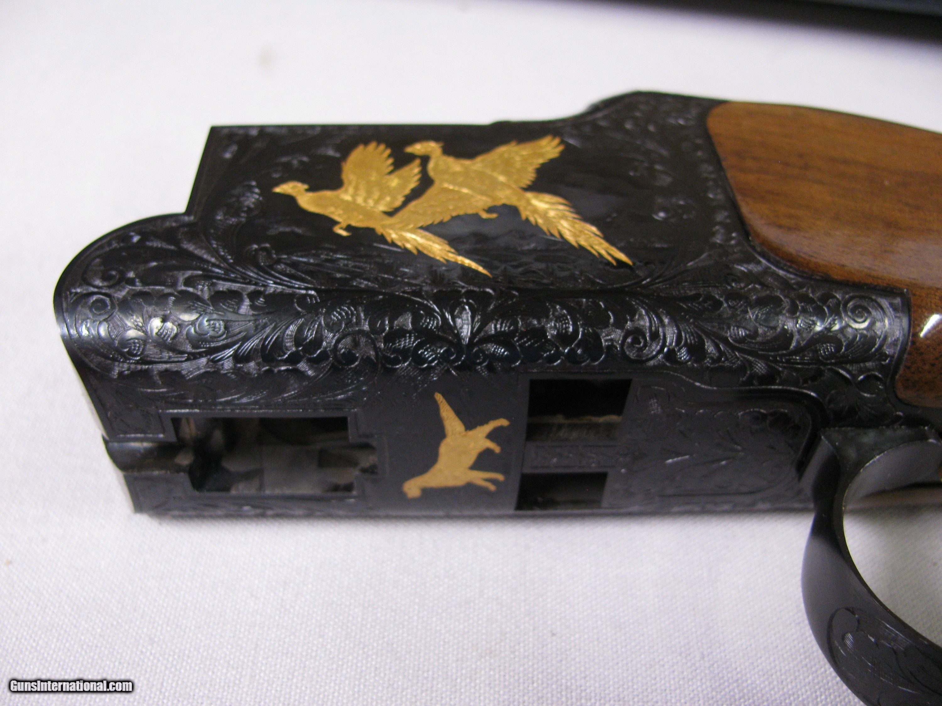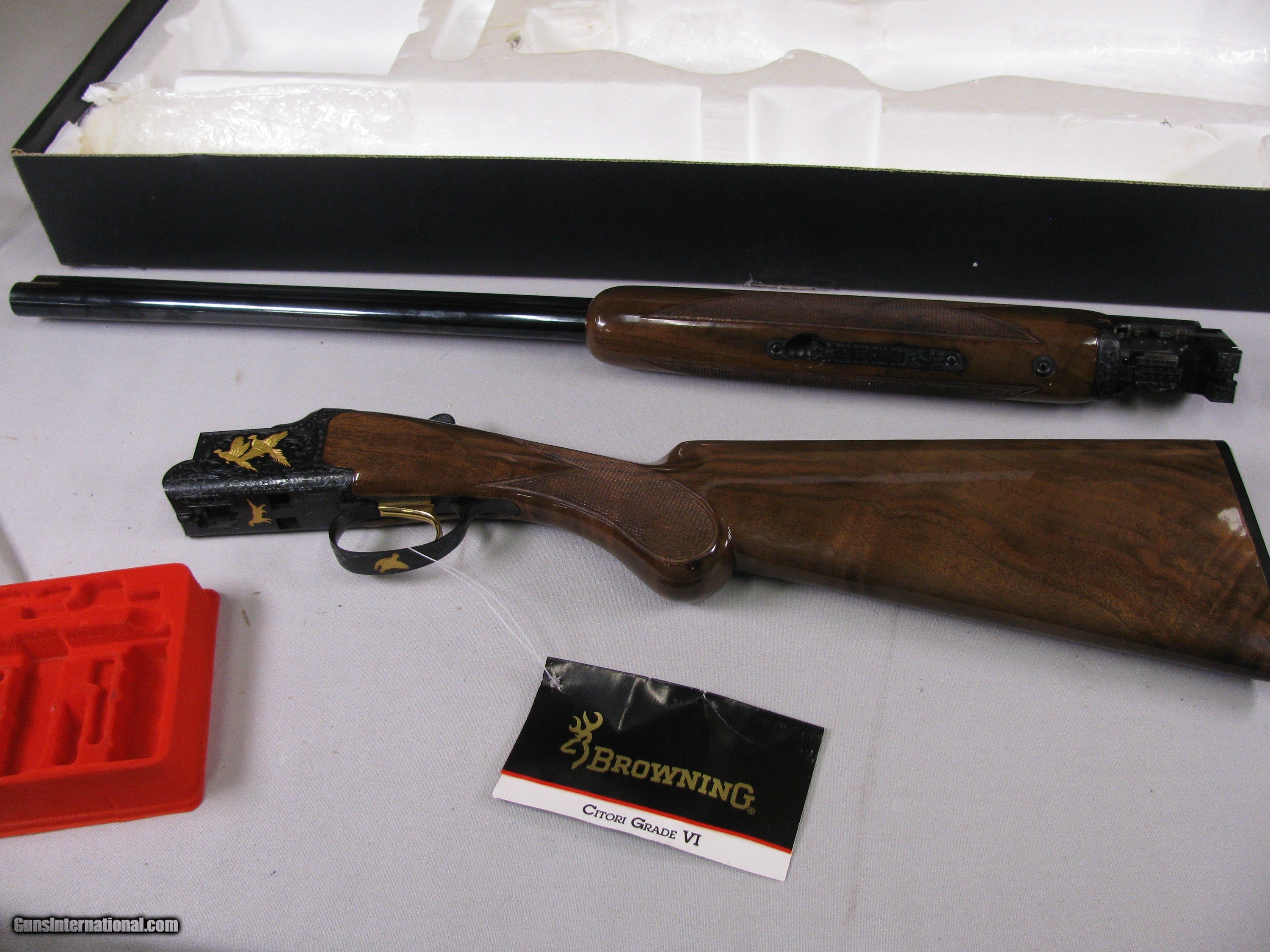 Description: 7940 Winchester Browning Citori Lightning Grade 6, 20 GA, 2 ¾ and 3 Inch chambers, Browning Butt Plate, Vent Rib, Ejectors, Possibly unfired, less than 1000 made, 26” Barrells, Invector plus chokes (IC/Mod/Full) with wrench, All paperwork and hang tag, AA Fancy Walnut, Extremely hard to get, this is number 963, has 2 gold Pheasants, 3 gold ducks, 1 gold setter and 1 gold qual SOLD Shotgun Gauge: 20 Gauge |