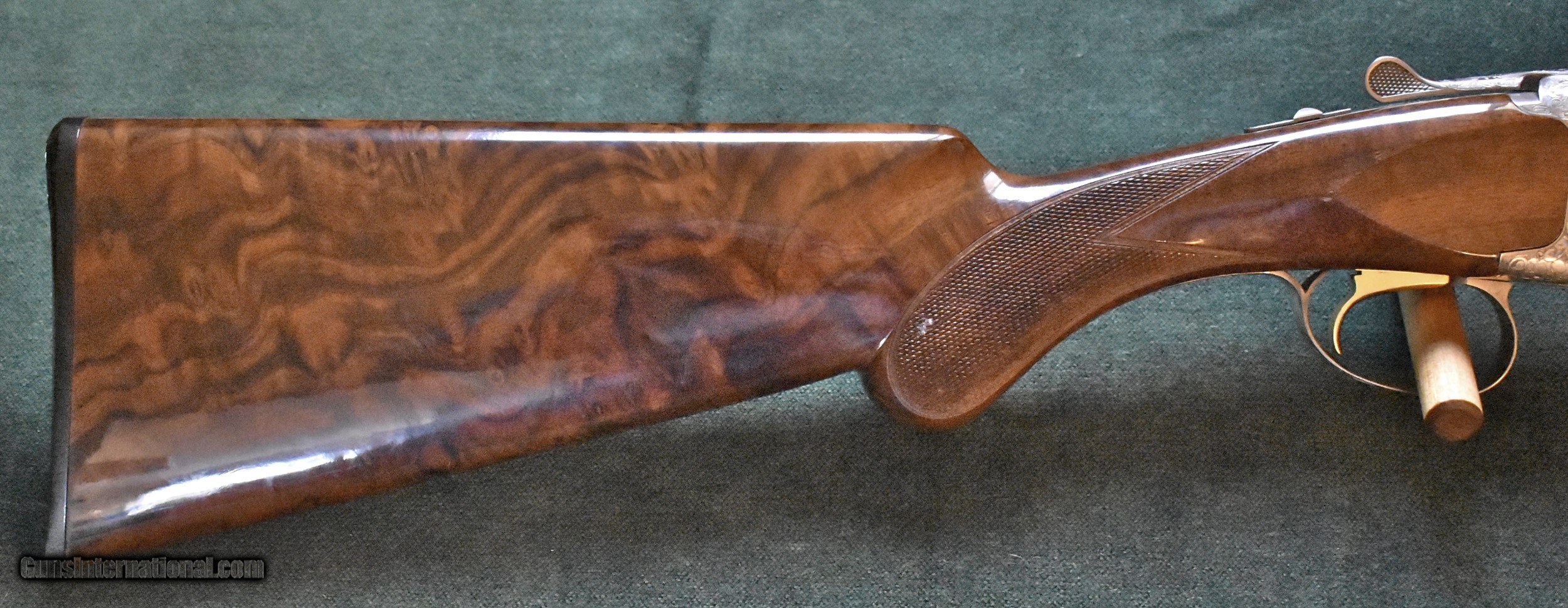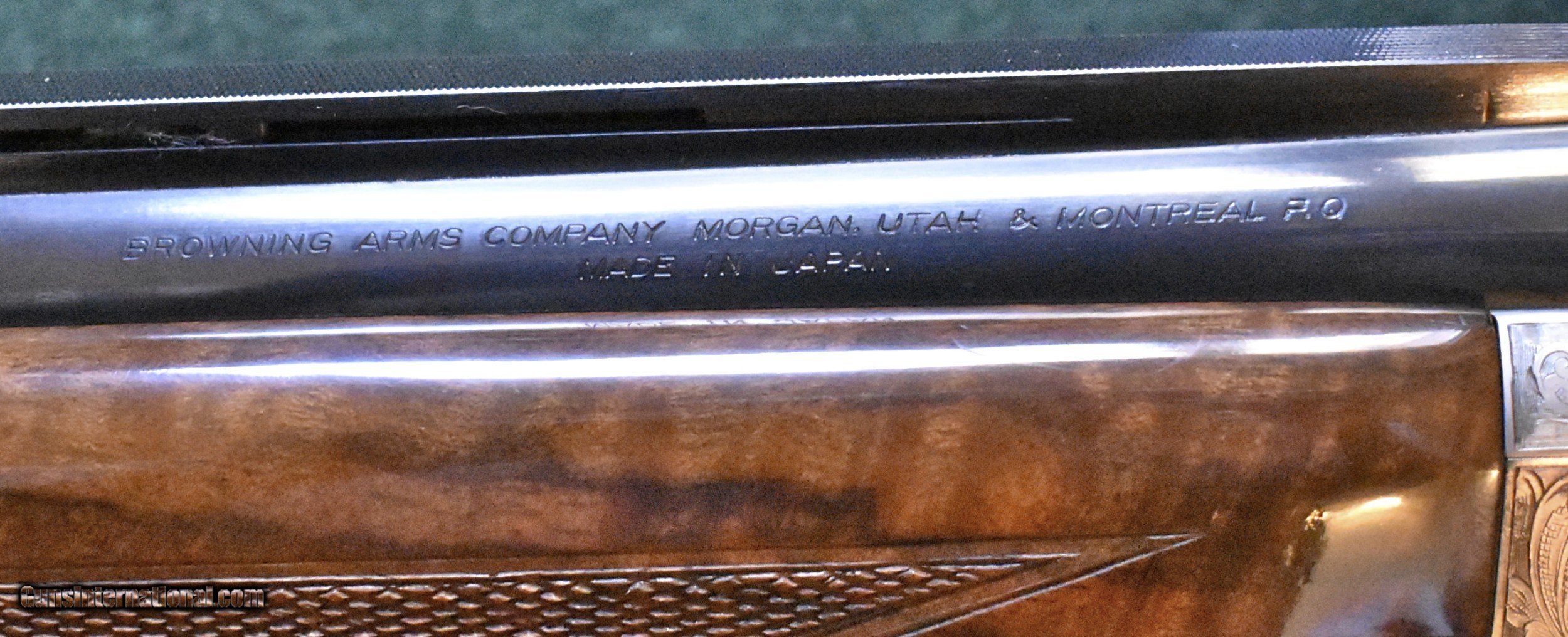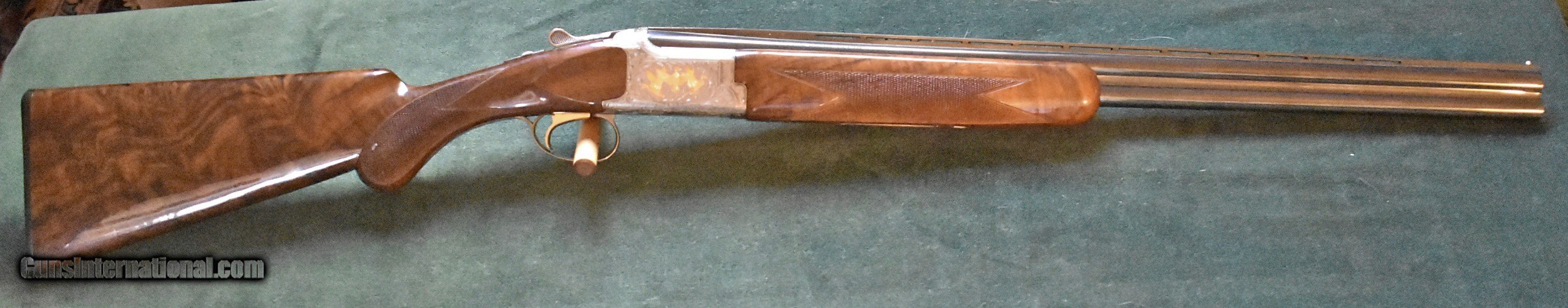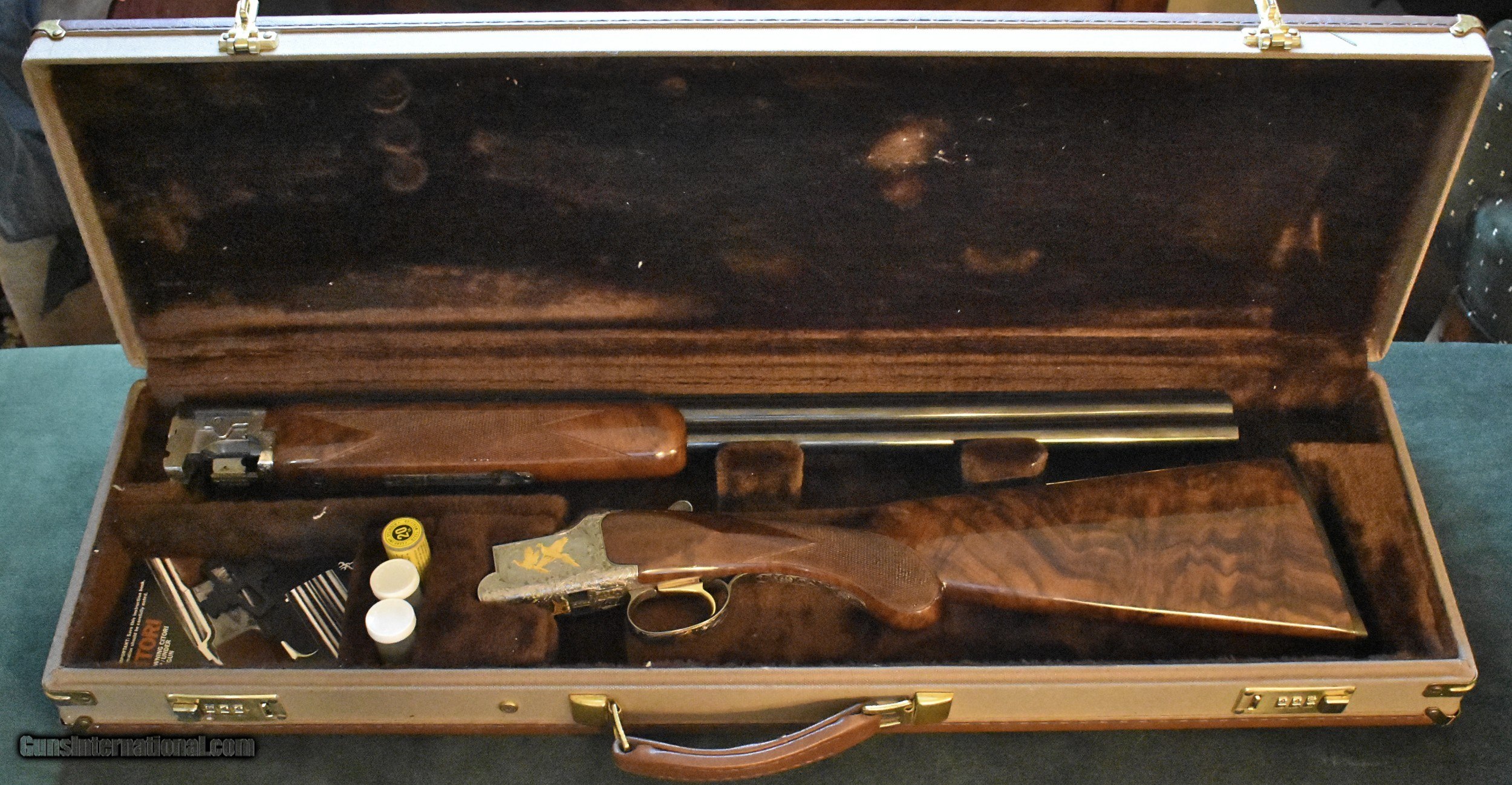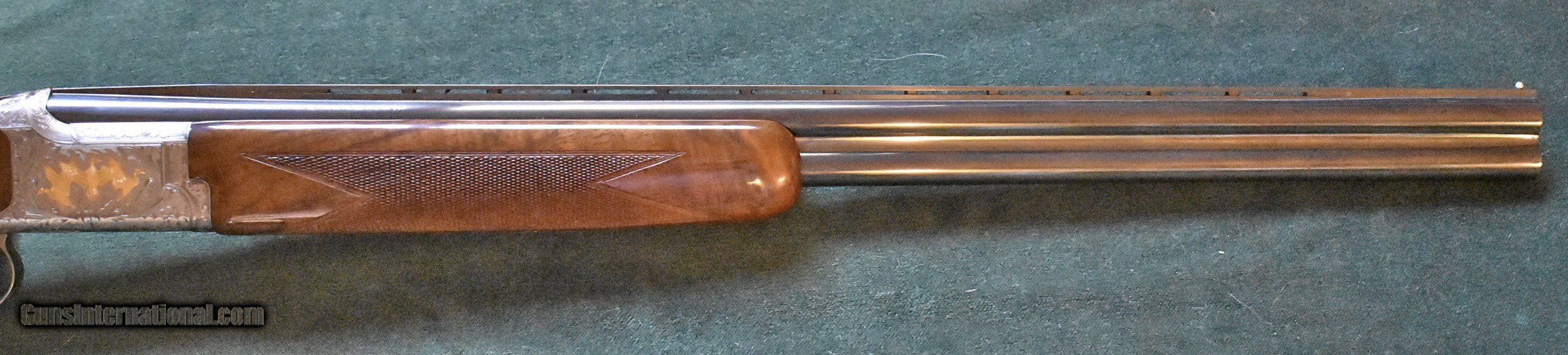Description: Browning 20 gauge grade VI Lightening game gun. Built in 1989,this gun is in outstanding original condition. It retains 100% of the original metal finish and 99% of the original wood finish. The gun has 26" vent rib barrels with invector chokes. The stock and forend are very highly figured walnut and have only a few very small handling marks that keep it from being 100%. The coin finished receiver is fully engraved with deep cut scroll and gold game scenes.The gun has been fired less than 100 times since it was purchased new. The weight is 6-4 and the stock dimensions are 141/8"LOP,11/2" at comb,and 21/2" at heel. The gun is cased in a Browning luggage case with the manual and 5 invector chokes. A great little upland bird gun. SOLD Shotgun Gauge: 20 Gauge Manufacturer: Browning (Japan) Model: Citori Grade VI Serial Number: 24545PN963 Barrel Length: 26 Chambers: 23/4" & 3 Ejectors: yes Condition: mint Metal Condition: mint Wood Condition: mint Bore Condition: mint Barrel Type: Browning Special Steel Action: over under Triggers: single selective Stock Dimensions: 141/8"x11/2"x21/2 Butt Pad: factory buttplate Weight: 6-4 Manufacture Date: 1989 Chokes: invector chokes Case: factory case |