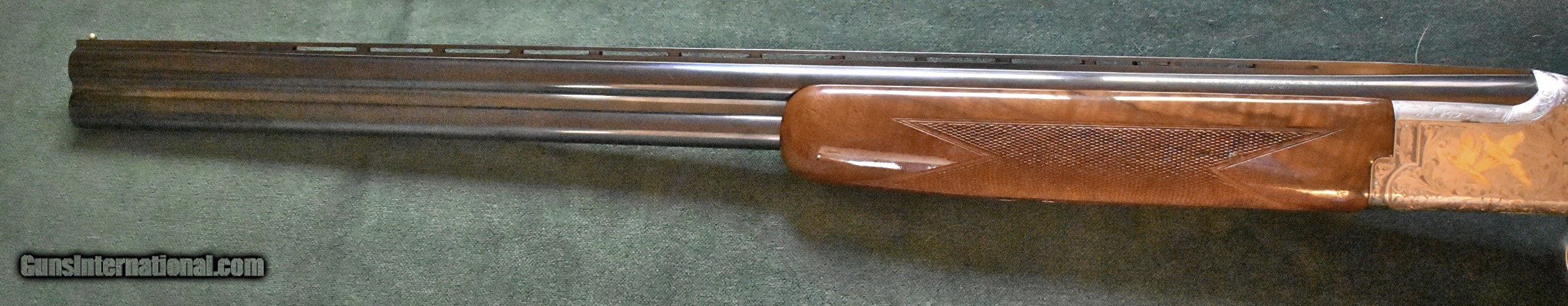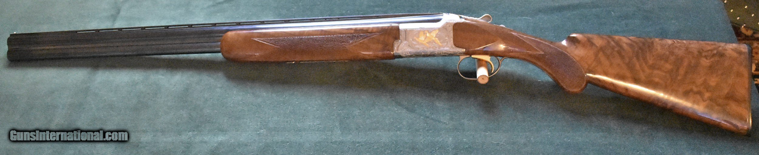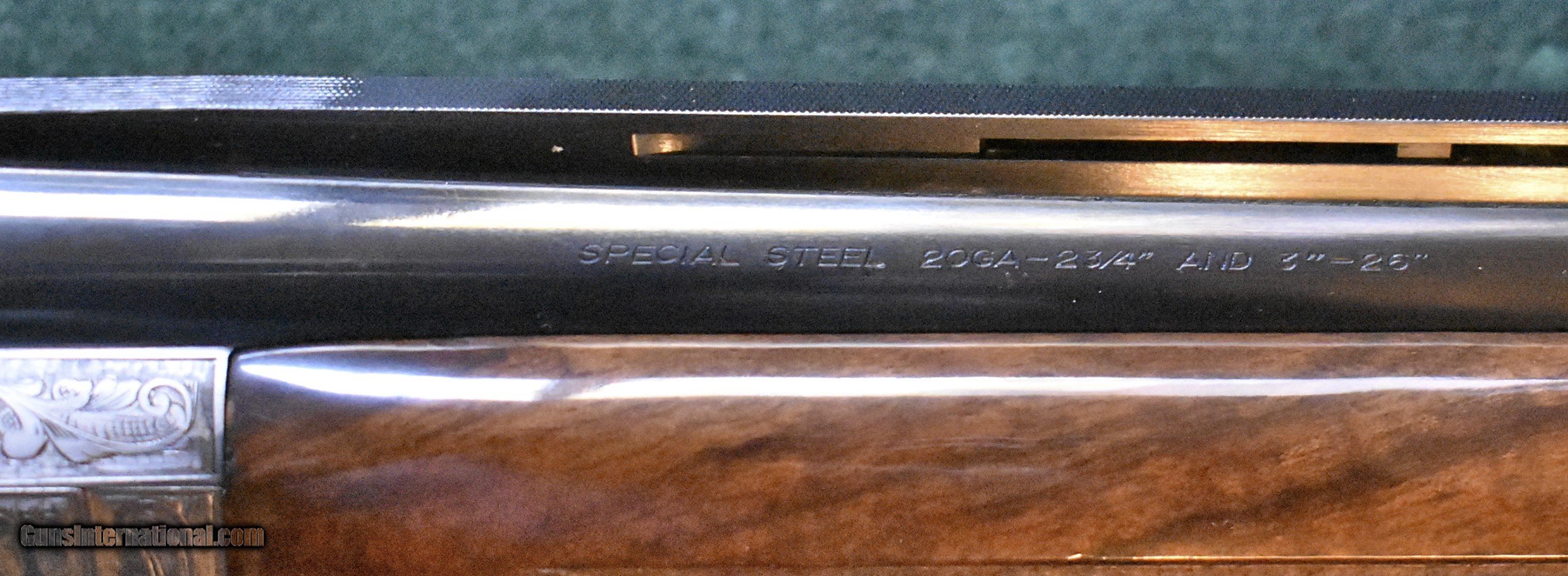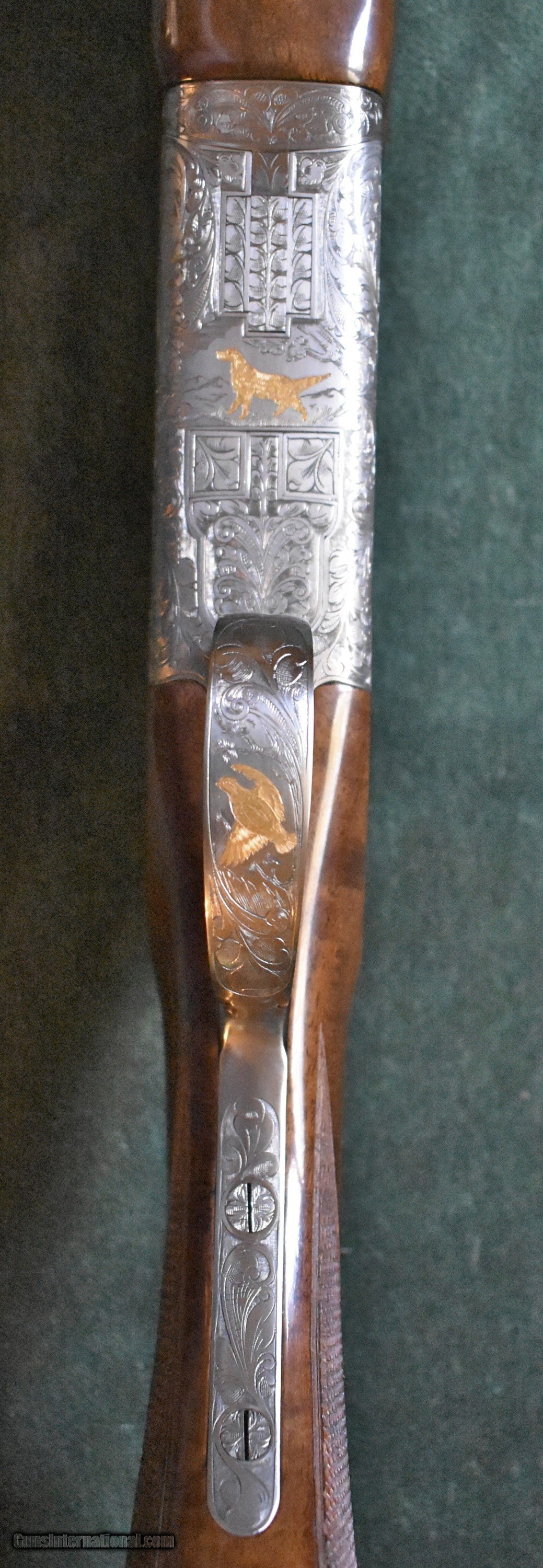 Description: Browning 20 gauge grade VI Lightening game gun. Built in 1989,this gun is in outstanding original condition. It retains 100% of the original metal finish and 99% of the original wood finish. The gun has 26" vent rib barrels with invector chokes. The stock and forend are very highly figured walnut and have only a few very small handling marks that keep it from being 100%. The coin finished receiver is fully engraved with deep cut scroll and gold game scenes.The gun has been fired less than 100 times since it was purchased new. The weight is 6-4 and the stock dimensions are 141/8"LOP,11/2" at comb,and 21/2" at heel. The gun is cased in a Browning luggage case with the manual and 5 invector chokes. A great little upland bird gun. SOLD Shotgun Gauge: 20 Gauge Manufacturer: Browning (Japan) Model: Citori Grade VI Serial Number: 24545PN963 Barrel Length: 26 Chambers: 23/4" & 3 Ejectors: yes Condition: mint Metal Condition: mint Wood Condition: mint Bore Condition: mint Barrel Type: Browning Special Steel Action: over under Triggers: single selective Stock Dimensions: 141/8"x11/2"x21/2 Butt Pad: factory buttplate Weight: 6-4 Manufacture Date: 1989 Chokes: invector chokes Case: factory case |