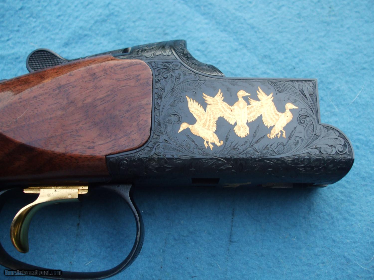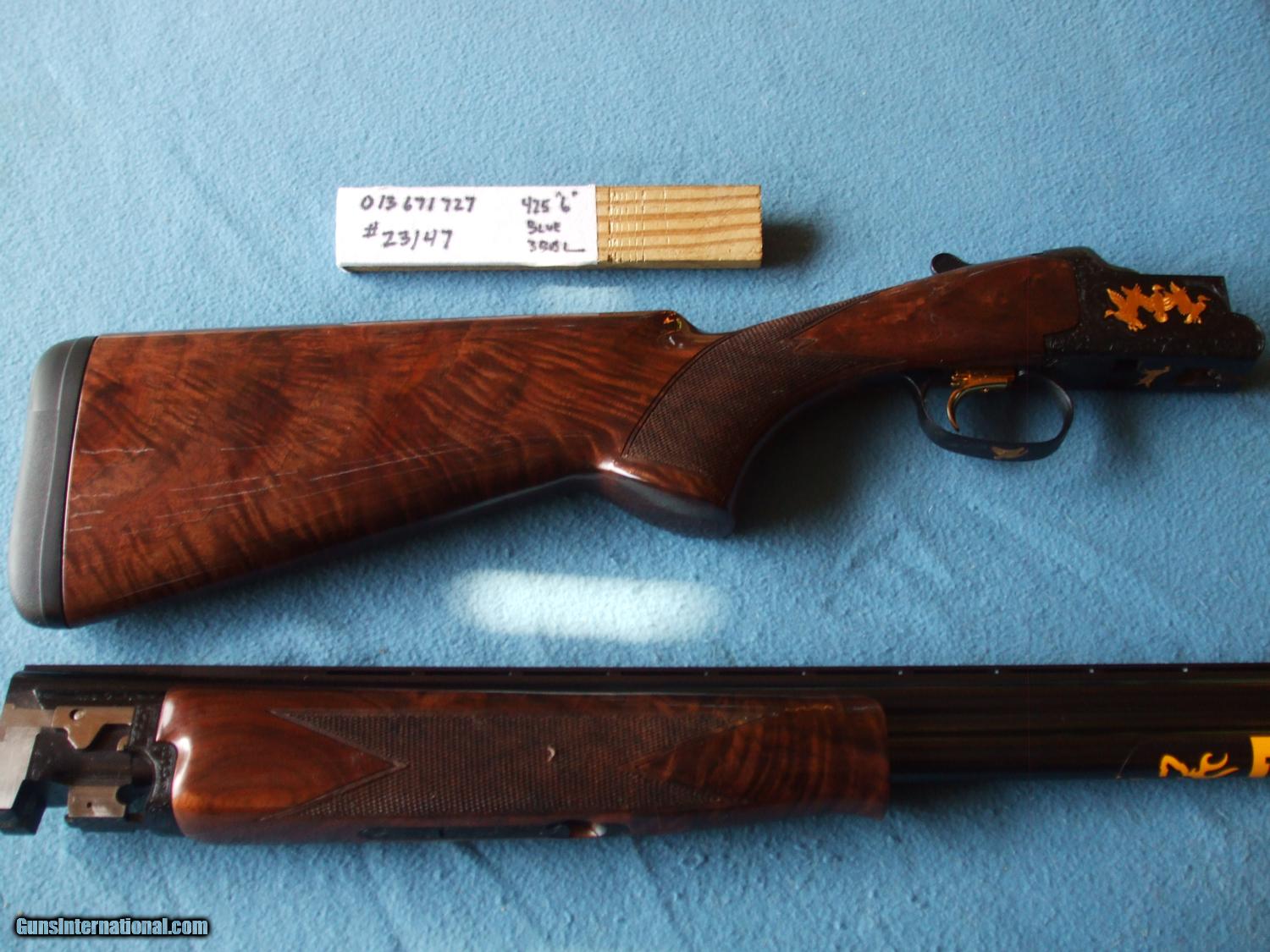 Description: Browning 425 sporting grade 6 3 barrel set with blue reciever. All barrels are 30" in length with flush factory screw in choke tubes. Browning's classic grade 6 pattern includes 3 rising ducks in gold one one side, 2 pheasants in gold on the other, a pointing dog on the under side of the receiver in gold and a quail on the trigger guard in gold with deep relief engraving for the background. High gloss blue finish. High gloss blue finish and fancy amercian walnut stock and forend. 20 and 28 barrels have 425 10mm rib with double white beads. 410 barrel has 6mm rib with double white beads. 20ga barrels are invector plus choked with 4 tubes 1-skeet 2-ic and 1-mod. 28 and 410 are invextor choked with 4 tubes 1-skeet 2-ic 1-mod for each barrel. 410 barrels are 3" chamber. Stock supplied with Browning inflex pad. The set comes with Browning leather luggage case pictured below. SOLD Manufacturer: Browning Model: 425 grade 6 3 barrel Serial Number: 23147zw131 Chambers: 2 3/4" 410-3 Ejectors: yes Condition: new Metal Condition: new Wood Condition: new Bore Condition: new Barrels: 30 Barrel Type: o/u Action: citori Triggers: 3 point adj Gauge Info: 20-28-410 Stock: high grade walnut Stock Comb: 1 1/2 Stock Heel: 2 3/8 Stock Cast: right hand Fore End: schnabel Butt Pad: inflex sporting LOP: 14 3/4 Rib: 10mm/6mm Finish: high gloss Weight: 7-7lbs 2oz Sights: double white Manufacture Date: 2015 Chokes: inv and inv+ Engraving: grade 6 Case: Browning case |