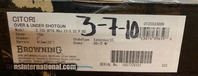 Description: Browning 725 Sporting 12g 32" Super clean. All original. Exceptionally well cared for. Maybe some minor handling marks. Call or email for additional information. SOLD Shotgun Gauge: 12 Gauge Manufacturer: Browning Model: 725 Pro Sporting Serial Number: 18377ZV131 Barrel Length: 32 Chambers: 3 Ejectors: Yes Condition: Excellent Metal Condition: Excellent Wood Condition: Excellent Bore Condition: Excellent Barrels: 32" ported Triggers: Single Selective Stock: Adjustable Comb- Factory Stock Comb: Adjustable Stock Heel: Adjustable Stock Cast: Neutral Butt Pad: Factory Inflex LOP: 14 7/8 Rib: Vent Sights: Hi-Viz Pro-Comp Ivory Mid-bead Chokes: Nine Extras: Choke cases, Sleeves, Factory box and accessories |