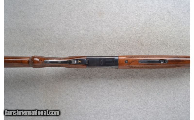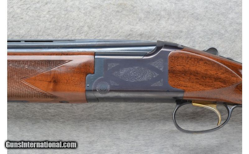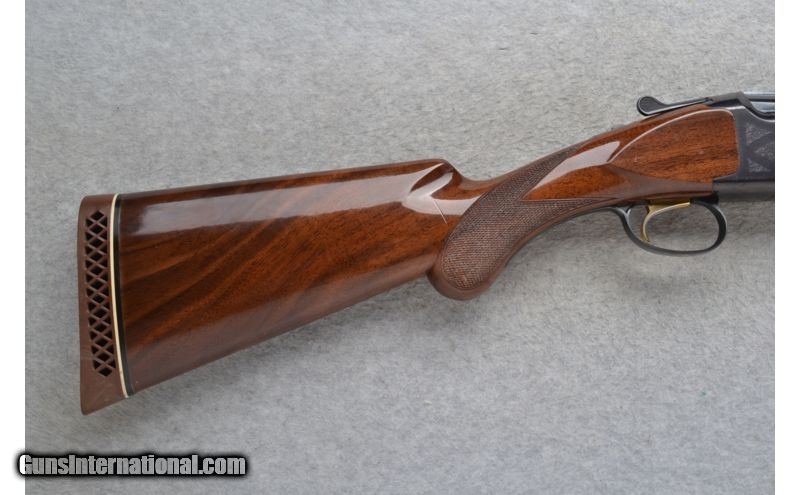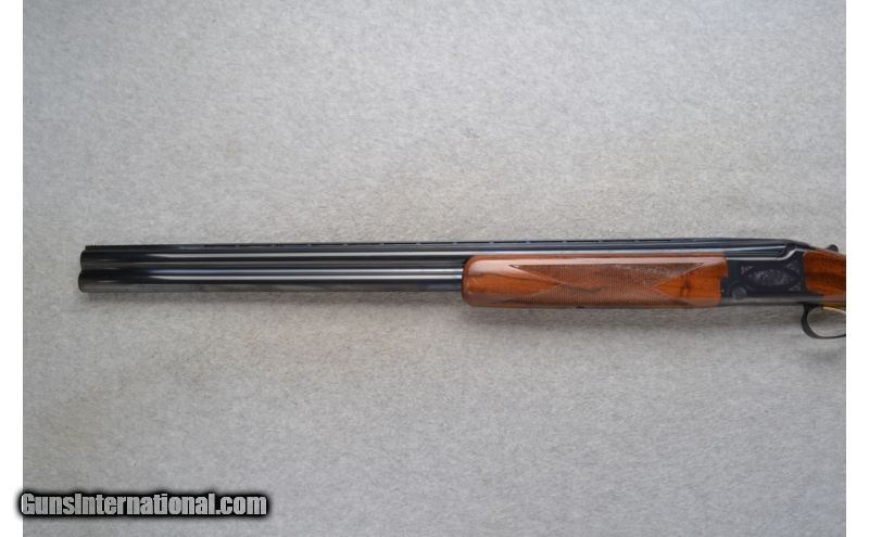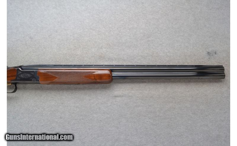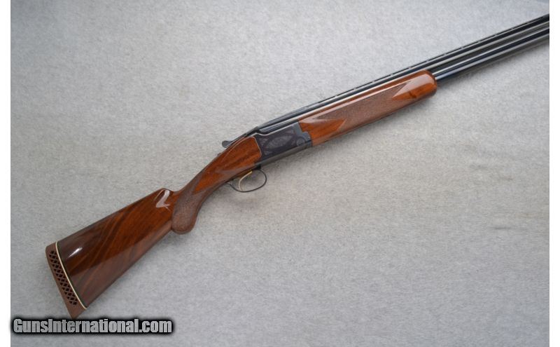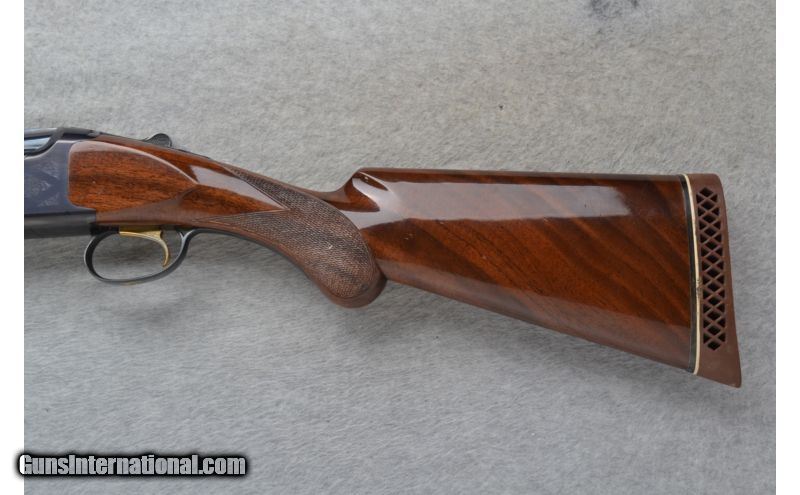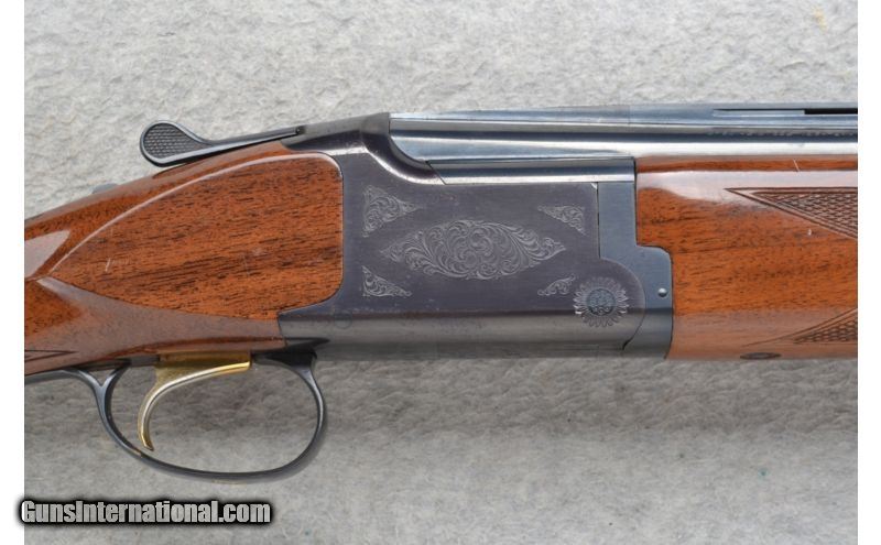Description: This Browning Model Citori is a 12 Ga. over and under shotgun. It has 28 inch barrels with ejectors and a top barrel ventilated rib. A metal front bead sight. With 3 inch chambers it has Invector Choke and comes with two choke tubes. The stock is a checkered walnut round knob pistol grip. The receiver is lightly engraved. SOLD Manufacturer: Made in Japan. Caliber Info: 12 Ga. Chambers: 2 3/4 inch or 3 inch Over/ Under with ejectors. Metal Condition: Very good. A few very minor handling marks and minor receiver freckling. Wood Condition: Good. Has multiple handling marks. Bore Condition: Bright and shiny. Barrels: 28 inch blued with a top barrel ventilated rib. Triggers: Single Golden. SST. Stock: Checkered walnut round knob grip. Stock Dimensions: LOP 13 3/8 inches. Fore End: Checkered grip walnut. Butt Pad: Browning brown rubber recoil pad. Weight: 7 lbs. 14 oz. Sights: Metal front bead. Chokes: Invector Choke. Comes with Full and Modified choke tubes. Item Location: Richfield, WI |