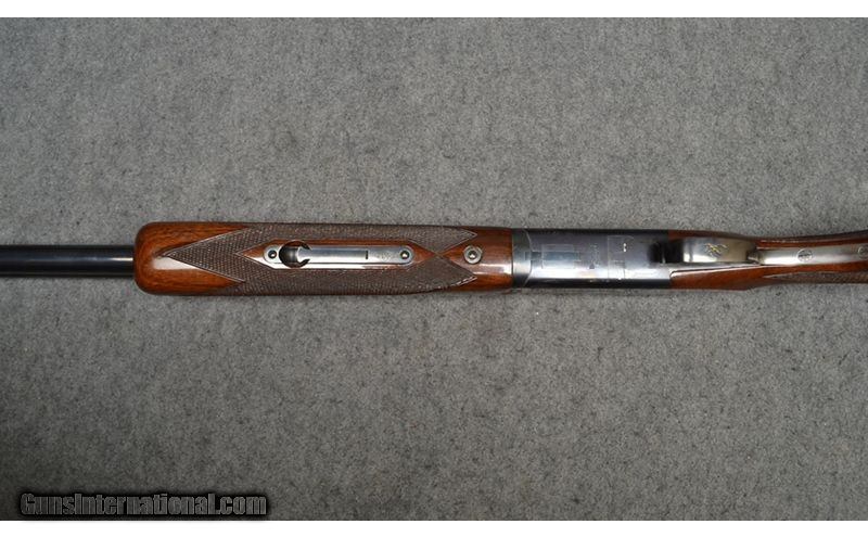 Description: This 1986 over/under shotgun is a Browning Citori chambered in 12 GA (2¾ and 3"). It has a blued and scroll engraved boxlock action, auto ejectors, vent rib, checkered semi-pistol grip stock with grooved semi-beavertail forearm, gold-plated trigger, front brass bead sight, and an aftermarket adjustable butt pad. It is in overall very good condition metal and furniture, with some loss of bluing on the sharp edges of the muzzle end. The wood shows only minor handling wear marks. It comes with six choke tubes total (Imp Cyl, Skeet, Full, Modified, Cylinder (2X)). 12 Gauge SOLD Chambers: 2¾ and 3 Metal Condition: Bluing good overall with some wear at muzzle end of barrels Wood Condition: Only light observable handling wear to the furniture Bore Condition: Bright and shiny Barrels: 30 inch Triggers: Gold-plated trigger Stock Dimensions: Overall length 47 inches Fore End: Checkered Wood Fore End Butt Pad: After market adjustable butt pad (Kick EEZ) Weight: 8 lb - 4 oz Sights: Front Brass bead sight Chokes: "6 choke tubes total (Imp Cyl, Skeet, Full, Modified, Cylinder (2X)) Item Location: Wichita, KS |