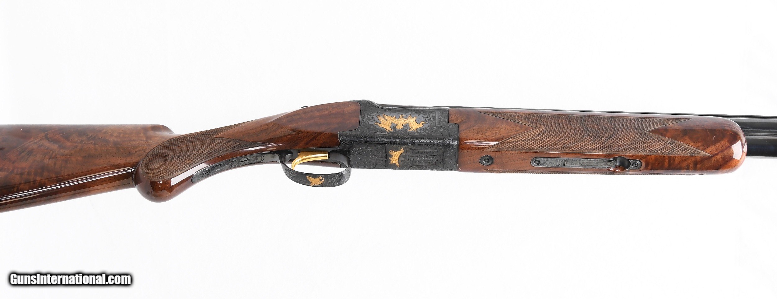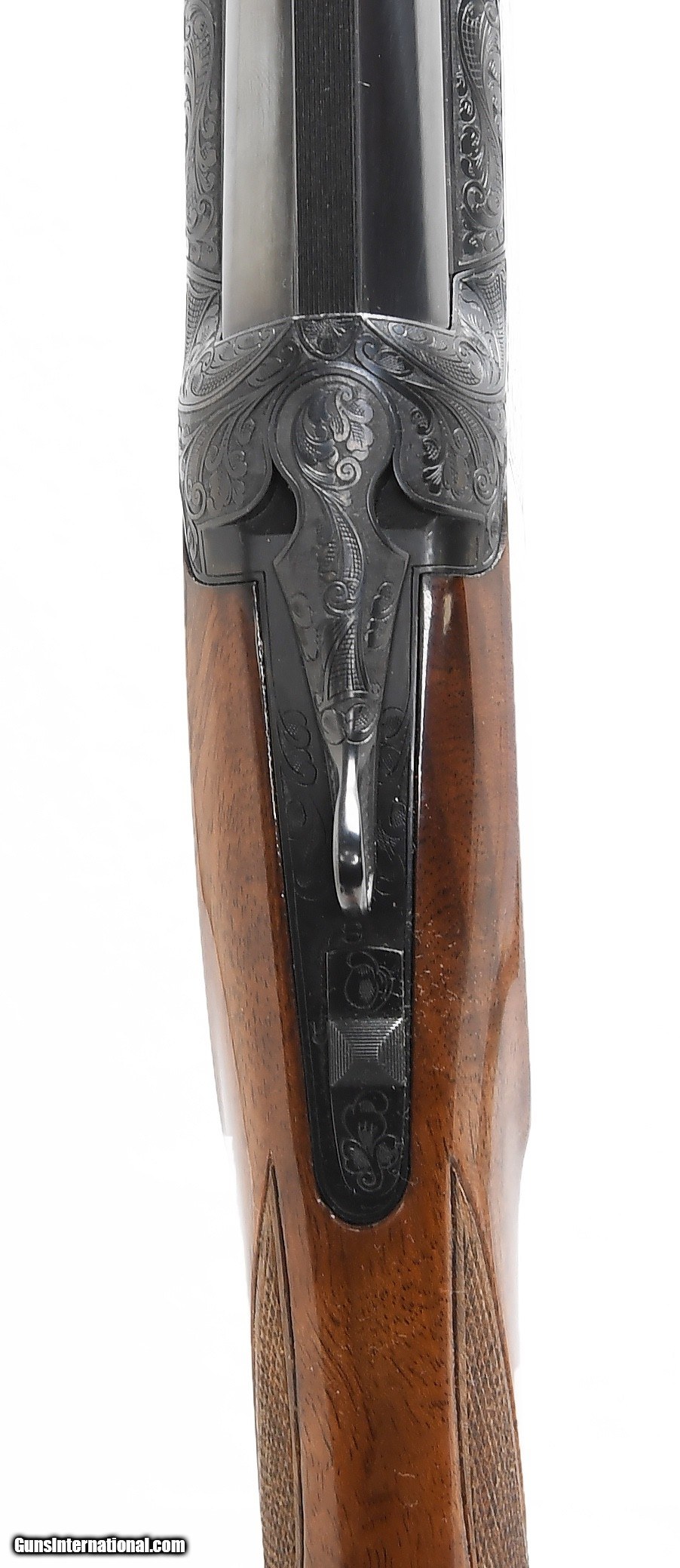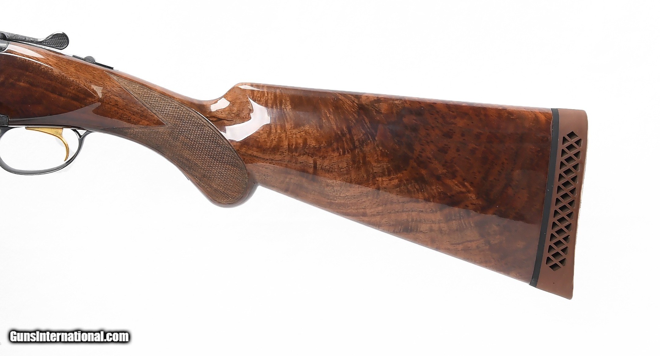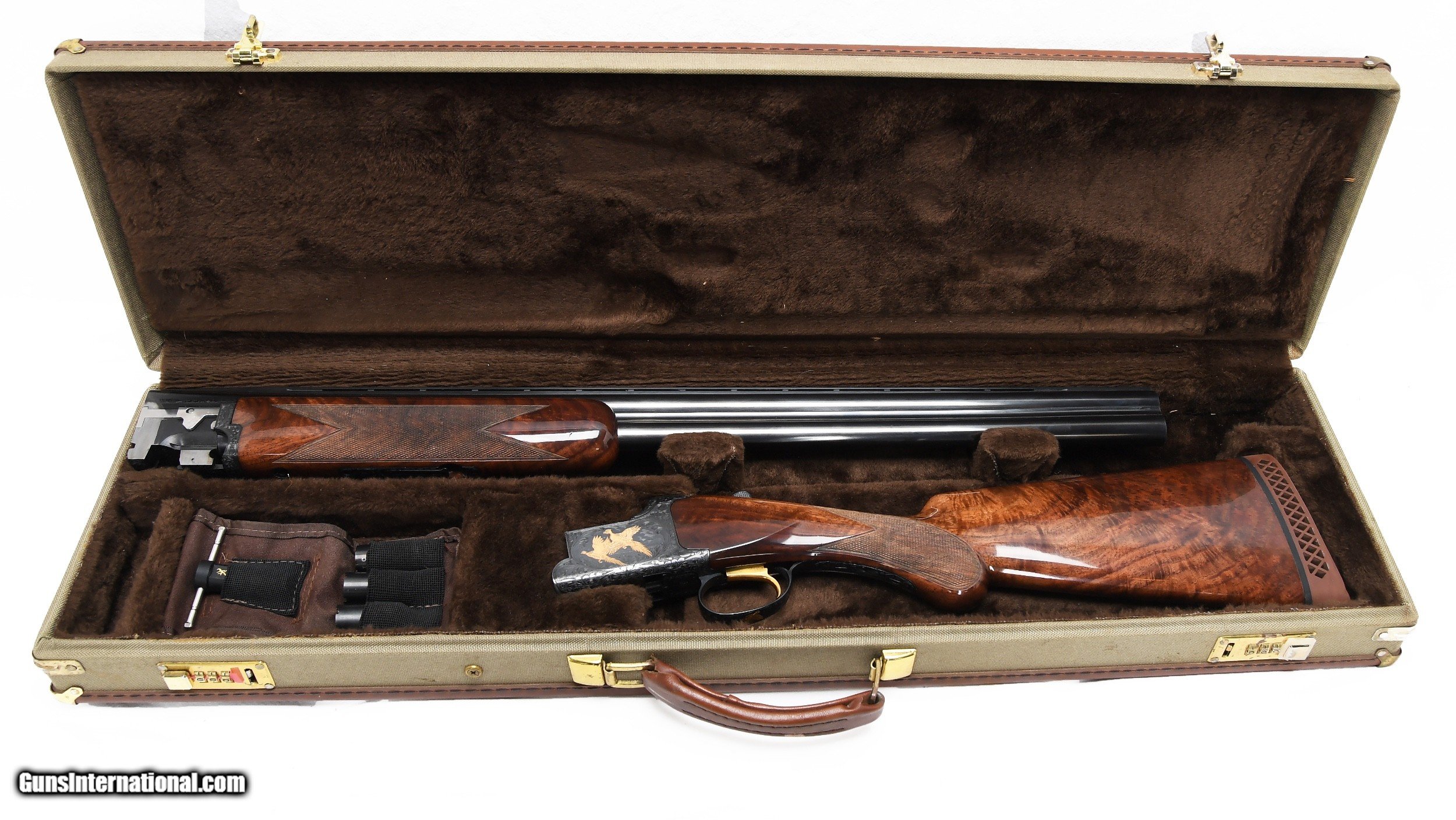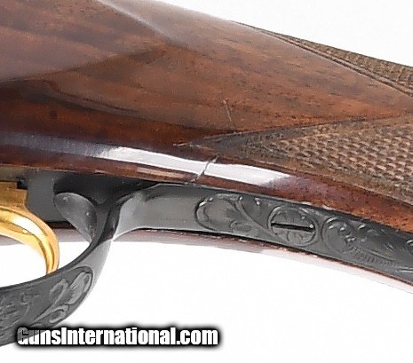 Description: Browning Citori Lightning Hunter Gr VI 12 gauge O/U shotgun with Invector Chokes. Made in 1992 this model has long tang trigger guard with round pistol grip, narrow field forearm, and standard Invector chokes. 28” barrels with vent rib and chambered for 2 ¾” & 3” shells. Single selective trigger. Grade VI game scene engraving on a blue frame with gold birds. The stock and forearm and made from highly figured walnut. The length of pull is 14 ¼” with 1 ½ DAC and 2 ½” DAH and a slight cast favoring a right hand shooter. Weight is 8 lbs. 4 oz. The gun balances nicely between the hands. All finishes are original and in 98%+ condition with the single exception of a small crack near the bottom tang on the left side of the pistol grip (see photo). The gun comes cased in a Browning luggage case the other three choke tubes and wrench. $3,100.00 SN: 14631NY953 SOLD |