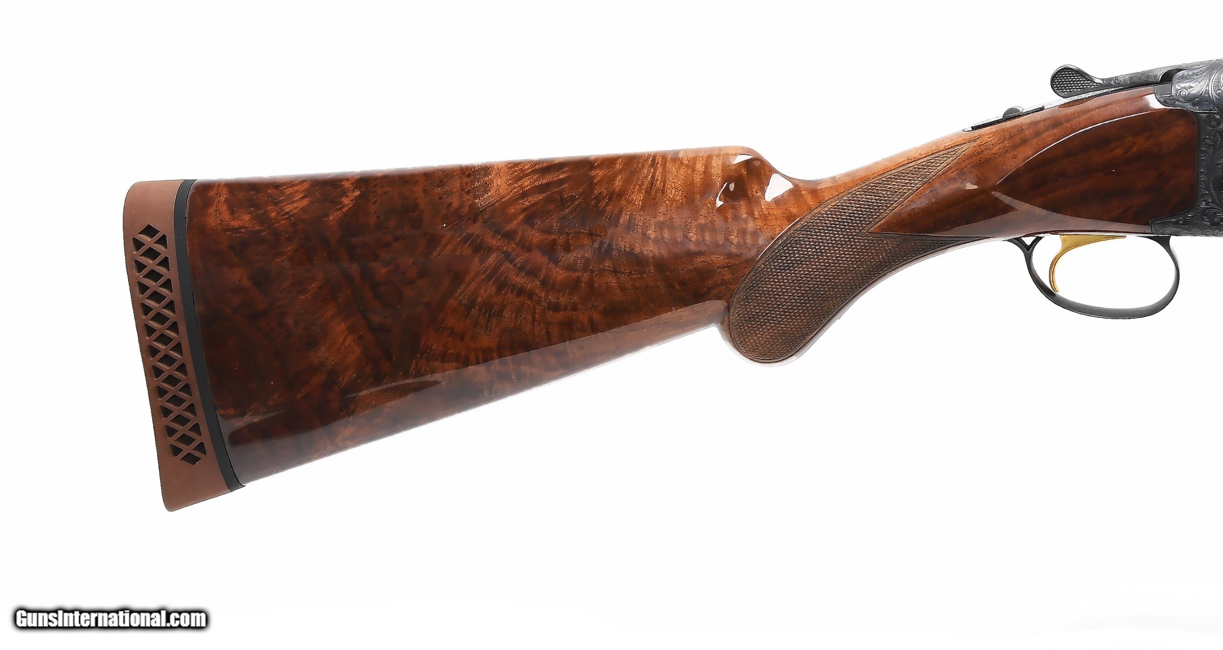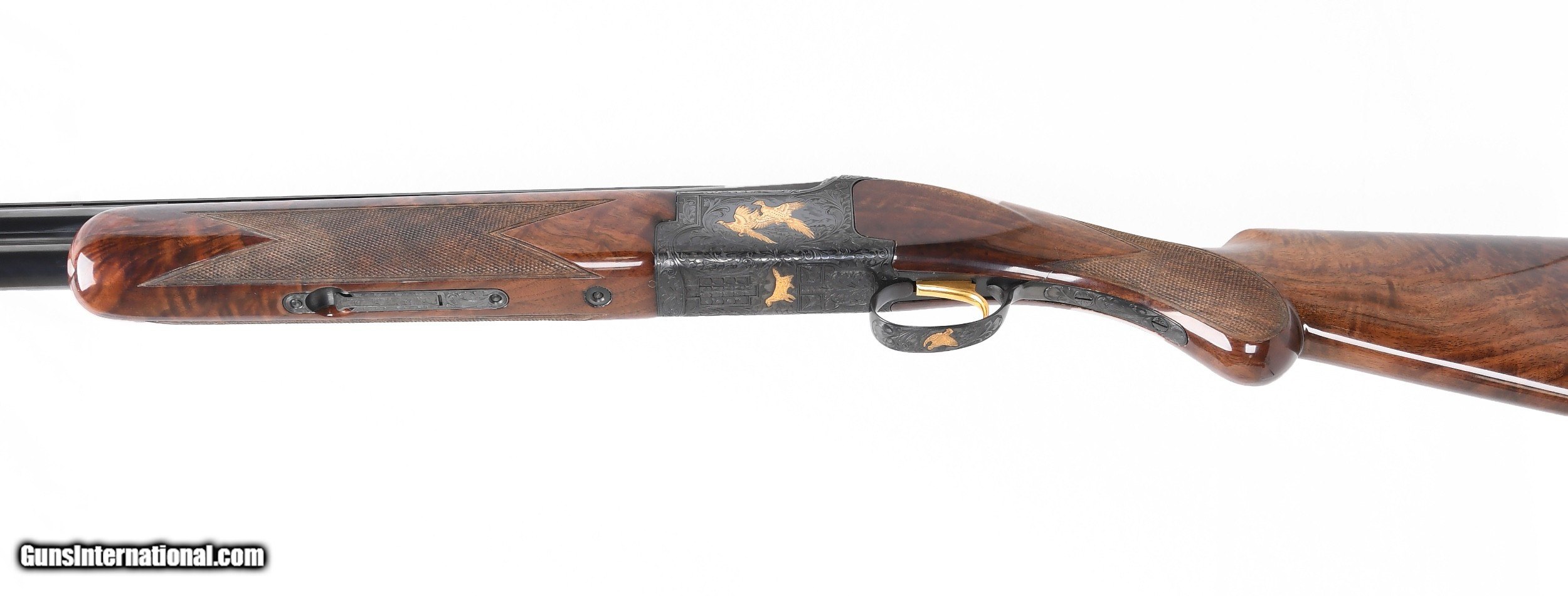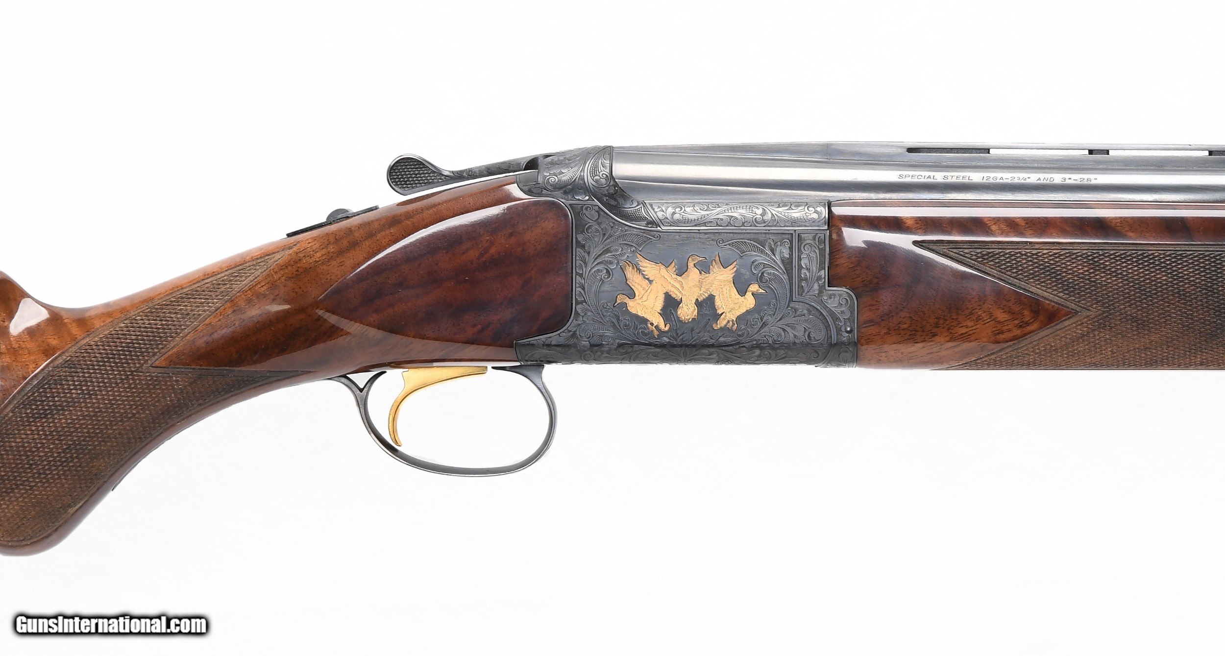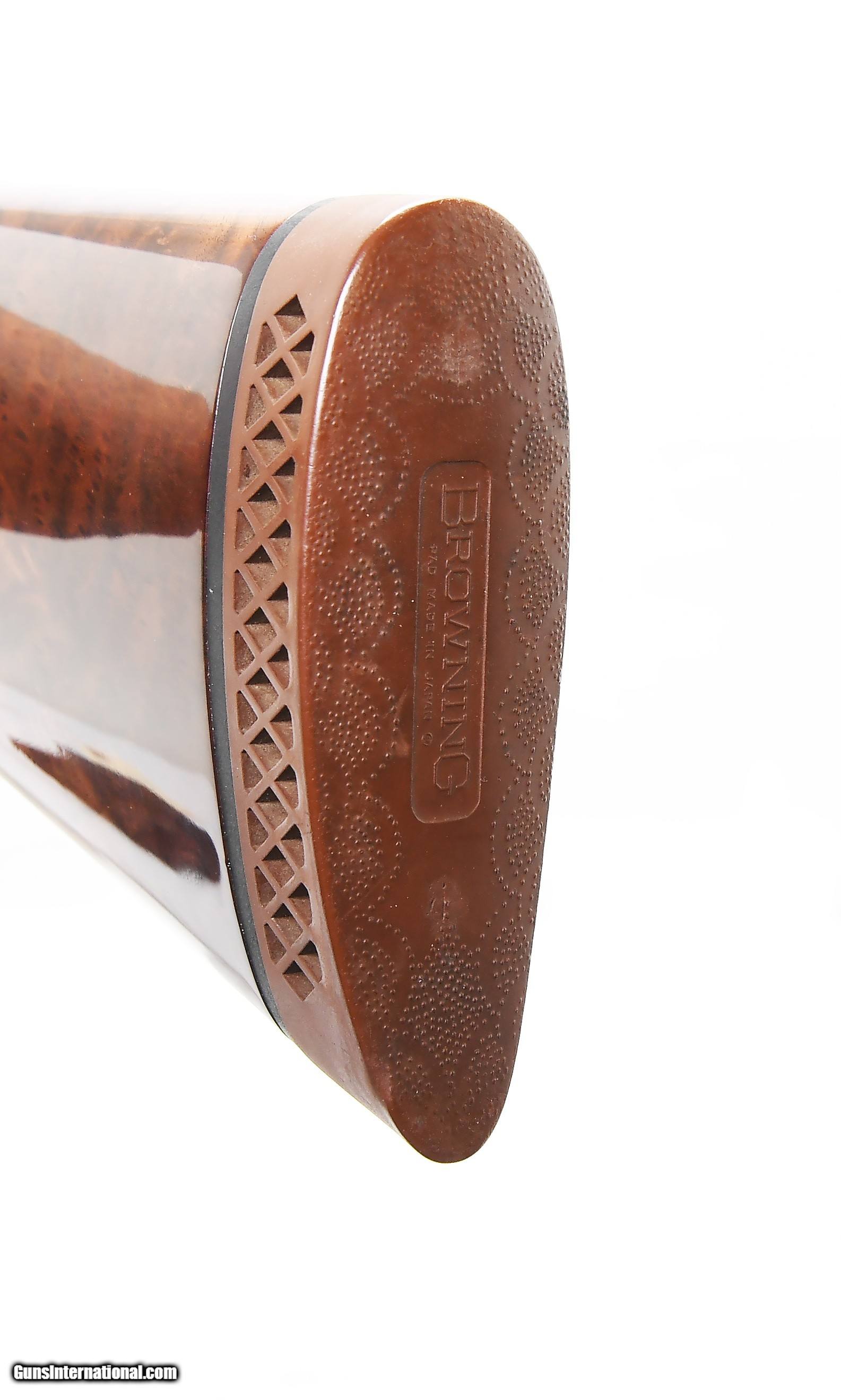 Description: Browning Citori Lightning Hunter Gr VI 12 gauge O/U shotgun with Invector Chokes. Made in 1992 this model has long tang trigger guard with round pistol grip, narrow field forearm, and standard Invector chokes. 28” barrels with vent rib and chambered for 2 ¾” & 3” shells. Single selective trigger. Grade VI game scene engraving on a blue frame with gold birds. The stock and forearm and made from highly figured walnut. The length of pull is 14 ¼” with 1 ½ DAC and 2 ½” DAH and a slight cast favoring a right hand shooter. Weight is 8 lbs. 4 oz. The gun balances nicely between the hands. All finishes are original and in 98%+ condition with the single exception of a small crack near the bottom tang on the left side of the pistol grip (see photo). The gun comes cased in a Browning luggage case the other three choke tubes and wrench. $3,100.00 SN: 14631NY953 SOLD |