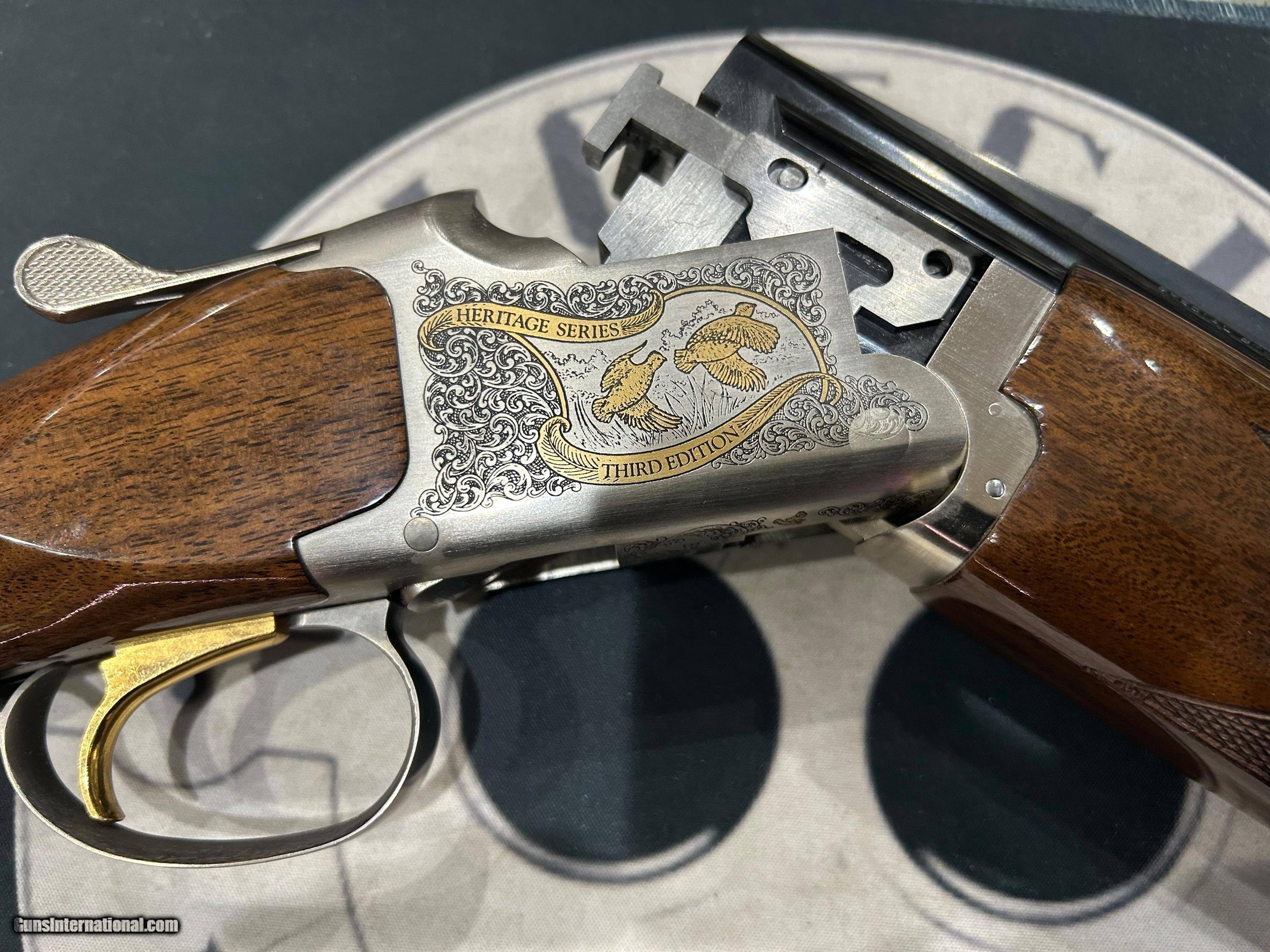 For sale: Browning Citori 16 gauge over/under shotgun from the limited Heritage Series (Third Edition). This beautiful example appears unfired and is in mint, like-new condition. It features rich walnut furniture with crisp checkering, a silver receiver with elegant engraving, and the classic Browning craftsmanship that defines this collectible series.