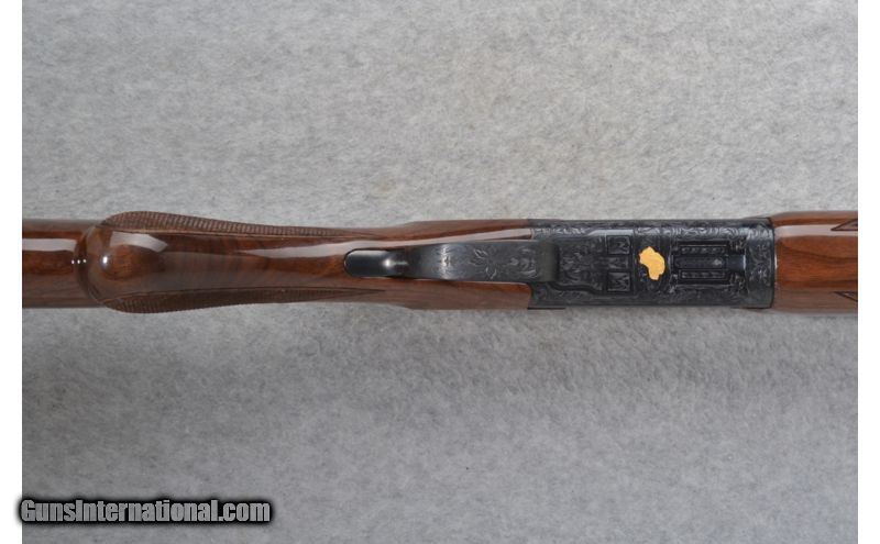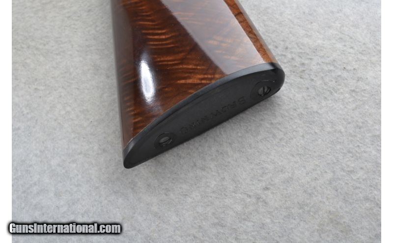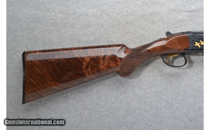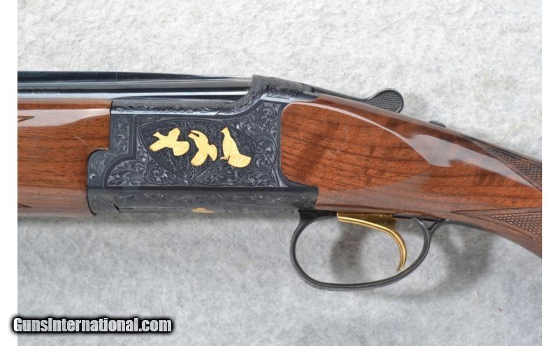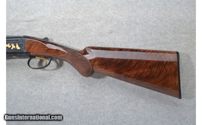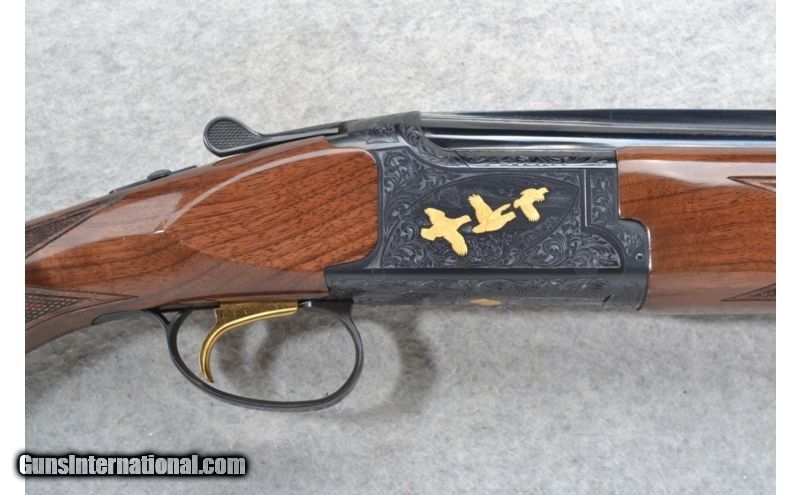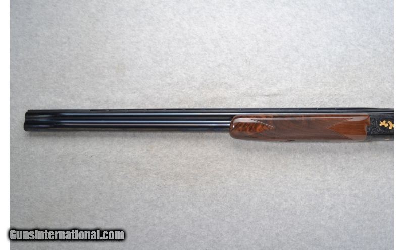 Description: Receiver, trigger guard and top tang are very nicely engraved in scroll. Left side has 3 gold grouse in flight outdoor scene. Right side has 3 gold quail in flight outdoor scene. The bottom has a gold hunting dog head. SOLD Manufacturer: Made in Japan / Miroku Caliber Info: 20 Ga. Chambers: 2 3/4 inch or 3 inch. Metal Condition: Excellent. Wood Condition: Excellent with a few minor handling marks. Bore Condition: Very clean, bright and shiny. Barrels: 28 inches with a knurled top ventilated rib. Triggers: Single golden. Stock: Diamond checkered grip deluxe high gloss walnut round knob. Stock Dimensions: LOP 14 1/4 inches. Fore End: Diamond checkered grip deluxe high gloss walnut. Butt Pad: Browning black plate. Weight: 6 lbs. 14 oz. Sights: Metal front bead. Chokes: Choke tubes are Full and Modified. Extras: Browning brown leather lined hard case. Two choke tools and manual. Item Location: Richfield, WI |