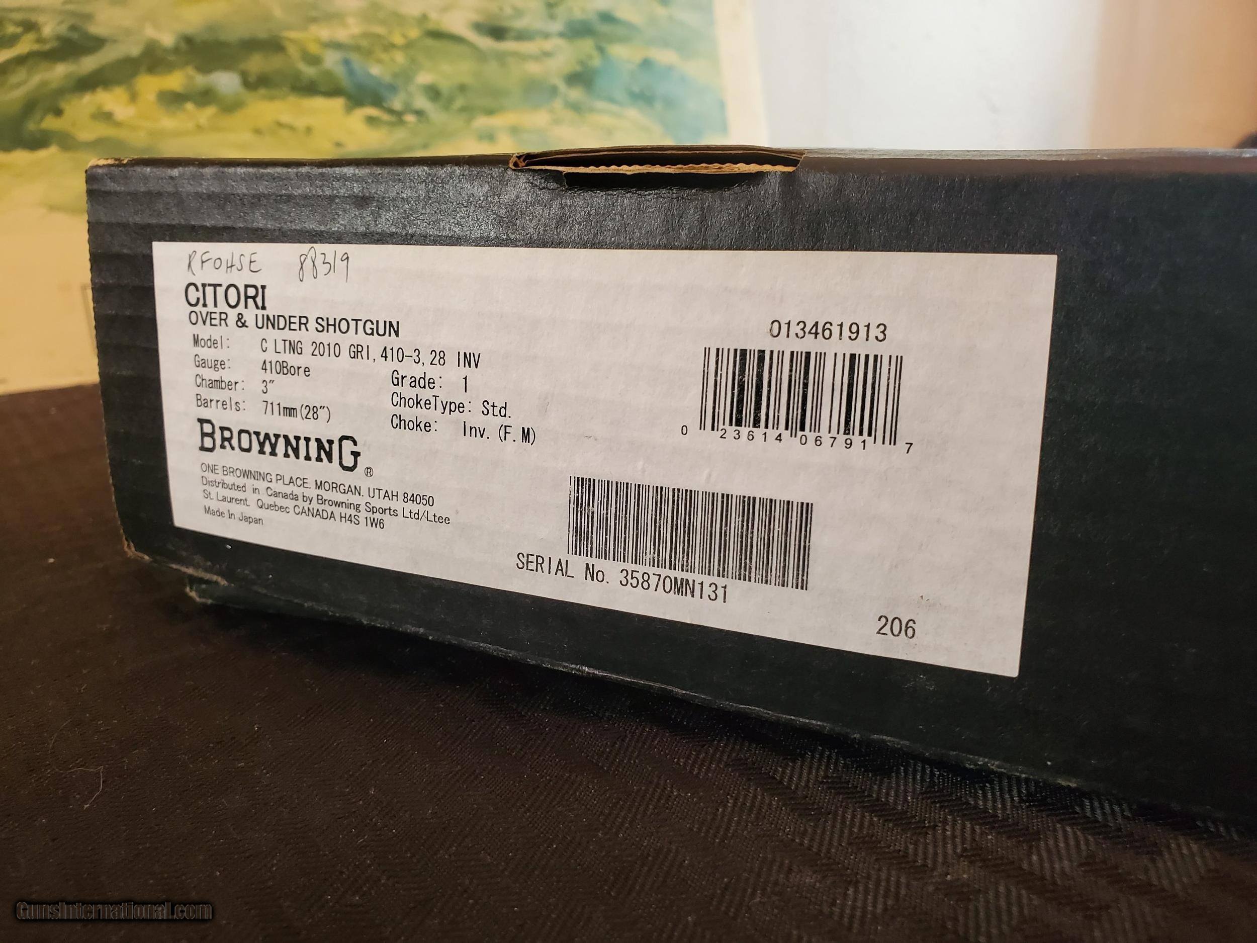 Description: Made in Japan 2009 28'' barrels Vent rib Invector choked 3'' chambers 14.25'' L.O.P. Lightning model Includes correct box, 2 choke tubes, and Browning hard case. 99% and all factory $80 for shipping SOLD Shotgun Gauge: .410 Gauge Condition: Excellent Metal Condition: Excellent Wood Condition: Excellent Bore Condition: Excellent |