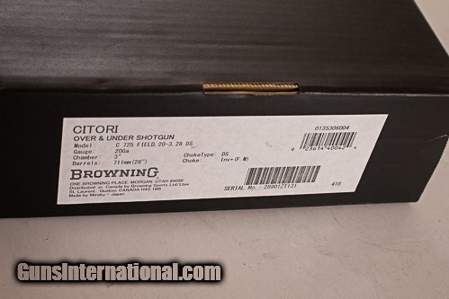 Description: MADE IN JAPAN IN 2016. BARREL IS 28'' WITH A VENT RIB AND INVECTOR DS CHOKES. NEW IN BOX. PLEASE ADD $50 FOR SHIPPING. SOLD Shotgun Gauge: 20 Gauge Manufacturer: BROWNING Model: CITORI Condition: NIB Metal Condition: NIB Wood Condition: NIB Bore Condition: NIB Action: O/U LOP: 14 1/4'' |
