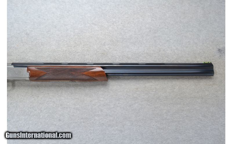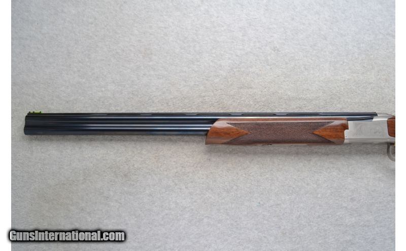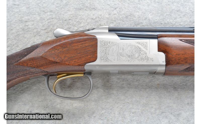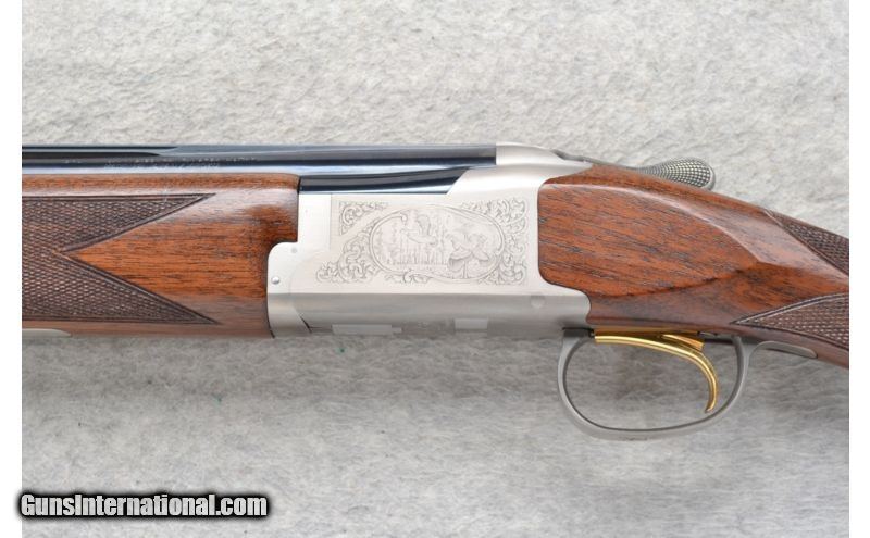 Description: This Browning Model Citori 725 Field is a 20 Ga. Over and Under shotgun. It has 26 inch barrels with ejectors and a top barrel ventilated rib. The HI-VIZ front sight has changeable tubes and it has a metal middle bead. With 3 inch chambers it has Invector-DS Choke and comes with 3 tubes. The stock is a checkered gip walnut pistol grip butt and forearm. The coin finish receiver is nicely engraved with scroll, hunting dog and grouse in flight outdoor scenes. SOLD Manufacturer: Made in Japan/Miroku Caliber Info: 20 Ga. Chambers: 2 3/4 inch or 3 inch Over/ Under with ejectors. Metal Condition: Excellent. Wood Condition: Excellent. Bore Condition: Bright and shiny. Barrels: 26 inch blued with a top barrel ventilated rib. Triggers: Single Golden. SST. Stock: Checkered walnut pistol grip. Stock Dimensions: LOP 14 1/4 inches. Fore End: Checkered grip walnut. Butt Pad: Inflex Technologies black rubber recoil pad. Weight: 6 lbs. 7 oz. Sights: Green bar high visibility front. Comes with 8 interchangeable tubes. Chokes: Invector-DS Choke. Comes with 2-IC and a Mod. Extras: Comes in a box with Owners Manual, chamber locks, 3 choke tubes, choke wrench and extra changeable sight tubes. Item Location: Richfield, WI |