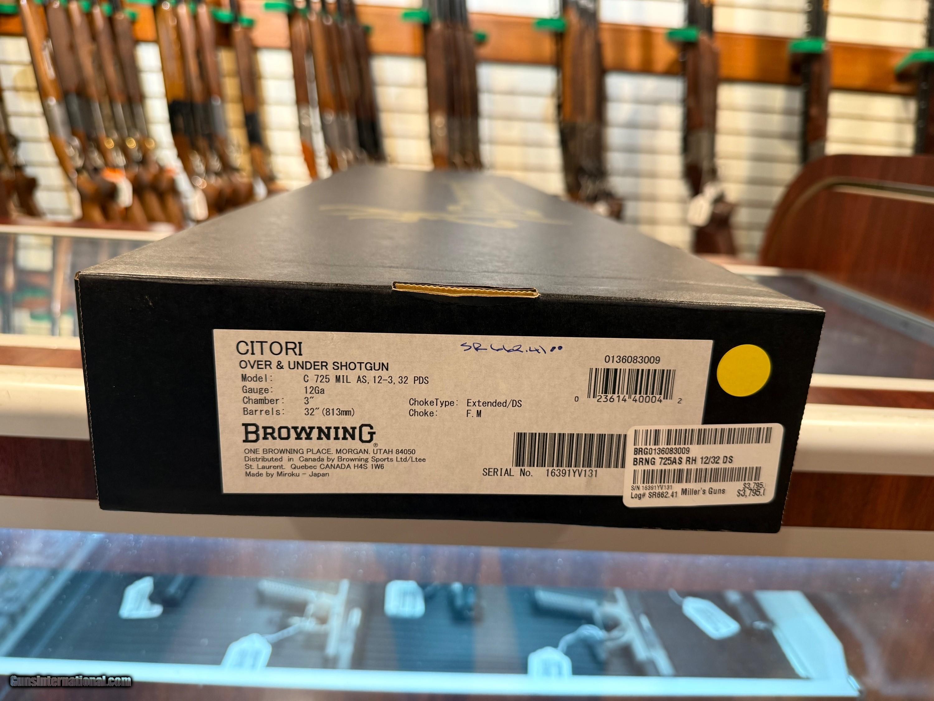 Description: Browning Citori 725 Millers Exclusive 12ga 32" barrels Shotgun Gauge: 12 Gauge Manufacturer: Browning Model: Citori 725 Miller Exclusive Serial Number: 16391YV131 Barrel Length: 32 Condition: NEW Price: $3,795.00 Contact Seller |
