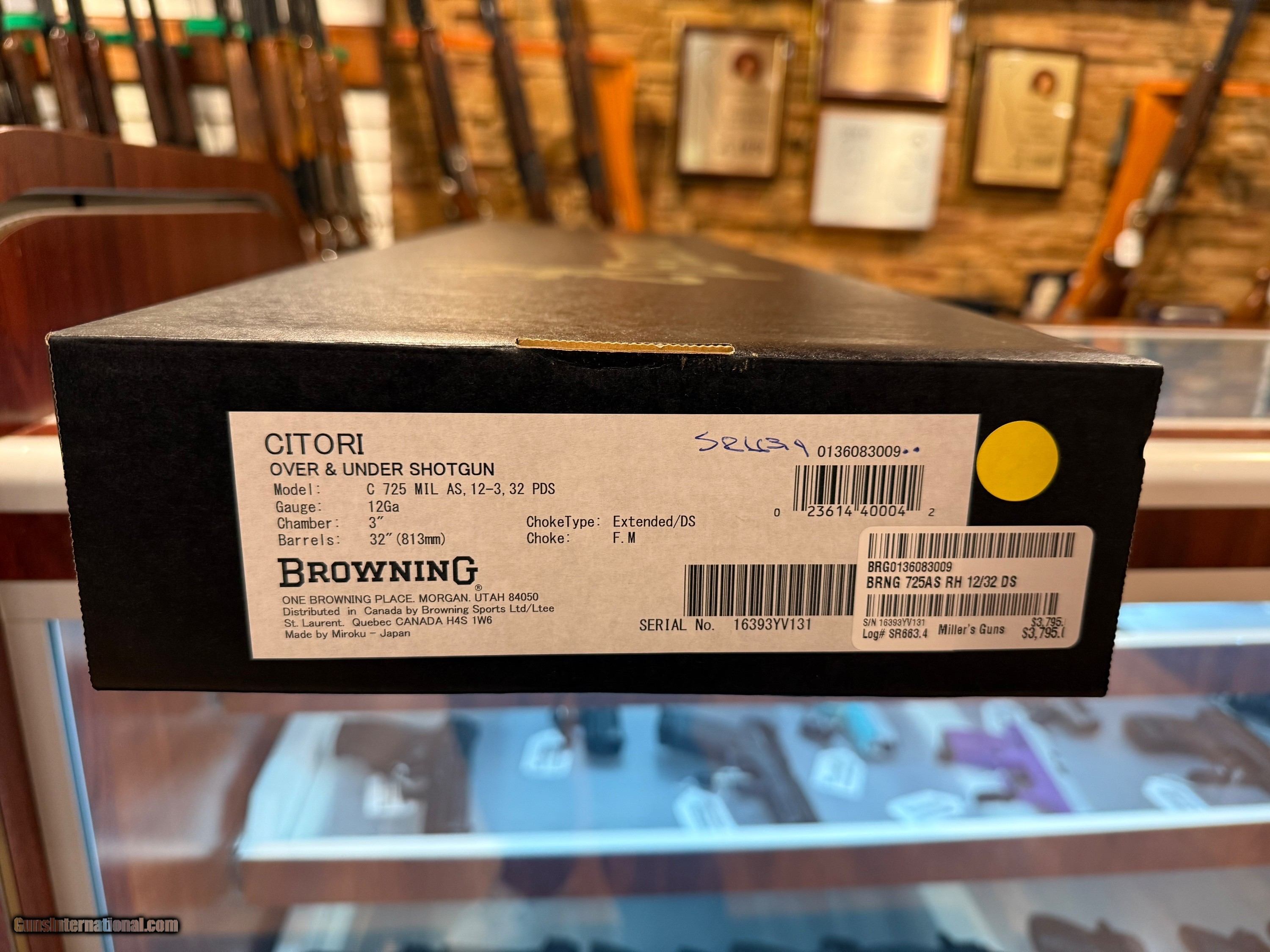 Description: Browning Citori 725 Millers Exclusive 12ga 32 Shotgun Gauge: 12 Gauge Manufacturer: Browning Model: Citori 725 Millers Exclusive Serial Number: 16393YV131 Barrel Length: 32 Condition: NEW Price: $3,795.00 Contact Seller |