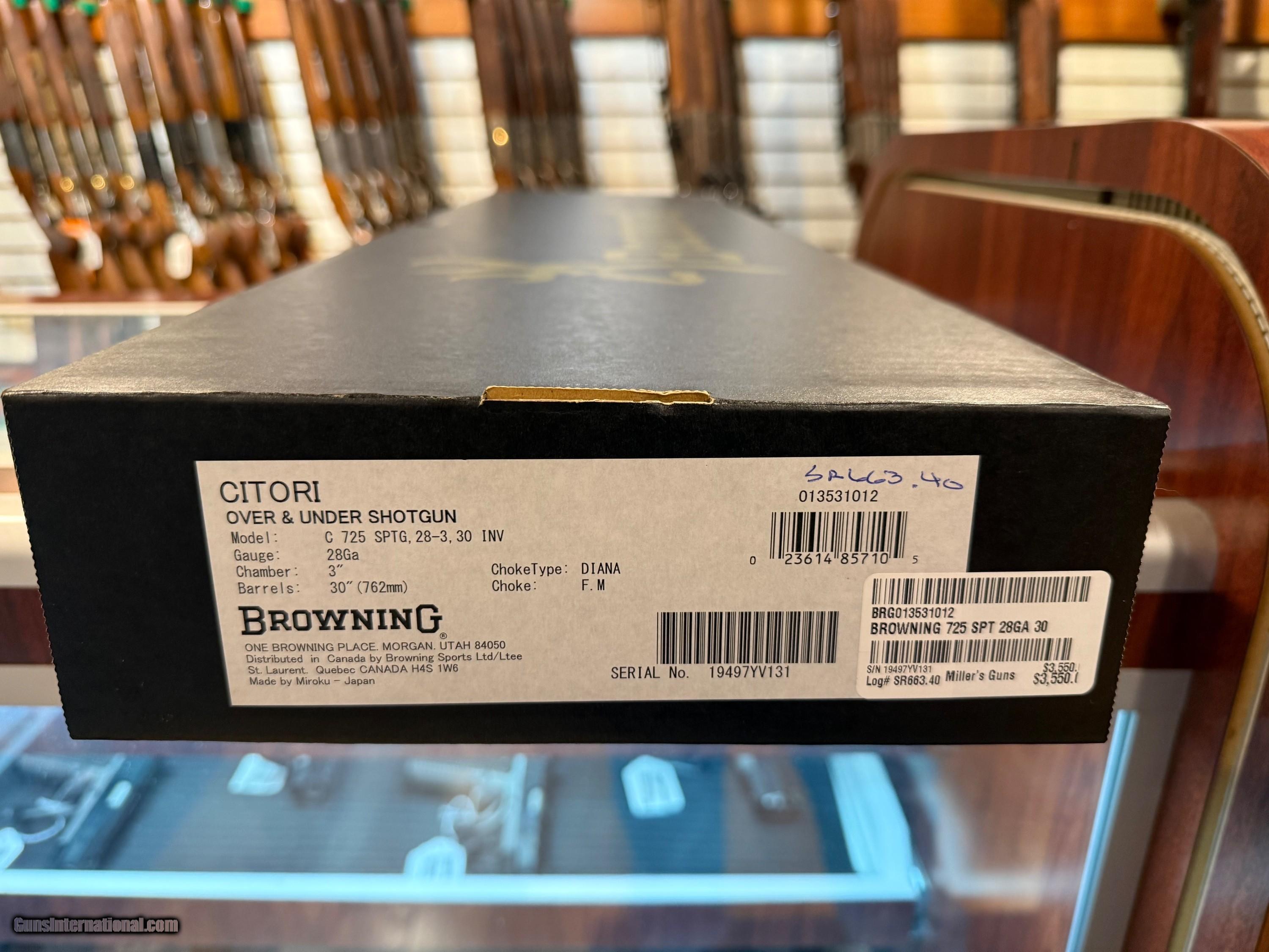 Description: Browning Citori 725 Sporting 28ga 30" 48" OAL 14 3/4" LOP 7lbs 4oz F,IM,M,IC,SK Shotgun Gauge: 28 Gauge Manufacturer: Browning Model: Citori 725 Sporting Serial Number: 19497YV131 Barrel Length: 30 Condition: NEW Price: $3,550.00 Contact Seller |