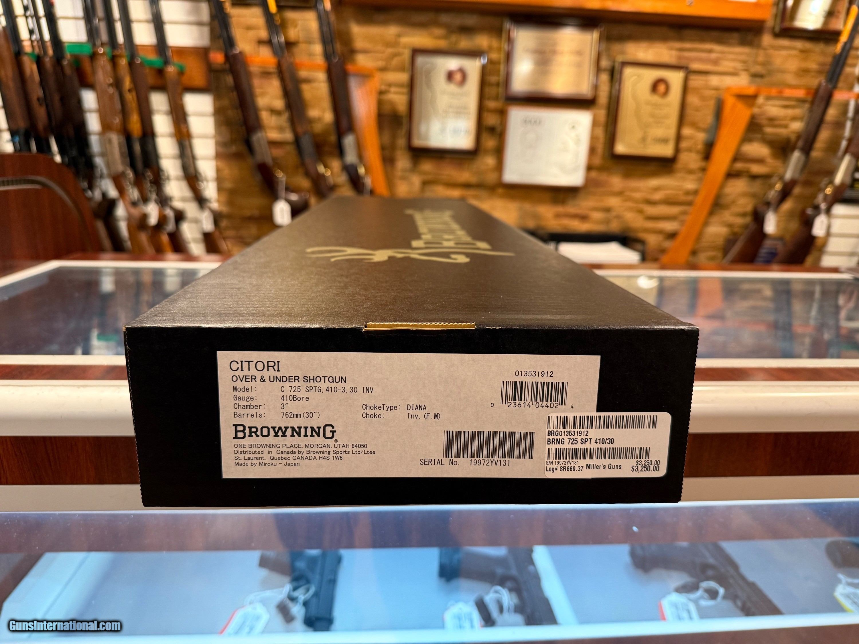 Description: Browning Citori 725 Sporting .410ga 30" barrels 3" chamber 48" OAL 14 3/4" LOP 7lbs 5oz F,IM,M,IC,SK chokes included Shotgun Gauge: .410 Gauge Manufacturer: Browning Model: Citori 725 Sporting Serial Number: 19972YV131 Barrel Length: 30 Condition: NEW Price: $3,250.00 Contact Seller |