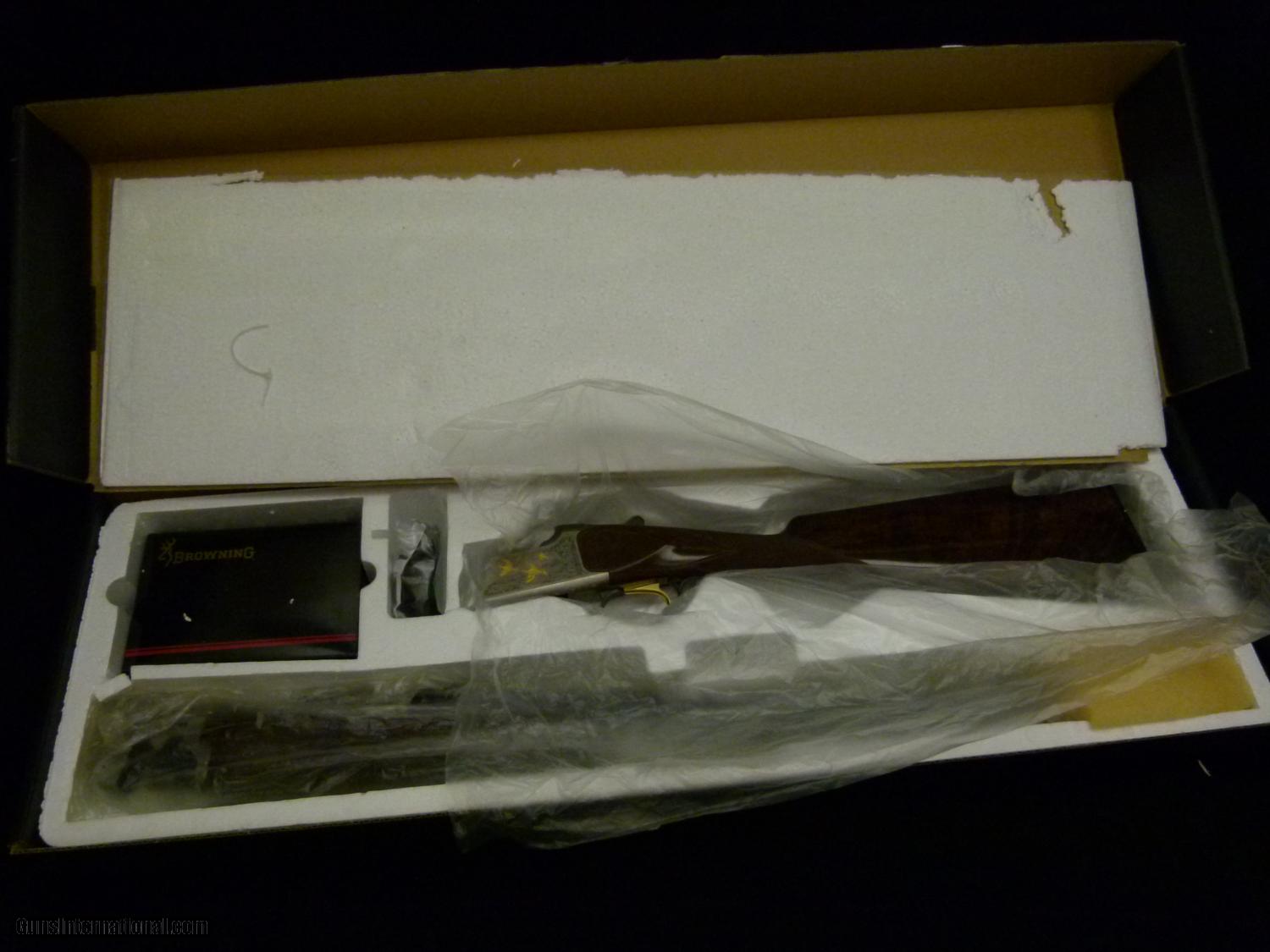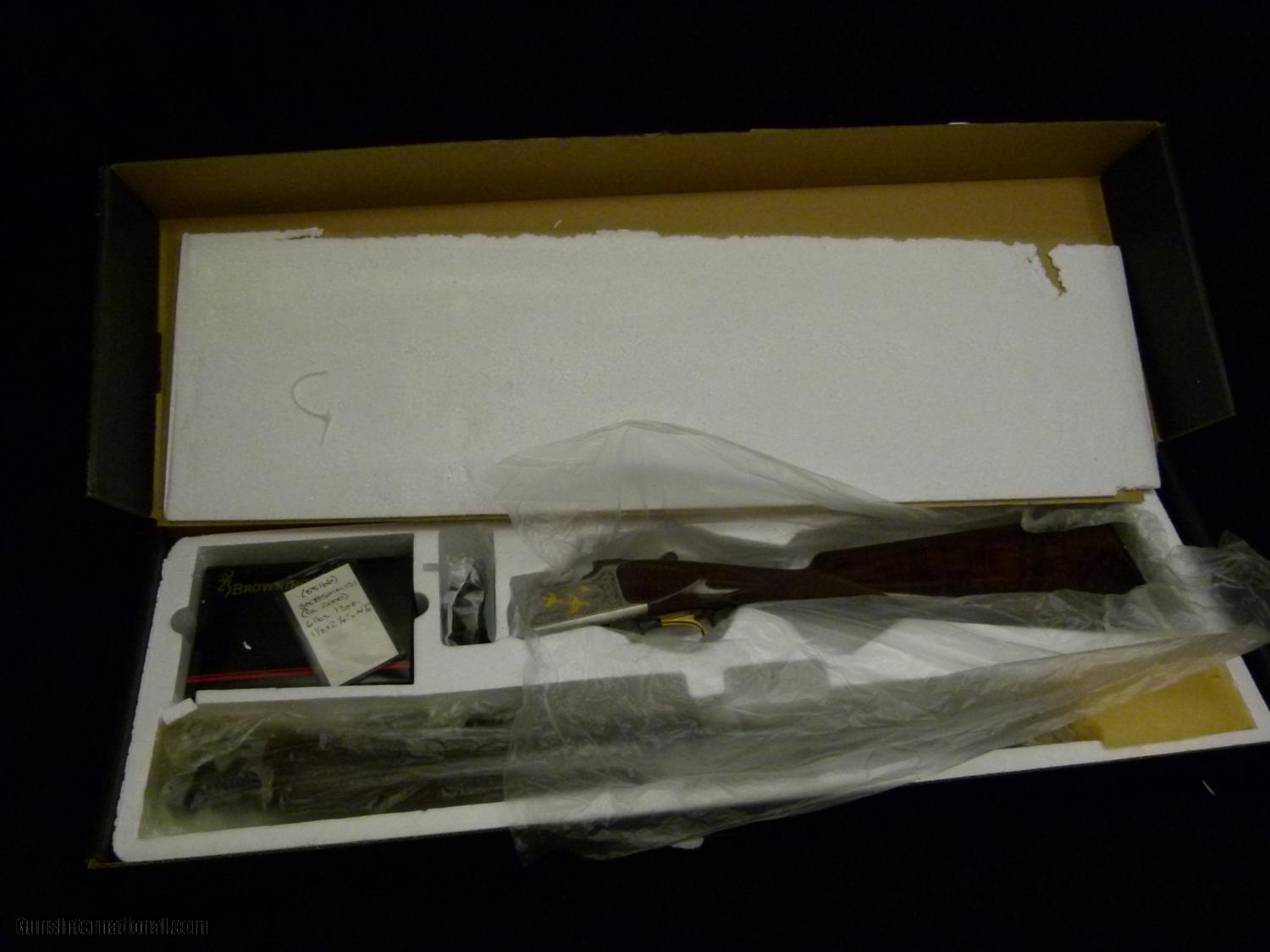 Description: Browning Citori BG6 Superlight .410" bore, 26" VR bbl., Invector chokes, 3" chambers, silver coined finish receiver w/ BG6 styled old inlays, nicely figured straight grip walnut w/ Schnabel forend. Gun is brand new in the box w/ full set of chokes and paperwork. Weighs: 6 lbs. 13 oz., dimensions are: 1 1/2" x 2 1/4" x 14 1/4" over factory Browning butt plate, made in 2000. SOLD Manufacturer: Browning Model: Citori BG6 Bore: .410 Chambers: 3 Ejectors: yes Condition: ANIB Metal Condition: 100% Wood Condition: 99% Bore Condition: excellent Barrels: 26 Barrel Type: o/u Action: boxlock Triggers: SST Stock Comb: 1 1/2" Stock Heel: 2 1/4 Butt Pad: factory hard rubber LOP: 14 1/4 Rib: VR Finish: coined Weight: 6 lbs. 13 oz. Sights: single bead Manufacture Date: 2000 Chokes: Invectors Engraving: BG6 |