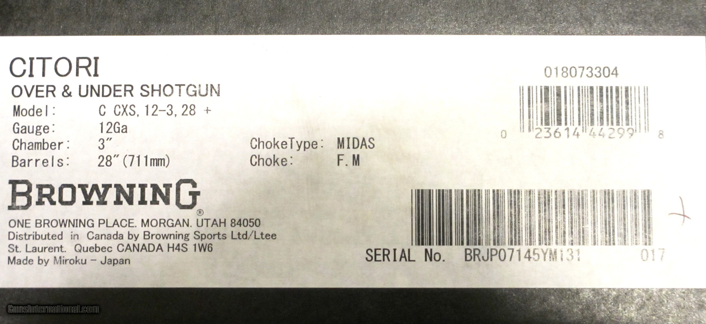 Description: Browning Citori CXS 12 Gauge Break Open 3" 2rd 28" Polished Blued Back-Bored Vent Rib Barrel, Polished Blued Steel Receiver, Fixed Gloss Black Walnut Wood Stock The Citori features an extreme level of craftsmanship that leads to the dependable function, impeccable looks, championship performance and respect. Its barrel selector allows the shooter to choose which barrel fires on the first pull of the single trigger and the second pull fires the remaining barrel. The automatic ejectors eject fired shells when the breech is opened and elevate unfired shells for easy removal. The Citori utilizes a transverse-mounted, full-width tapered locking bolt. The tapered locking bolt engages a full-width tapered recess in the rear barrel lugs. The hinge pin extends from one side of the receiver to the other for maximum strength. Includes Improved Cylinder, Full, & Modified choke tubes, T-wrench and original box. Call RW Outdoors at 406-842-5271 with any questions.