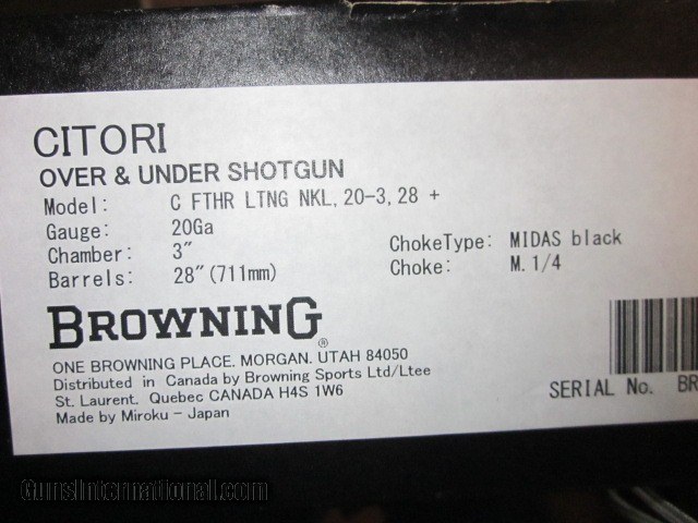 Description: Browning Citori Feather Lightning 20ga. 28" 2020 Shot show Limited production.Alloy engraved receiver, extended Midas choke tubes, ic, mod, full. ivory mid and front bead , grade III//IV wood,inflex pad.5 lbs 15oz. new in box. ADD 3% for credit cards, shipping is 35.00, 260 409 9828 SOLD |