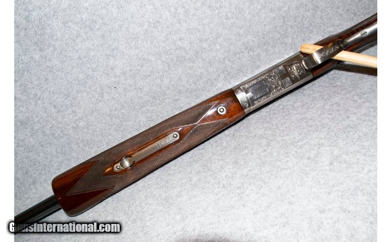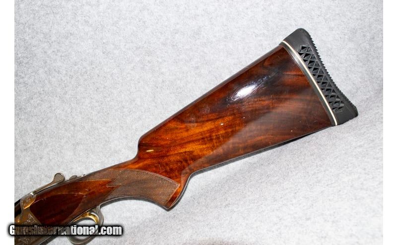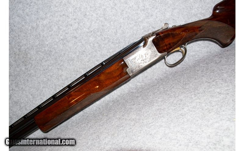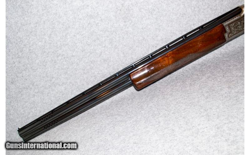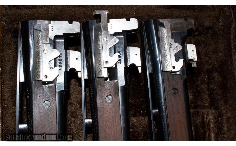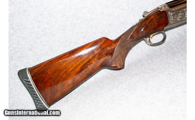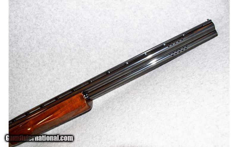 Description: Spectacular 4-barrel skeet gun with 410, 28, 20 and 12 bore barrels in very good to excellent condition. The 12 gauge barrel is ported. All barrels have vent ribs with a white center bead and a white bead sight and all barrel sets have bright and shinny bores with "special steel" marking on all barrels. All barrels are fixed choke marked sheet. This shotgun comes with the correct Browning case and the receiver is engraved with 7 ducks, and 2 pheasants and a single select gold trigger. The action on the receiver is in excellent condition, firing pins show little wear and the action opens and closes tight. Rear stock and forearm has upgraded wood, light handling marks, with 2 cut checkered panels at the wrist, a right hand palm swell and a soft rubber butt pad. The cut checkering on the stocks is sharp and crisp. The metal on the gun retains approximately 95% of the factory applied blue finish. A very desirable grade 3 Citori skeet gun that is extremely hard to find! Not to many of these around in this condition. 12 Gauge SOLD Chambers: 2 3/4 Inch Metal Condition: Very Good Wood Condition: Very Good Bore Condition: Very Good Barrels: 28 Inch Length On All Barrels Triggers: LOP 14.50 Stock Dimensions: RH STOCK (LIGHT HANDLING MARKS) Fore End: BEAVER TAIL FOREND Butt Pad: Rubber Weight: 8.5 lbs Chokes: Skeet Item Location: Lone Tree, CO |