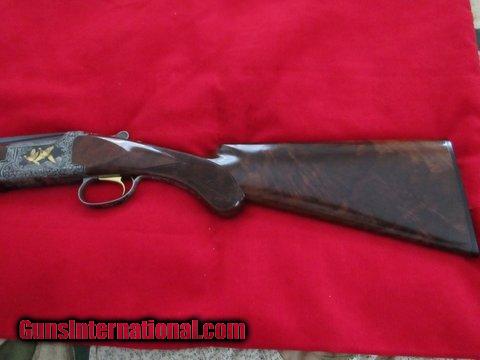 Description: Browning Citori Grade VI , 28 Gauge ,26 " barrels , M / IC , 2 3/4 " Chambers . Start with the Finest Grade VI money can buy , and than re-cut the entire pattern in Deep Relief to improve the Quality and Appearance of the gun . Deep Relief you can both see and feel .Engraving re-cut done by former Browning Master Engraver Ron Reimer . Full Fancy Feather Crotch American Black Walnut Stock and Forearm . 1991 gun like New in original box . ( 1 1/2 " x 2 3/8 " x 14 1/4 " ) SOLD |