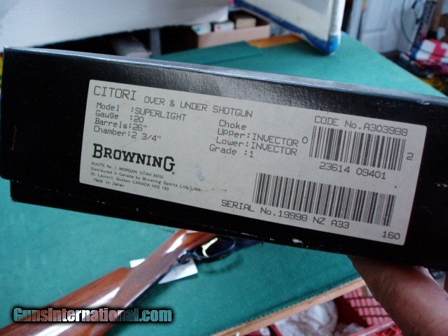Description: BROWNING CITORI SUPER LIGHT SCREW CHOKES.PRODUCTION STARTED 1983 NEW.THIS 20 GAUGE IS IN REAL NICE CONDITION.26" BARRELS.A FEW MARKS,NOTHING SERIOUS,TIGHT WITH MIRROR BORES.THREE CHOKES,ALL PAPERWORK,BOX ,SEE PICS FOR CLOSE UP OF MARKS.THE SMALL NICKS ON THE RIB LOOK WORSE THAN THEY ARE. OVERALL THIS IS A REAL NICE 20..OPEN TO OFFERS PART TRADES ON ALL MY LISTINGS ..T.Y. SOLD |