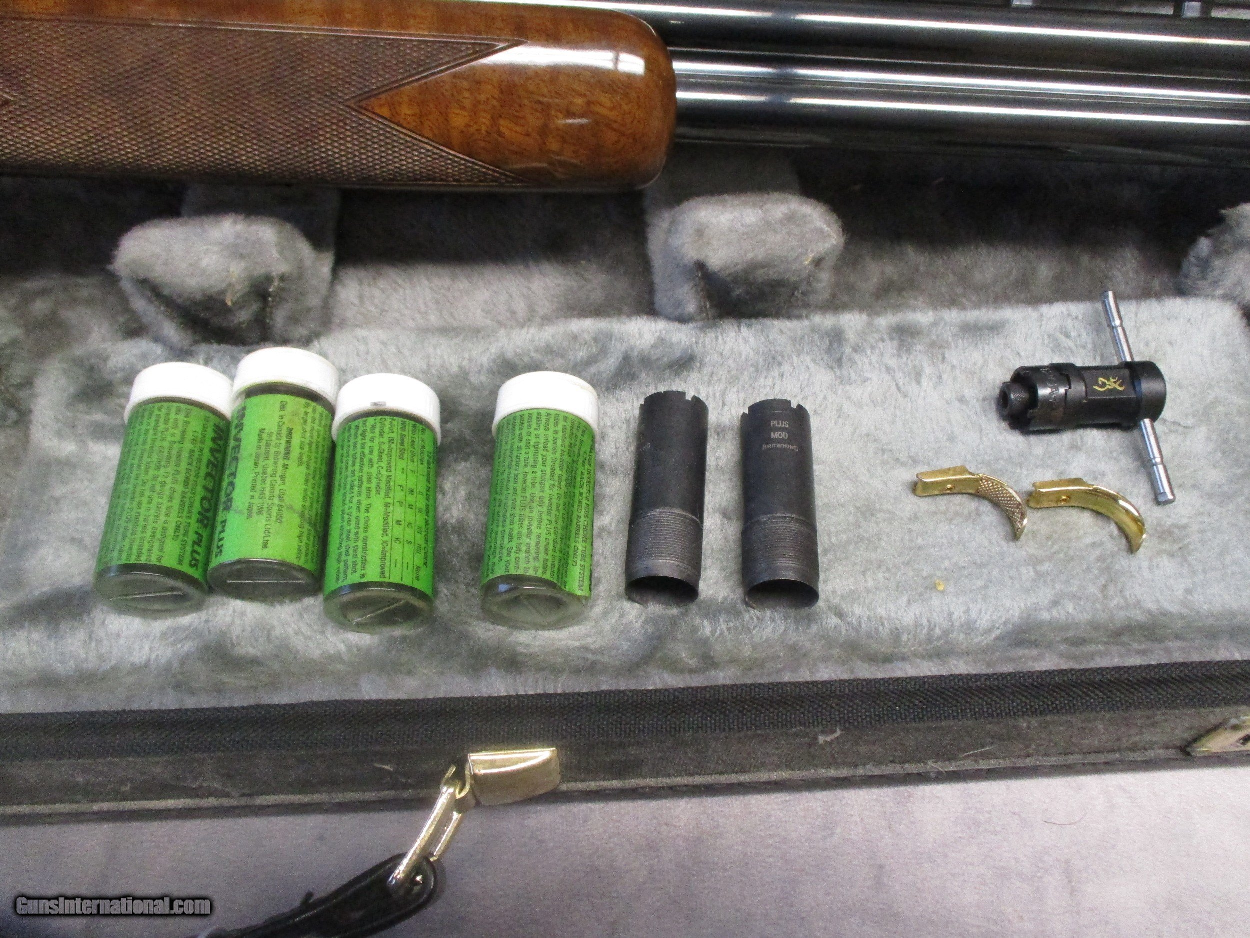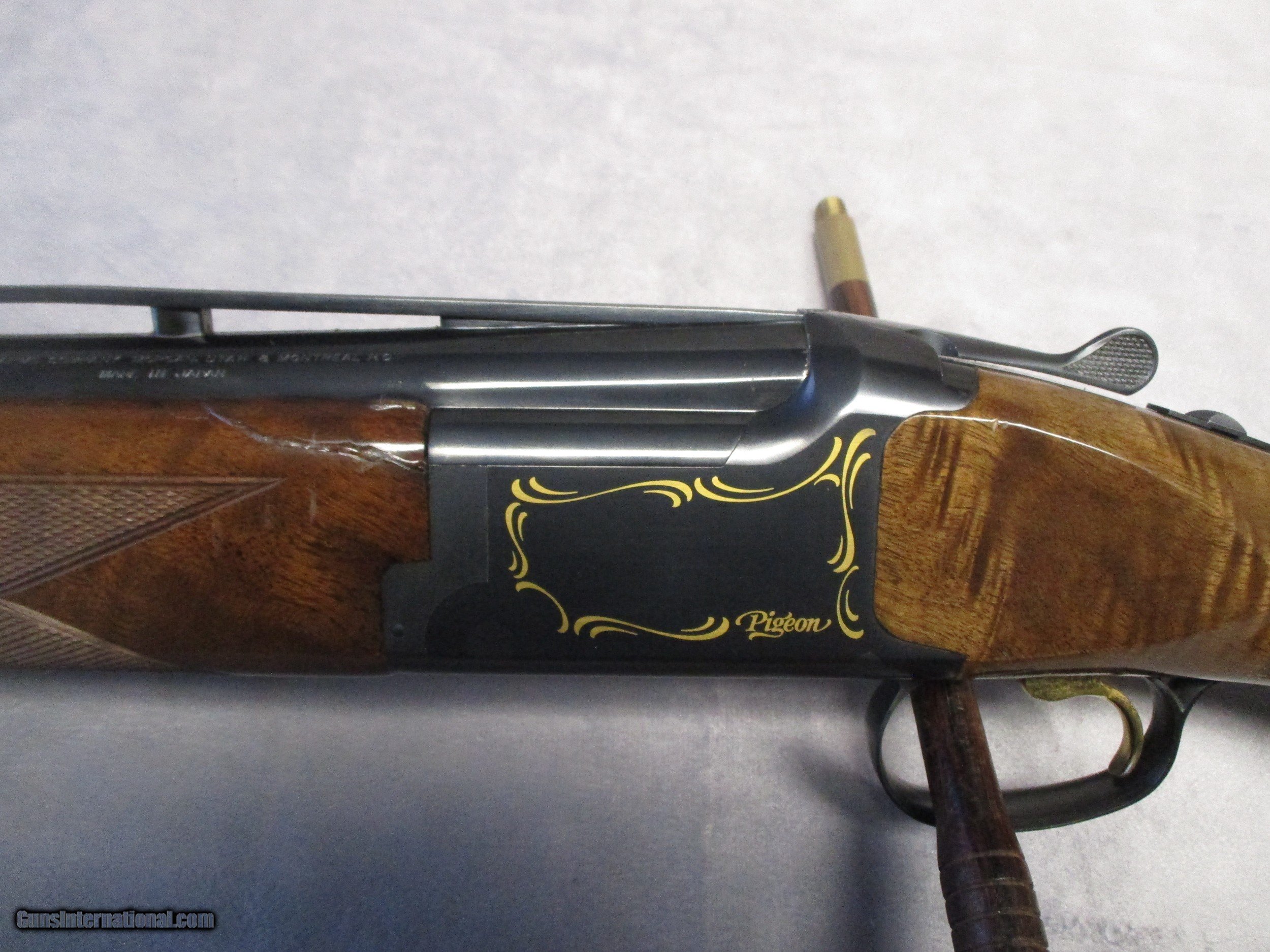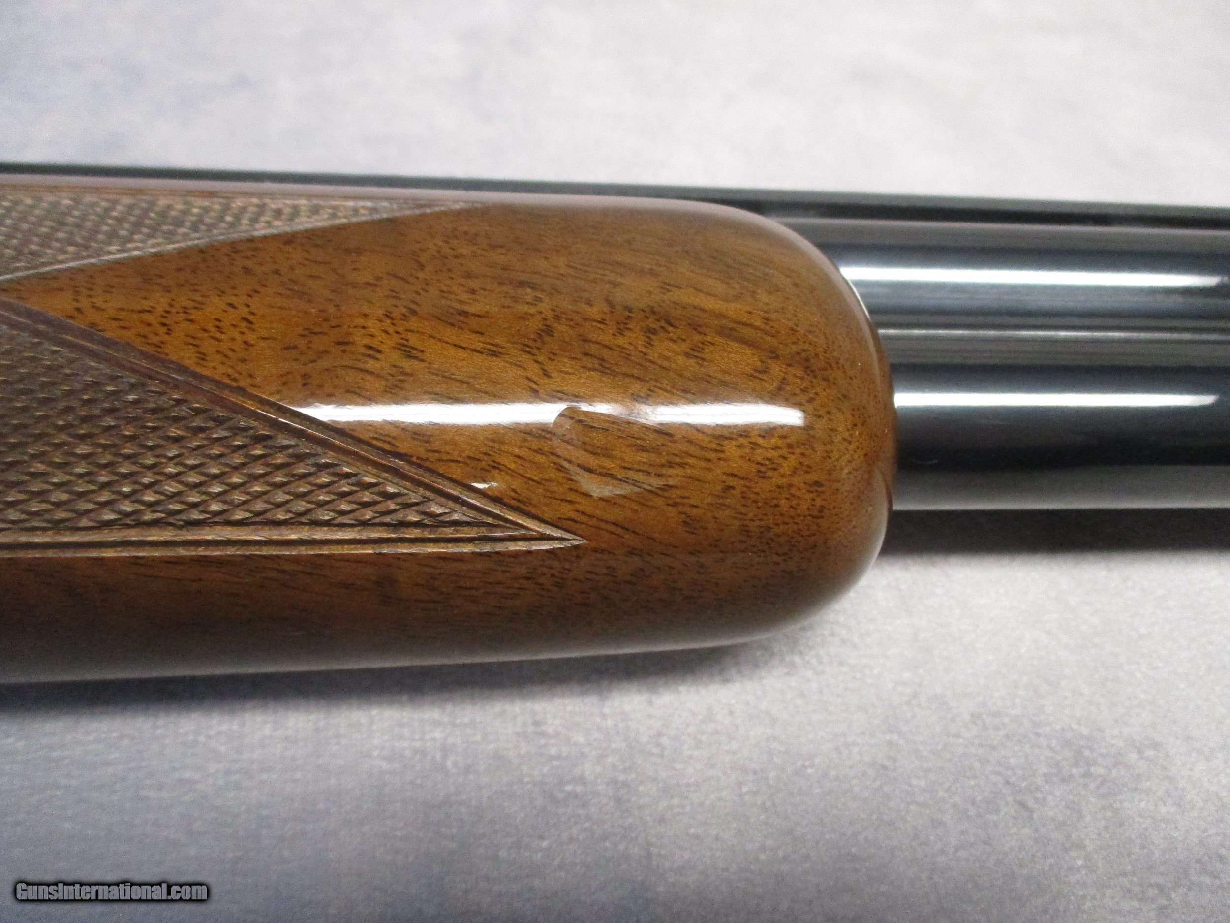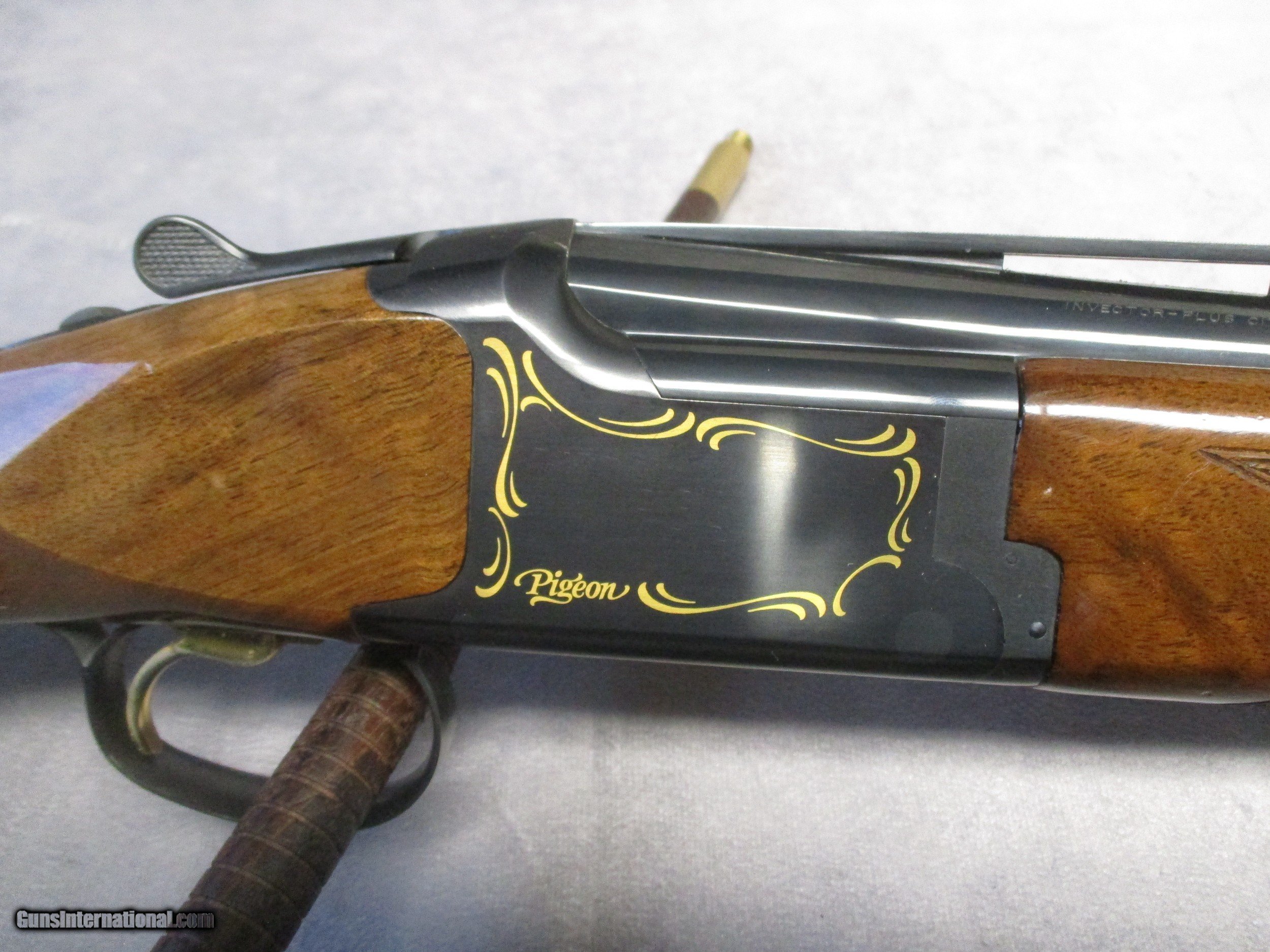 Description: According to the serial number, this example was built in 1992. The “W53” in the serial number, according to the Browning , indicates this is a “Lightning” model; however it does not say this anywhere on the Citori. It features a walnut fore end and pistol grip stock with a high gloss finish. The barrels are 28 inches long and feature a ventilated, high post rib. Both are ported. The receiver features gold line accents. Unlike most high-grade shotguns, this appears to have been used for its intended purpose to a limited extent rather than spending most of its time in a safe. The walnut fore end exhibits most of the wear. One the left side a chip of wood broke off and then was glued back on. The repair is still visible. One the right side there are two gouges in the wood near the top, and a small dent on the lower side. The latter could probably be steamed out. The stock has some scratches on the left side but is good shape on the right. The Citori retains virtually all of the original bluing. The only noticeable spot is underneath the safety. There is light rust present on the fore end takedown latch. The trigger has lost some of the gold coloring to it. There are two spare gold triggers that come with the shotgun. The bore is in extremely good condition with no rust or pitting, though the chokes exhibit some fouling. The Pigeon Grade uses Invector Plus chokes and is currently equipped with an extended Modified choke in the over barrel and an extended Improved Modified choke in the under-barrel. There are six spare choke tubes in the case, all of which are standard length. These include 3 Full Chokes, 2 Skeets, and 1 Modified. The case is a little worn but is in good shape. SOLD Shotgun Gauge: 12 Gauge Manufacturer: Browning Arms Co. Model: Citori Sporting Clays Pigeon Grade Serial Number: 32648NYW53 Bore: Smoothbore Chambers: 3.0 and 2.75 inches (76 and 70mm) Ejectors: Auto-ejection Condition: Good to Excellent Barrels: O/U Barrel Type: Ported Action: Box-lock Triggers: SST Stock: Walnut, pistol grip Stock Comb: 1.5 inches (38 mm) Stock Heel: 2.0 inches (51 mm) Fore End: Walnut Butt Pad: Rubber pad LOP: 14.25 inches (362mm) Rib: Vent, high post, 0.375 inch (9.5 mm) wide Finish: Blued Sights: White, round bead, mid and front Chokes: Invector-Plus type, O: Modified Extended, U: Improved Modified Extended, spares are standard length and include 3 Full Chokes, 1 Mod., and 2 Skeet Engraving: Gold line receiver accents Extras: See description Case: Browning hard case |