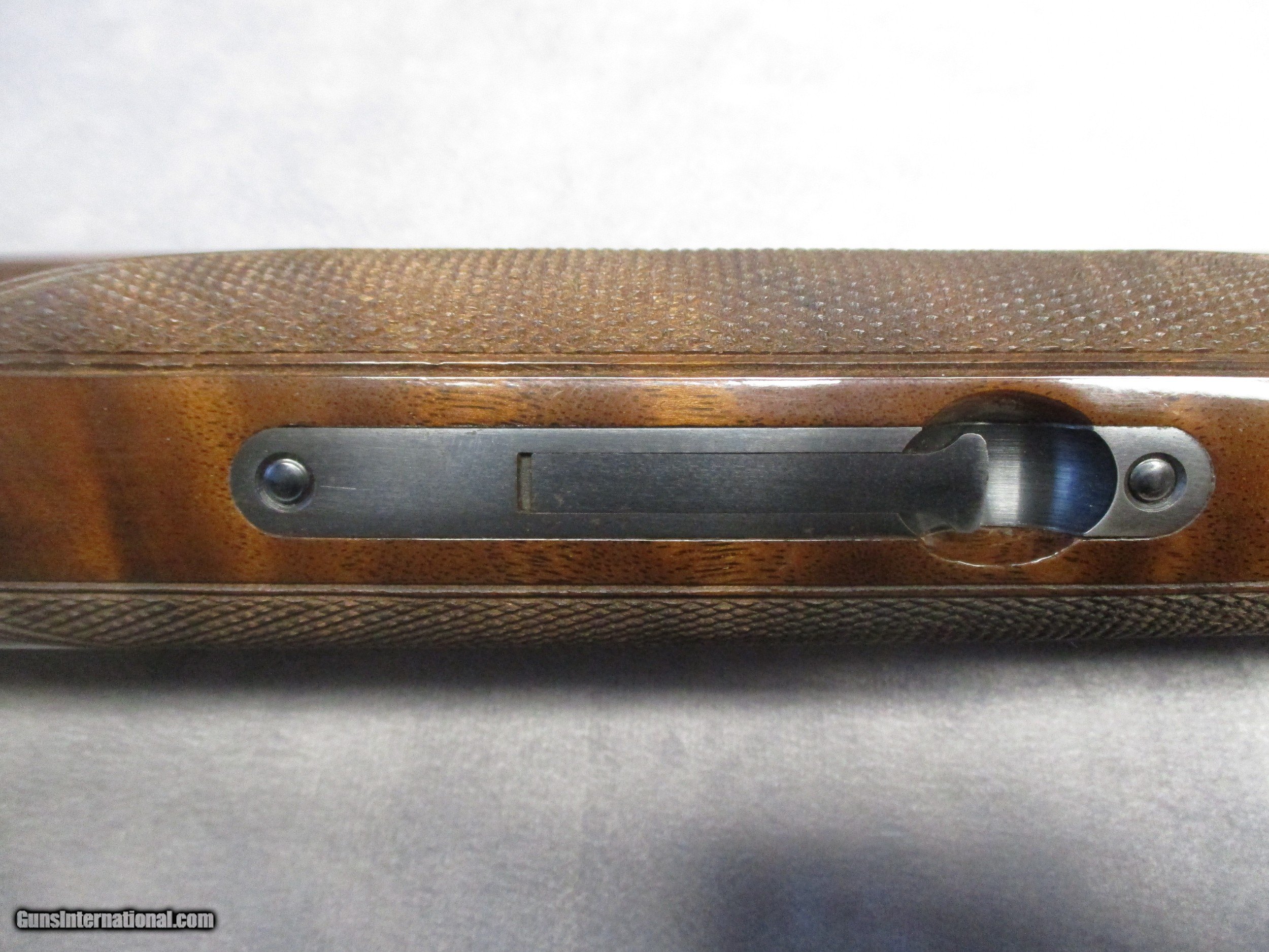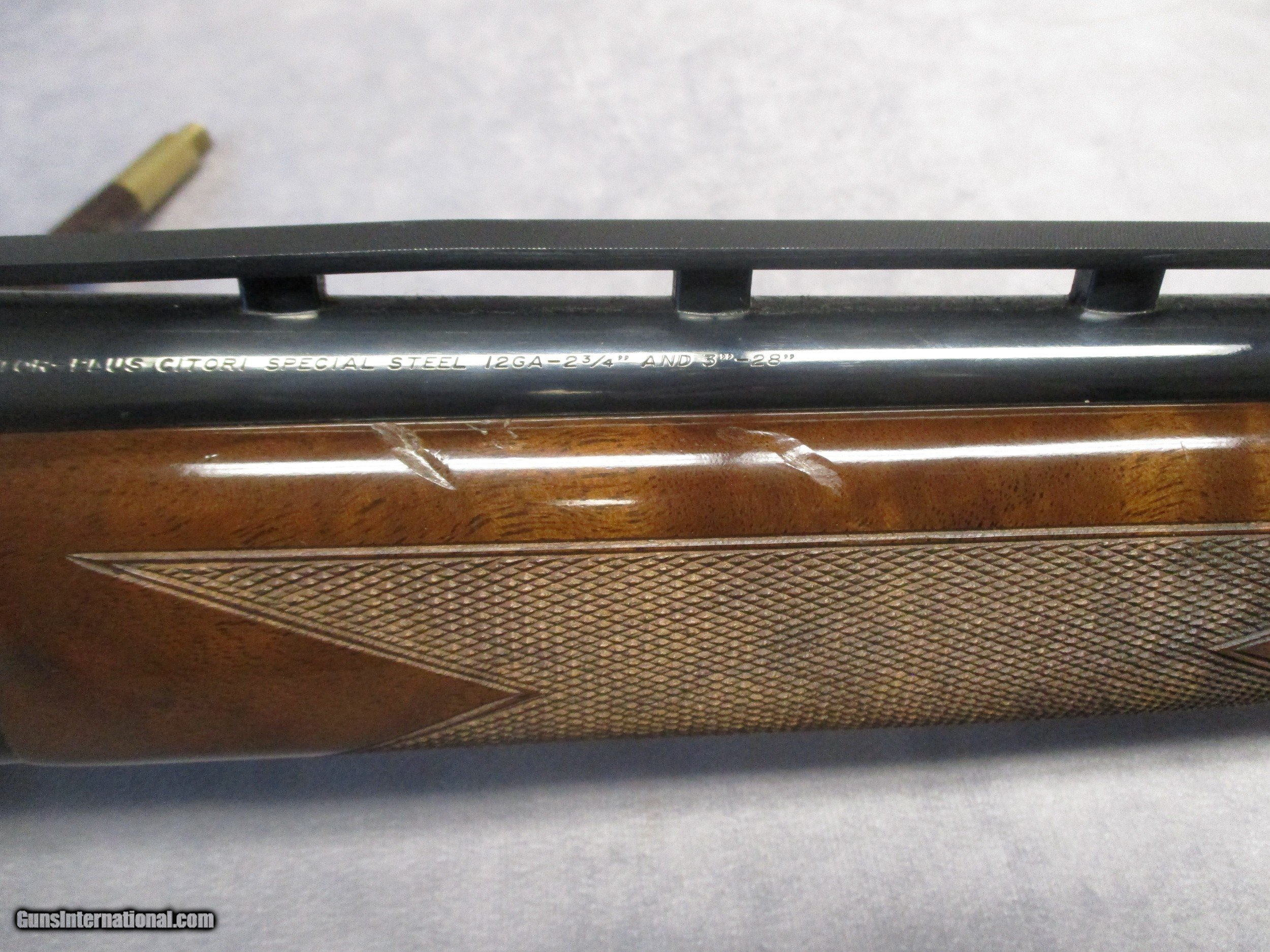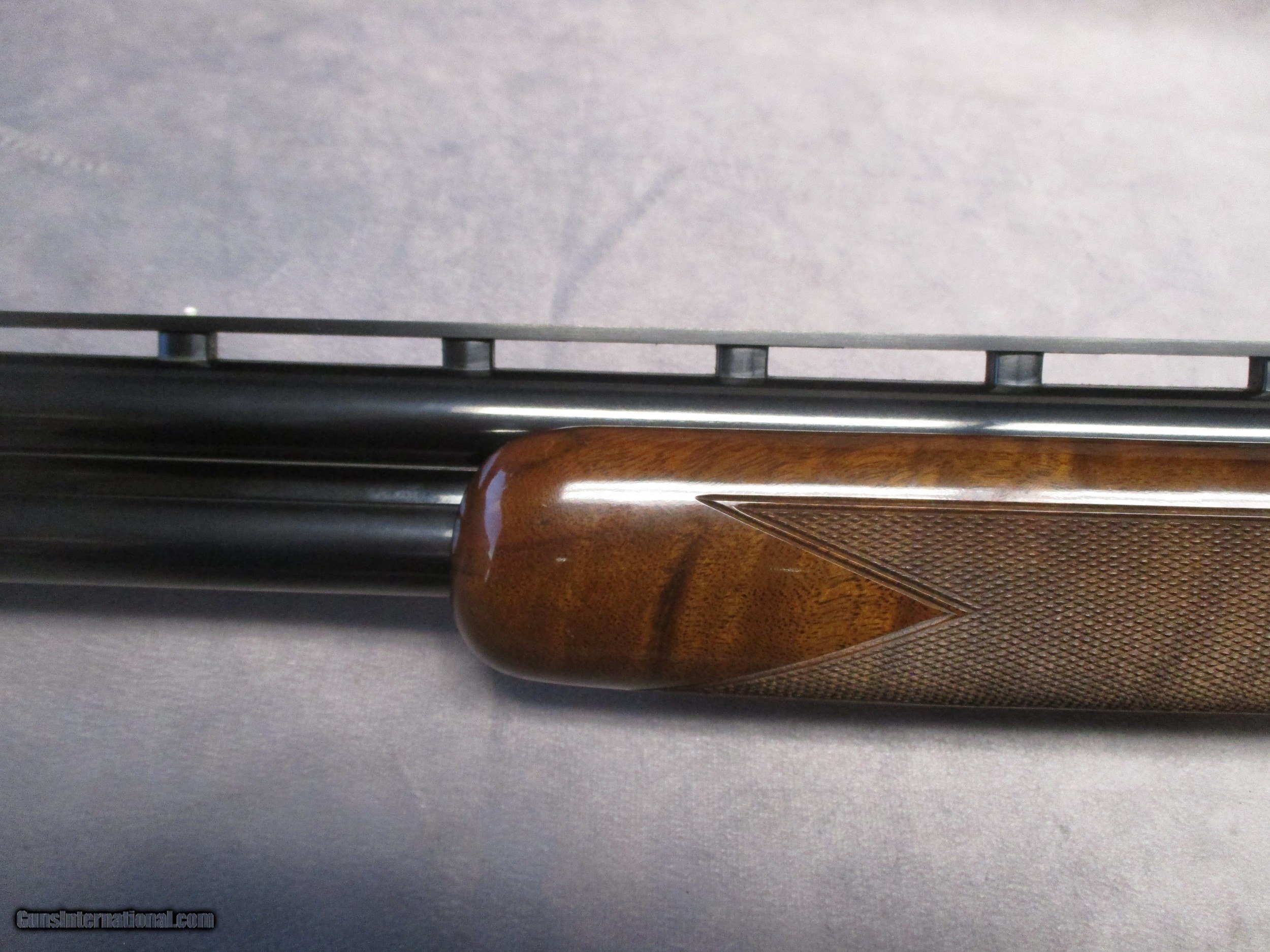 Description: According to the serial number, this example was built in 1992. The “W53” in the serial number, according to the Browning , indicates this is a “Lightning” model; however it does not say this anywhere on the Citori. It features a walnut fore end and pistol grip stock with a high gloss finish. The barrels are 28 inches long and feature a ventilated, high post rib. Both are ported. The receiver features gold line accents. Unlike most high-grade shotguns, this appears to have been used for its intended purpose to a limited extent rather than spending most of its time in a safe. The walnut fore end exhibits most of the wear. One the left side a chip of wood broke off and then was glued back on. The repair is still visible. One the right side there are two gouges in the wood near the top, and a small dent on the lower side. The latter could probably be steamed out. The stock has some scratches on the left side but is good shape on the right. The Citori retains virtually all of the original bluing. The only noticeable spot is underneath the safety. There is light rust present on the fore end takedown latch. The trigger has lost some of the gold coloring to it. There are two spare gold triggers that come with the shotgun. The bore is in extremely good condition with no rust or pitting, though the chokes exhibit some fouling. The Pigeon Grade uses Invector Plus chokes and is currently equipped with an extended Modified choke in the over barrel and an extended Improved Modified choke in the under-barrel. There are six spare choke tubes in the case, all of which are standard length. These include 3 Full Chokes, 2 Skeets, and 1 Modified. The case is a little worn but is in good shape. SOLD Shotgun Gauge: 12 Gauge Manufacturer: Browning Arms Co. Model: Citori Sporting Clays Pigeon Grade Serial Number: 32648NYW53 Bore: Smoothbore Chambers: 3.0 and 2.75 inches (76 and 70mm) Ejectors: Auto-ejection Condition: Good to Excellent Barrels: O/U Barrel Type: Ported Action: Box-lock Triggers: SST Stock: Walnut, pistol grip Stock Comb: 1.5 inches (38 mm) Stock Heel: 2.0 inches (51 mm) Fore End: Walnut Butt Pad: Rubber pad LOP: 14.25 inches (362mm) Rib: Vent, high post, 0.375 inch (9.5 mm) wide Finish: Blued Sights: White, round bead, mid and front Chokes: Invector-Plus type, O: Modified Extended, U: Improved Modified Extended, spares are standard length and include 3 Full Chokes, 1 Mod., and 2 Skeet Engraving: Gold line receiver accents Extras: See description Case: Browning hard case |