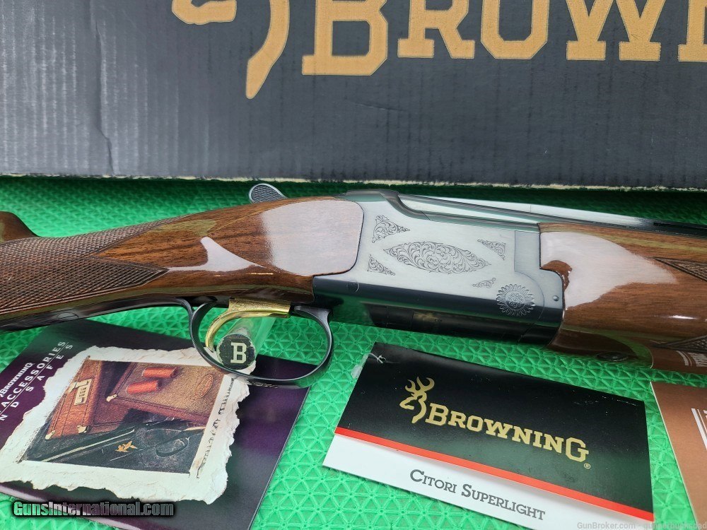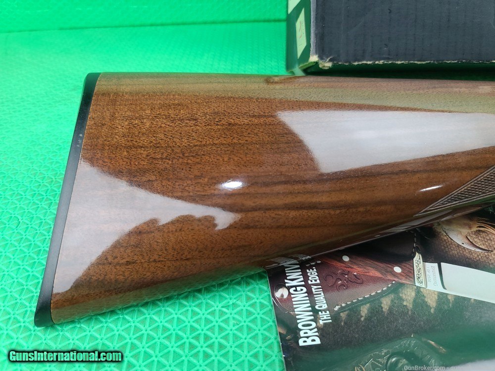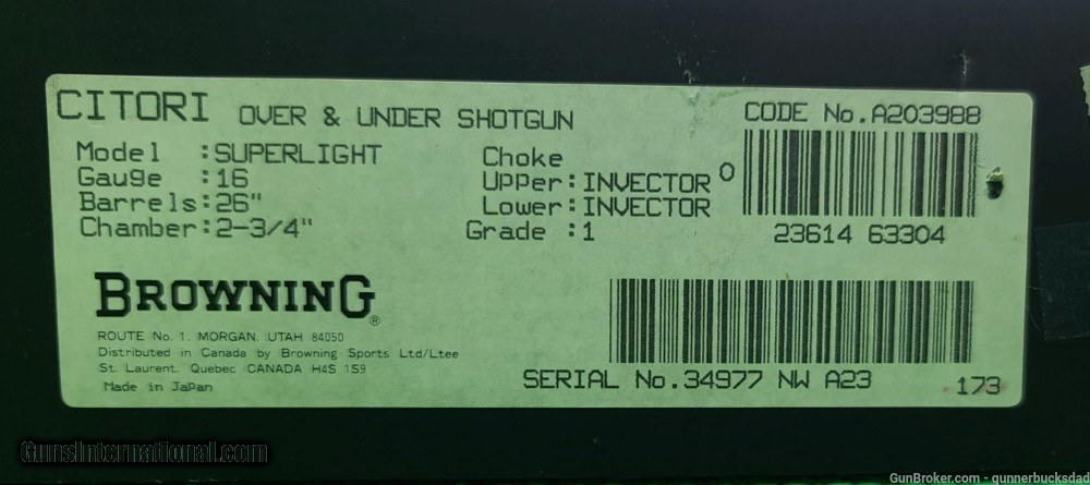 Description: SALE PENDING...From my personal collection, I'm thrilled to offer a beautiful Over and Under shotgun. The Browning Citori SUPERLIGHT in desirable 16 Gauge with difficult to find all steel receiver...as many Browning O/U today have alloy receivers. Born in 1994, it has the factory blue finish, 26 inch Ventilated Rib Invector barrels, 3 Invector chokes including modified, improved cylinder and full, glossy checkered walnut stock and forearm, straight English stock and Schnabel forend. It comes in the original factory box with manual. Condition is superb and appears unused. Weight 6lb, 10oz. $65 shipping, insurance. No sales to New York City of other locations prohibited by law. No returns. SOLD Shotgun Gauge: 16 Gauge Manufacturer: Browning Model: Citori Superlight Condition: Like new in Box |