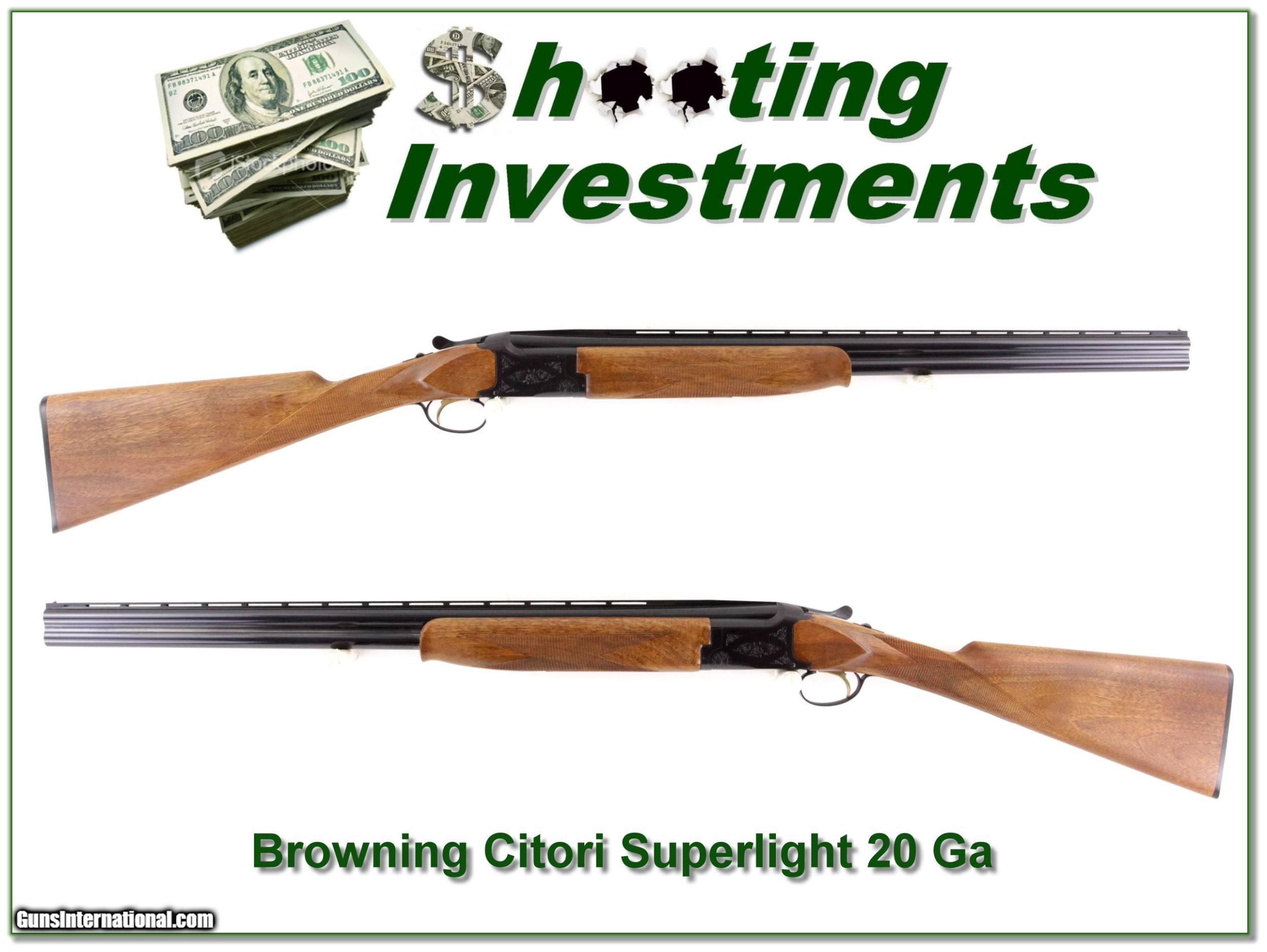 Description: Collectors, shooters and hunters, this is a like new Browning Citori Superlight 20 Gauge. It has beautiful oil finished wood with English stock. It looks unfired. The barrels are 26in choked IC and Mod. I find one small mark on the stock and it comes with factory manual. It will make a classic field gun or find addition to your collection. Shipping with insurance is $39. Please email me with any questions or larger pictures. (Consign your quality firearms with Shooting Investments for only 12%! Let me know if you have any you would like to sell!) 19-1502 Payment: Payment is by Money Order, Cashiers Check or Personal Check. I can now also accept Credit Cards (MasterCard, Visa, Discover & American Express) with a 3% convenience fee. PayPal can be used for some items but never for firearms. Shipping: The shipping charge will be listed in each description. It is $39 for most firearms. Some heavy guns or those insured for over $2000 will be higher. Shipments to Alaska and Hawaii are higher because air shipment is required. Most firearms are shipped on Tuesday and Thursday and usually in 5 days of receipt of payment. We package all shipments carefully and insure them. Optics are shipped Priority Mail and most other non-firearm shipments are shipped First Class. Returns: Our return policy is simple. If for any reason you are not pleased with your purchase, you may return your item for a full refund of purchase price. Ammunition cannot be returned. It is important to us that you are happy. Guns cannot be fired or dissembled before returning them and they must be returned in the same condition as received. Notification of a return must occur with-in 3 days of receipt at your dealer. Shipping, convenience and dealer fees are not refundable and are the responsibility of the buyer. Lay-a-way: If needed, we offer a 60 day lay-a-way option on most firearms. It is 1/3 now, 1/3 in 30 days and 1/3 in 60 days. Lay-a-way firearm sales are final and if not completed the first payment cannot be returned. Consigning your firearms with Shooting Investments: We will help you get top dollar for your firearms. While most local guns shops charge 20% or more, our fee is only 12% with a minimum of $75. At your local gun shop it might take months to sell. Selling on-line provides instant access to thousands of interested buyers. You won’t find any other on-line dealer willing to sell your firearms for only 12% or listing every gun on 3 separate s. Selling through an House typically costs the seller 15% and the buyer an addition 15% (so 30%) and you have to wait several months to sell and longer to receive funds. If properly priced, we will sell your firearms in a few weeks. Send us an email or give us a call and we’ll explain how easy it is for you to get top dollar. Trading: Trading for use is really just buying your gun to re-sell. If you have a gun you want to trade, please email a picture and we will let you know what we can give or it. You will always get more if we sell it for you on consignment. Help for California Buyers: We are happy to ship to California. It is the buyer’s responsibility to make sure any item you buy is legal in your state. We are also happy to help with your purchase of a firearm from someone other than us. If you see a gun you would like to buy but the seller can’t or won’t ship to California they can ship to use and we’ll then ship it to your California dealer. The cost for this service is only $30 + shipping. Let us know if we can help! SOLD |
